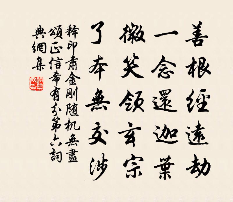 詩詞名句歷史字典書法欣賞書法字典國語詞典說文解字康熙字典古漢語字典標 題 作 者 詩 句 金剛隨機無盡頌正信希有分第六作者:釋印肅 朝代:宋代原文善根經遠劫,一念還迦葉。微笑領玄宗,了本無交涉。詩詞問答問:《金剛隨機無盡頌正信希有分第六》的作者是誰?答:釋印肅問:該詩寫於哪個朝代?答:宋代書法欣賞金剛隨機無盡頌正信希有分第六書法作品詩詞推薦瑞鶴仙王吉昌〔元代〕衷情崇淡薄。盪浮萍、縱跡逐波淪落。聰明總不作。念掀天富貴,夢驚為錯。猛揮愛索。訪餘裕、真風綽綽。穀神寄省悟師釋智圓〔宋代〕平湖波渺渺,蹤跡杳難尋。城裡無時到,雲邊閉戶深。寒燈明古像,晚磬出疏林。寂寞懷高趣,西軒日易沈。壬申春社前一日晚步欣欣園陳文蔚〔宋代〕何秘遊園問主人,只尋花柳鬧中春。都無揀擇行隨意,不費思量句有神。是處林園明紫翠,晚晴樓閣倚嶙峋,村村二月一日曉渡太和江三首楊萬里〔宋代〕曉翠妨人看遠山,小風偏入客衣單。桃花愛做春寒信,只恐桃花也自寒。論詩三十首·十八元好問〔金代〕東野窮愁死不休,高天厚地一詩囚。江山萬古潮陽筆,合在元龍百尺樓。偶書卷剛中〔宋代〕午庭吏散日侵階,坐向春陽亦樂哉。看蝶得香穿竹去,等鶯求支過花來。三年客夢隨天遠,萬里家書對酒開。雖有點絳唇王安中〔宋代〕峴首亭空,勸君休墮羊碑淚。宦遊如寄。且伴山翁醉。說與鮫人,莫解江皋佩。將歸思。暈紅縈翠。細織回文字。和單君范古意六首圃陳著〔宋代〕學圃盍如何,先說畦菜法。栽種及天陰,灌溉須雨歇。更欲樹花果,古方難泯滅。不見郭橐駝,纖悉傳以列。於以送明甫赴銅鉛場六言七首劉克莊〔宋代〕鹽鐵論兒讀否,聚斂臣子攻之。公卿大夫民賊,賢良文學汝師。行宮西門方回〔宋代〕翠華東幸締和盟,從此君王罷北征。宿衛周廬無處所,野人畦菜傍宮城。鷓鴣天(新春)葛勝仲〔宋代〕玉琯還飛換歲灰。定山新棹酒船回。年時梁燕雙雙在,肯為人愁便不來。衰意緒,病情懷。玉山今夜為誰頹。年時南湖遣興項安世〔宋代〕朝回日日到南湖,不惜金錢散僕夫。同舍盍簪如有約,吾廬高枕更何殊。年華過雨春都盡,草色連天路欲無。樂事湘中紀行十首洞山陽(一作洞陽山)劉長卿〔唐代〕舊日仙成處,荒林客到稀。白雲將犬去,芳草任人歸。空谷無行徑,深山少落暉。桃園幾家住,誰為掃荊扉。句潘閬〔宋代〕土床安睡穩,紙被轉身鳴。登進賢縣治後山望雲亭吳芾〔宋代〕古木千章翠欲交,白雲疑只在松梢。公餘莫惜頻登眺,無限風煙滿四郊。寄秦州田元均歐陽修〔宋代〕由來邊將用儒臣,坐以威名撫漢軍。萬馬不嘶聽號令,諸蕃無事著耕耘。夢回夜帳聞羌笛,詩就高樓對隴雲。莫忘好事近(壽劉須溪)鄧剡〔宋代〕桃臉破初寒,笑問劉郎前度。為說正元朝上,縹緲午橋午。百年方半日來多,且醉且吟去。須信劍南萬首,勝侯封朝中措周紫芝〔宋代〕大江流處是廬峰。蒼玉照晴空。何事淺鬟濃黛,卻成煙雨溟濛。如今縱有,雲濤萬頃,翠巘千重。傳語云間五老,和許月湖上元游東禪陳宓〔宋代〕寺迥倫無事,山幽剩得春。天機元不斷,歲律自成新。禪定才朝暮,勞生幾屈伸。詩成人未散,月得梁庭筠。和趙介夫除夜釋寶曇〔宋代〕北帝潛驅又弭鞭,那堪風物更凋年。此身盪潏隨流水,造物炮烹及小鮮。自喜樽罍同盎盎,誰能幡勝更田田。諸君名句推薦志閒而少欲,心安而不懼,形勞而不倦,氣從以順,各從其欲,皆得所願。佚名《黃帝內經·上古天真論》 寧知寸心裡,蓄紫復含紅!沈約《詠新荷應詔》 別離在今晨,見爾當何秋。韋應物《送楊氏女》 類同相召,氣同則合,聲比則應。呂不韋《呂氏春秋·覽·恃君覽》 窈窕淑女,君子好逑。佚名《關雎》 鶯啼燕語報新年,馬邑龍堆路幾千。皇甫冉《春思》 秋木萋萋,其葉萎黃,有鳥處山,集於苞桑。王昭君《怨詞》 長安白日照春空,綠楊結煙垂裊風。李白《陽春歌》 思歸未可得,書此謝情人。李白《送郄昂謫巴中》 貴名不可以比周爭也,不可以誇誕有也,不可以勢重脅也荀子《荀子·儒效》