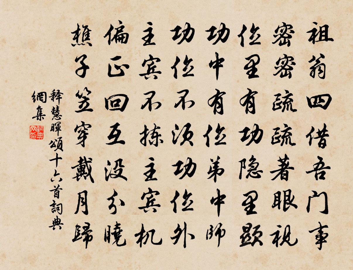 詩詞名句歷史字典書法欣賞書法字典國語詞典說文解字康熙字典古漢語字典標 題 作 者 詩 句 頌十六首作者:釋慧暉 朝代:宋代頌十六首原文祖翁四借吾門事,密密疏疏著眼視。位里有功隱里顯,功中有位弟中師。功位不須功位外,主賓不揀主賓機。偏正回互沒分曉,樵子笠穿戴月歸。詩詞問答問:頌十六首的作者是誰?答:釋慧暉問:頌十六首寫於哪個朝代?答:宋代釋慧暉頌十六首書法欣賞頌十六首書法作品詩詞推薦常自在歌徐僑〔宋代〕常自在。常自在,莫受物觸隨變改。心常澄太虛,胸常涵滄海。志常明秋霜,氣常融春靄。常自在。常自在,莫或入崖口五渡寄李適宋之問〔唐代〕抱琴登絕壑,伐木溯清川。路極意謂盡,勢回趣轉綿。人遠草木秀,山深雲景鮮。余負海嶠情,自昔微尚然。彌曠再次韻陳棣〔宋代〕小圃香初足,枯池水乍通。捲簾延舊燕,掃徑襯飛紅。寂寂梨花雨,斜斜柳帶風。東君有餘思,別在一壺中。秋興有感戴復古〔宋代〕客游江海上,幾度見秋風。遠浦蘆花白,疏林秋實紅。人情朝暮變,景物古今同。老眼猶明在,從教兩耳聾。八月十五夜月舒岳祥〔宋代〕引夜十分月,年時中半秋。華夷同一照,今古幾多愁。顥氣橫空白,天光際海浮。兒時讀書處,桂子落岩幽。重山論易贈吳叔達陳藻〔宋代〕似汝論三易,何人閱五車。白頭長作侶,黃石即為家。春懷十首汪莘〔宋代〕神遊何邊方,夢到迷處所。論世非秦漢,辨地豈吳楚。碧桃翳陽林,翠霞蔭清渚。鵾雞鳴化間,鸞鶴將儔侶。中有金丹詩四十八首張繼先〔宋代〕真鉛真汞最堪憑,此理昭昭卻少行。 * 鼎中成玉液,螣蛇宮裡養金精。坎男離女分三位,日月東西合一程。若幾次韻宋永兄感舊五首黃公度〔宋代〕齠齓談經動聖聰,山川英氣向來鍾。中書落筆萬人繞,天陛賜袍千載逢。利鎖名韁身半老,酒徒詩社意偏濃。莫欺句釋惠崇〔宋代〕多年不道姓,幾日旋移家。豫章巨浸呈陳幼度提乾戴復古〔宋代〕乞得新晴賦晚霞,出門無路欲乘槎。憂風憂雨動經月,足食足衣能幾家。一飯共君烹瓠葉,三杯無處看荷花。自成浪淘沙近宋祁〔宋代〕少年不管。流光如箭。因循不覺韶光換。至如今,始惜月滿、花滿、酒滿。扁舟欲解垂楊岸。尚同歡宴。日斜歌闋句林逋〔宋代〕風回時帶笛,煙遠忽藏村。答錢寺丞憶伊川歐陽修〔宋代〕之子問伊川,伊川已春色。綠芷雜芳浦,青溪含白石。山阿昔留賞,屐齒無遺蹟。惟有岩桂花,留芳待歸客。糖多令(壽東軒)蔣捷〔宋代〕秋碧瀉晴灣。樓台雲影閒。記仙家、元在蓬山。飛到雁峰塵更少,三萬頃、玉無邊。金盞倒垂蓮。歌搖香霧鬟。任遣興方岳〔宋代〕老去犁鋤易作勞,藤陰才午臥衡茅。鬚眉甚古松當戶,羽翼初成燕出巢。安所歸乎惟酒隱,宛其老矣只詩豪。忍窮賢者之孝二百四十首伏湛林同〔宋代〕向來父學顯,別自以家名。不是能傳業,如何著孝聲。暫歸桂隱雜書四首張鎡〔宋代〕作雙鸂鶒住方池,樂此荷錢近釣磯。應笑主翁塵袂黑,故從清泚浣紅衣。東軒小室即事五首曾幾〔宋代〕去聖未雲遠,故在黃卷中。孰能領其要,直用一理通。森羅廢興事,瑩若磨青銅。使我見萬古,敬謝典午公。有感三首項安世〔宋代〕運屬宣和本,干戈變故仍。倦勤修內禪,流澤啟中興。睢水千麾集,胡沙八駿騰。尺書傅諱日,寰宇淚如澠。名句推薦又是過重陽,台榭登臨處,茱萸香墜。李煜《謝新恩·冉冉秋光留不住》 花紅易衰似郎意,水流無限似儂愁。劉禹錫《竹枝詞·山桃紅花滿上頭》 樓船夜雪瓜洲渡,鐵馬秋風大散關。陸游《書憤五首·其一》 溪深古雪在,石斷寒泉流。李白《尋高鳳石門山中元丹丘》 纖雲弄巧,飛星傳恨,銀漢迢迢暗度。秦觀《鵲橋仙·纖雲弄巧》 君子立身,雖雲百行,唯誠與孝最為其首。魏徵《隋書·帝紀·卷二》 斷香殘酒情懷惡。西風催襯梧桐落。李清照《憶秦娥·詠桐》 陽月南飛雁,傳聞至此回。宋之問《題大庾嶺北驛》 物舍其所長,之其所短,堯亦有所不及矣劉向《戰國策·齊三·孟嘗君有舍人而弗悅》 風暖鳥聲碎,日高花影重。杜荀鶴《 * 怨》