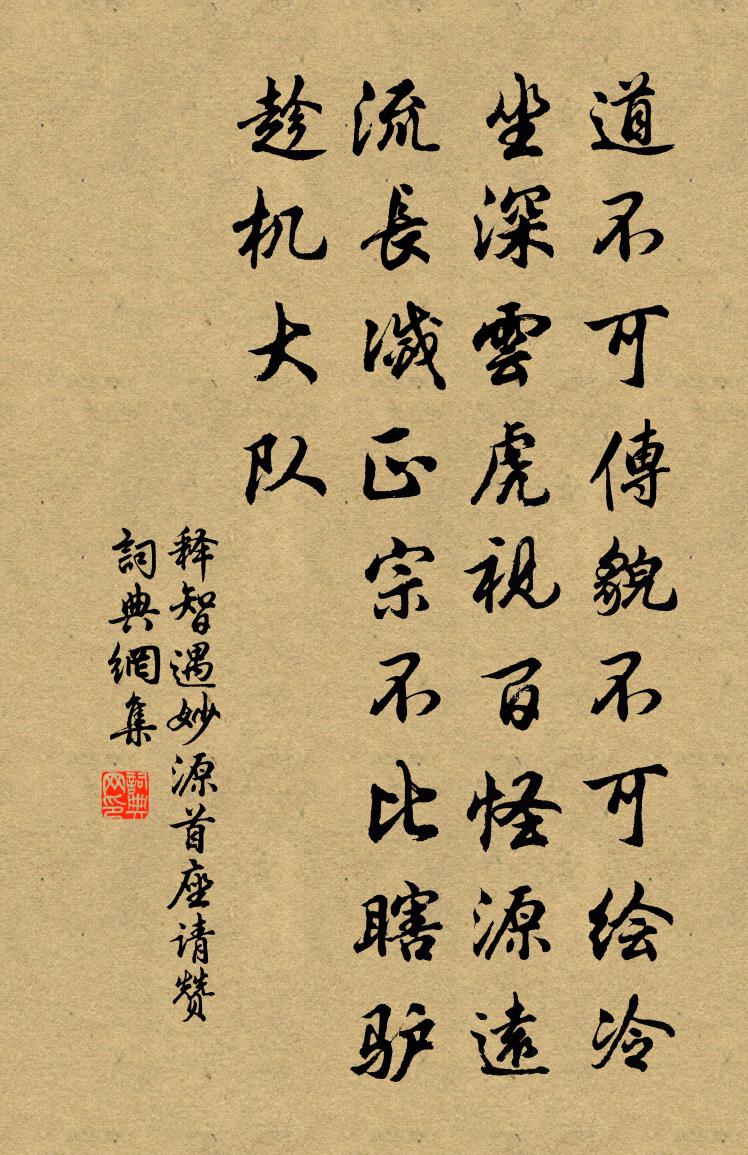 詩詞名句歷史字典書法欣賞書法字典國語詞典說文解字康熙字典古漢語字典標 題 作 者 詩 句 妙源首座請贊作者:釋智遇 朝代:宋代妙源首座請贊原文道不可傳,貌不可繪。冷坐深雲,虎視百怪。源遠流長滅正宗,不比瞎驢趁機大隊。詩詞問答問:妙源首座請贊的作者是誰?答:釋智遇問:妙源首座請贊寫於哪個朝代?答:宋代釋智遇妙源首座請贊書法欣賞妙源首座請贊書法作品詩詞推薦寓意方回〔宋代〕季路三都不盡隳,城孤尚許脫阽危。一日西家鼠運去,太丘忽有杜亡時。贈黃庭筠舉進士梅堯臣〔宋代〕橘柚生南國,幽林日匆蒨。上有嘉禽鳴,五色被余絢。彼美發華英,厥包待秋薦。根本當自持,無為風土變。二月九日偶成陳著〔宋代〕老境何須更問年,得須臾活便翛然。平生交際無金谷,窮健中閒自葛天。終日閉門知拙味,有時放杖信嬉緣。兒孫蘭無可〔唐代〕蘭色結春光,氛氳掩眾芳。過門階露葉,尋澤徑連香。畹靜風吹亂,亭秋雨引長。靈均曾採擷,紉珮掛荷裳。寫真寄夫薛媛〔唐代〕欲下丹青筆,先拈寶鏡寒。已經顏索寞,漸覺鬢凋殘。淚眼描將易,愁腸寫出難。恐君渾忘卻,時展畫圖看。再和劉克莊〔宋代〕從來糞土輕胡趙,晚視渠儂直唯阿。時與客聯烘虱句,斷無人聽飯牛歌。掛冠耄及收身晚,賜扇恩深取數多。周易過華山潘閬〔宋代〕高愛三峰插太虛,掉頭吟望倒騎驢。旁人大笑從他笑,終擬移家向此居。和劉會之野堂韻杜范〔宋代〕草草春又過,淒晦風雨夕。三年烏傷夢,不斷一區宅。台山在何許,空有塵滿屐。英英江夏公,老龍蟠古澤。尋勝報師恩 繼重陽韻馬鈺〔元代〕今朝跪領本師詩。秘密玄機喜得知。勘破萬緣忘假相,滌除六欲起真慈。男婚女嫁休心日,意滅情忘舍俗時。恭從喜仲微學士直右史宋祁〔宋代〕殿棟洪紛冒紫霏,新聞再拜上丹墀。日高中禁仙香馥,輦度橫街赭傘移。寶校對呈天廄馬,輕兵看閱羽林兒。因君道無情 時在龍陽觀,東川秋陽來請,丙戌元尹志平〔元代〕每夜三更問話。說破人情虛假。個個悟真宗。道心通。要望秋陽回意。莫縱高眠春睡。指日復歸來。笑顏開。詠旱三首曾幾〔宋代〕邦人奉教條,久不知肉味。潭龍不能神,土偶安足恃。應真住蘭若,雲雨可立致。胡不迎之來,明明有前事。客有寫真者見予因以三詩贈之李師中〔宋代〕嗟予少也賤,到老尚無功。方寸浮名外,流外兩鬢中。對鏡猶慚愧,圖寫若為容。贈太清盧道士王建〔唐代〕上清道士未升天,南嶽中華作散仙。書賣八分通字學,丹燒九轉定人年。修行近日形如鶴,導引多時骨似綿。想向滿江紅(壬子秋社莆中賦桃花)趙師俠〔宋代〕露冷天高,秋氣爽、千林葉落。驚初見、小桃枝上,盛開紅萼。淺淡胭脂經雨洗,剪裁瑪瑙如雲薄。問素商、何事太白老人張籍〔唐代〕日觀東峰幽客住,竹巾藤帶亦逢迎。暗修黃籙無人見,深種胡麻共犬行。洞裡仙家常獨往,壺中靈藥自為名。春泉次韻三弟學士題七寶英師壁蘇頌〔宋代〕岩居得幽勝,俗累無憂傷。占彼鳳山腋,建茲法雲堂。宵眠一氈蒲,晝食幾稻粱。淨眾集善緣,勇猛能自強。瑞相連夕大風,凌寒梅已零落殆盡三絕范成大〔宋代〕玉雪飄零賤似泥,惜花還記賞花時。賞花不許輕攀折,只許家人戴一枝。念奴嬌(壬寅生日)劉克莊〔宋代〕比如去歲前年,今朝差覺門庭靜。玉軸錦標無一首,知道先生遠佞。假使文殊,攜諸菩薩,來問維摩病。無花堪散添字浣溪沙/山花子佚名〔宋代〕取次勻妝粉有痕。參差玉軟淡精神。姑射重綃風卷亂,喜相迎。蝶戲飛層雙翅重,清中富貴最多情。全似壽陽當日名句推薦細看茱萸一笑,詩翁健似常年。張可久《風入松·九日》 草長鶯飛二月天,拂堤楊柳醉春煙。高鼎《村居》 居庸關上子規啼,飲馬流泉落日低。朱彝尊《出居庸關》 秋江帶雨,寒沙縈水,人瞰畫閣愁獨。史達祖《八歸·秋江帶雨》 三五年時三五月,可憐杯酒不曾消。黃景仁《綺懷》 人之生不能無群荀子《荀子·富國》 南風吹其心,搖搖為誰吐?王冕《墨萱圖·其一》 流年莫虛擲,華發不相容。方乾《送從兄郜 / 韋郜 / 途中別孫璐》 潮打三更瓜步月,雨荒十里紅橋火。鄭燮《滿江紅·思家》 不知近水花先發,疑是經冬雪未銷。張謂《早梅》