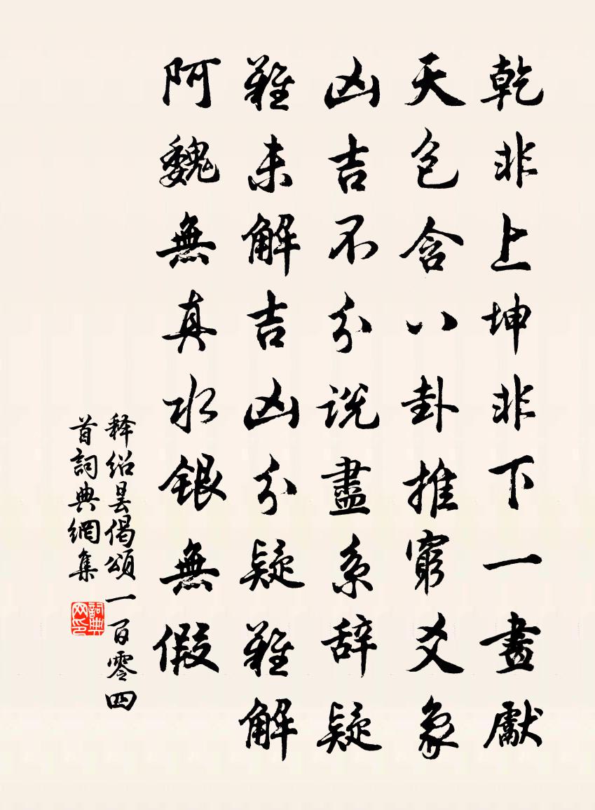 詩詞名句歷史字典書法欣賞書法字典國語詞典說文解字康熙字典古漢語字典標 題 作 者 詩 句 偈頌一百零四首作者:釋紹曇 朝代:宋代偈頌一百零四首原文乾非上,坤非下。一畫先天,包含八卦。推窮爻象,凶吉不分,說盡繫辭,疑難未解。吉凶分,疑難解。阿魏無真,水銀無假。詩詞問答問:偈頌一百零四首的作者是誰?答:釋紹曇問:偈頌一百零四首寫於哪個朝代?答:宋代釋紹曇偈頌一百零四首書法欣賞偈頌一百零四首書法作品詩詞推薦導引佚名〔宋代〕帝皇盛烈,教孝謹民常。嚴父位明堂。管絲金石含天韻,籩豆薦芬芳。肅然音響靈來下,容與動祥光。四方內外交游慈雲二首陳著〔宋代〕今夕是何夕,相攜踏雪乾。弟兄清濁酒,僧俗素葷盤。邂逅半年事,笑談終日歡。欲歸歸未得,戀月靠闌乾。送朴處士歸新羅顧非熊〔唐代〕少年離本國,今去已成翁。客夢孤舟里,鄉山積水東。鰲沈崩巨岸,龍斗出遙空。學得中華語,將歸誰與同。丈人觀徐氏〔唐代〕早與元妃慕至化,同躋靈岳訪真仙。當時信有壺中景,今日親來洞裡天。儀仗影空寥廓外,金絲聲揭翠微巔。惟慚偈六十九首釋道寧〔宋代〕人從卞州來,不得東京信。陝路既相逢,到底難親覲。撫掌笑呵呵,解佩空王印。上張丞相十首張元乾〔宋代〕廣漢家山遠,臨川道路旁。安輿懷故壘,同氣聽甘棠。雪後風煙潤,春歸草木香。丹心馳魏闕,夢想萬年觴。山行行歌十首周文璞〔宋代〕竦楶雕珉萬萬層,雲頭晃晃現觚稜。野人自愛幽深景,只是尋常不見僧。雨晴小步陳必復〔宋代〕蠶月家家靜,村流處處深。草分兩岸色,竹覆半池陰。少飲亦微醉,獨行還自吟。兒童怪相問,爭識野夫心。題范譓卿愛山吟境圖仇遠〔宋代〕前山排闥如虬奔,後山擁壁如虎蹲。三間茅屋白雲里,一群野鹿青松根。世上好山誰不喜,紗帽可能長隱几。詩人鄰友疫戴表元〔宋代〕歲惡災妖熾,人窮性命輕。如何赤發鬼,亦及白眉生。忍楚嘗親藥,停哀寫子旌。鄉鄰拘俗忌,哭吊並無聲。次韻徐庭珍春日雜言十首陳棣〔宋代〕卉木爭供眾妙薰,春工試手為裁成。紛紛落蕊鶯邊雨,寂寂遊絲燕外晴。黔中罷職將泛江東李頻〔唐代〕黔中初罷職,薄俸亦無殘。舉目鄉關遠,攜家旅食難。野梅將雪競,江月與沙寒。兩鬢愁應白,何勞把鏡看。挽故和容州朝請陶公丁師正〔宋代〕揖坐樓頭夜,酒杯生菜盤。交情三月暮,細雨一燈寒。談笑響如在,賡酬墨未乾。死生千古別,西日照闌乾。月重輪行曹叡〔魏晉〕天地無窮。人命有終。立功揚名。行之在躬。聖賢度量。得為道中。蘆葦江八詠西浦潮痕羅仲舒〔宋代〕潮漲復朝退,盈縮痕常存。渡口孤舟橫,濟川應有人。金蓮出玉花 自述丘處機〔元代〕蓬頭垢面。不管形骸貧與賤。抱朴頤神。恬淡無憂樂本真。冰姿玉體。到了難趨沉土底。子羽潘安。泉下骷髏總一四月六日同江朝宗花下飲吳芾〔宋代〕十分擬共醉花枝,底事君來苦後期。芍藥階前猶爛熳,酴醾回上已離披。春歸又是辜杯酒,老去還應惜歲時。今日紅樓夢十二曲——恨無常曹雪芹〔清代〕喜榮華正好,恨無常又到,眼睜睜把萬事全拋,盪悠悠芳魂銷耗。望家鄉路遠山高。故向爹娘夢裡相尋告:兒命已系子詞楊維楨〔元代〕車驅驅,鄧家孥。長繩系野樹,小兒泣呱呱。泣呱呱,父一顧,可奈胡?弟兒在手不可俱。父再顧,眼血枯。行人寄僧琴山楊紬林〔宋代〕閩海西來山復山,白雲深處見禪關。幽岩風細鶯聲緩,古寺春深鶴夢間。遊子從來悲草綠,老僧渾不計花殘。笑余名句推薦千淘萬漉雖辛苦,吹盡狂沙始到金。劉禹錫《浪淘沙九首》 記曉葉題霜,秋燈吟雨,曾系長橋過艇。吳文英《十二郎·垂虹橋》 千里稻花應秀色,五更桐葉最佳音。曾幾《蘇秀道中》 相見時難別亦難,東風無力百花殘。李商隱《無題·相見時難別亦難》 遠送從此別,青山空復情。杜甫《奉濟驛重送嚴公四韻》 曉雞驚樹雪,寒鶩守冰池。李商隱《幽居冬暮》 美人卷珠簾,深坐顰蛾眉。李白《怨情》 昔有佳人公孫氏,一舞劍器動四方。杜甫《觀公孫大娘弟子舞劍器行》 秋天一夜靜無雲,斷續鴻聲到曉聞。張仲素《秋閨思二首》 表獨立兮山之上,雲容容兮而在下;屈原《九歌》