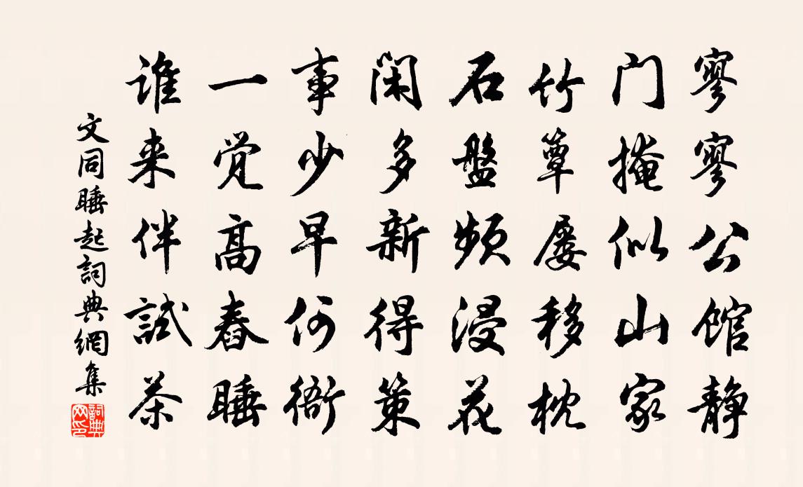 詩詞名句歷史字典書法欣賞書法字典國語詞典說文解字康熙字典古漢語字典標 題 作 者 詩 句 睡起作者:文同 朝代:宋代睡起原文寥寥公館靜,門掩似山家。竹簟屢移枕,石盤頻浸花。閒多新得策,事少早何衙。一覺高舂睡,誰來伴試茶。詩詞問答問:睡起的作者是誰?答:文同問:睡起寫於哪個朝代?答:宋代文同睡起書法欣賞睡起書法作品詩詞推薦題人畫扇十首曹勛〔宋代〕一川芳草接濃雲,拂地垂楊帶雨昏。蓑笠不堪牛背濕,迎風呼犢趁柴門。答王甫撫乾和荊江亭韻孫應時〔宋代〕別時記撫掌,醉劇語無倫。君如齊轅固,獨不類平津。交遊半白頭,心跡誰為陳。由來松柏榦,不爭桃李春。橫山楊萬里〔宋代〕已過方山了,橫山更絕奇。爭高一尖喜,妒逸眾青追。萬馬頭驚拶,千旗腳恣吹。娟峰恰三五,隔柳尚參差。頌十玄談心印釋印肅〔宋代〕無心猶隔一重關,滯寂沉空也大難。啼問阿娘誰是母,閒雲溪水笑潺潺。次韻吳厚秀才見寄蘇轍〔宋代〕壯心摧折漸無餘,早歲為文老不如。登木求魚知我拙,循窠覓兔笑君疏。清尊獨酌夜方半,白髮潛生歲欲除。久恐宿李樞書齋周賀〔唐代〕小齋經暮雨,四面絕纖埃。眠客聞風覺,飛蟲入燭來。夜涼書讀遍,月正戶全開。住遠稀相見,留連宿始回。送江端伯之隆興蔡沈〔宋代〕人生辛苦惟別離,況復心相知。辛酸話別語不出,相看執手徒依依。問君西遊何歸期,長途巉岩不可思。春霜日暮經費冠卿舊隱劉昭禹〔唐代〕節高終不起,死戀九華山。聖主情何切,孤雲性本閒。名傳中國外,墳在亂松間。依約曾棲處,斜陽鳥自還。牡丹徐凝〔唐代〕何人不愛牡丹花,占斷城中好物華。疑是洛川神女作,千嬌萬態破朝霞。詠水精韋應物〔唐代〕映物隨顏色,含空無表里。持來向明月,的皪愁成水。鷓鴣天韓玉〔宋代〕愛日烘晴旬日間。謾邀朋輩為躋攀。無窮望眼無窮恨,不盡長江不盡山。星點點,月團團。倒流河漢入杯盤。飽吟偈頌一百零二首釋紹曇〔宋代〕一徑直,二周遮。眉毛眼睫,地角天涯。雲門胡餅趙州茶,惠崇蘆雁趙昌花。會則星河秋一雁,一會砧杵夜千家。代人挽王待制曾豐〔宋代〕盤盤胸次五車書,凜凜朝端烈丈夫。詭道至前無肯可,危言及上有都俞。熊羆聲撼據關虎,鷹隼氣吞憑社孤。遺直害惠安吳簿明輔子良權南安宰二首王邁〔宋代〕邑人見說漸相安,更把西山作樣看。有人社民行志易,不寬不猛得中難。設施新法須明允,掩蓋前愆莫糾彈。便作採桑子晏幾道〔宋代〕春風不負年年信,長趁花期。小錦堂西。紅杏初開第一枝。碧簫度曲留人醉,昨夜歸遲。短恨憑誰。鶯語殷勤月落荷鄧深〔宋代〕田田藕葉綠如裳,拍塞池亭儘是香。不受纖塵偏受露,十分清絕倚晨光。和葉季質以唐律兩篇見屬陳長方〔宋代〕風流王右轄,蕭散鄭丹邱。此事今難再,如公可並游。千篇詩價重,十日酒船浮。聖主方東幸,山中莫滯留。冬日利登〔宋代〕藤果纍纍熟,山晴自繞檐。斷薪經雨濕,野菜著霜甜。詩秒客相笑,家貧鶴不嫌。誰能更惆悵,痴坐卷疎簾。送相十高元善二首楊萬里〔宋代〕選官選佛兩悠悠,元不關人浪自愁。洙泗生涯久春草,老夫作麽脕回頭。水龍吟 賦箏王惲〔元代〕故家張樂娛寶,樂中無似秦箏大。華筵聽處,一揮銀甲,笙竽幽籟。四座雄聲,滿空秋雨,來從天外。甚*然思變名句推薦君子而詐善,無異小人之肆惡;君子而改節,不若小人之自新。洪應明《菜根譚·概論》 觸簾風送景陽鍾,鴛被繡花重。顧敻《虞美人·觸簾風送景陽鍾》 何當擊凡鳥,毛血灑平蕪。杜甫《畫鷹》 春潮帶雨晚來急,野渡無人舟自橫。韋應物《滁州西澗》 刑稱罪,則治;不稱罪,則亂。荀子《荀子·正論》 新歡不抵舊愁多,倒添了、新愁歸去范成大《鵲橋仙·七夕》 晴雲輕漾,薰風無浪,開樽避暑爭相向。薛昂夫《西湖雜詠·夏》 遙看孟津河,楊柳郁婆娑。佚名《折楊柳歌辭五首》 用人物,須明求。儻不問,即為偷。李毓秀《弟子規·謹》 湖上春來似畫圖,亂峰圍繞水平鋪。白居易《春題湖上》