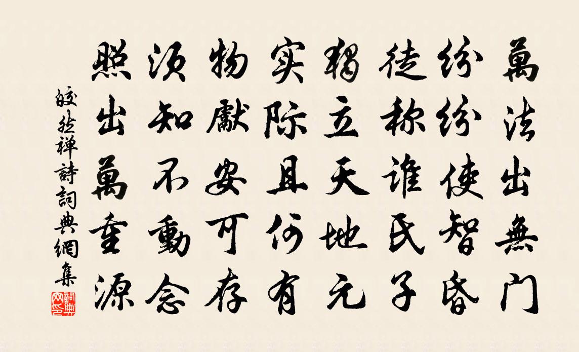 詩詞名句歷史字典書法欣賞書法字典國語詞典說文解字康熙字典古漢語字典標 題 作 者 詩 句 禪詩作者:皎然 朝代:唐代禪詩原文萬法出無門,紛紛使智昏。徒稱誰氏子,獨立天地元。實際且何有,物先安可存。須知不動念,照出萬重源。詩詞問答問:禪詩的作者是誰?答:皎然問:禪詩寫於哪個朝代?答:唐代問:禪詩是什麼體裁?答:五律皎然禪詩書法欣賞禪詩書法作品注釋全唐詩:卷820-46詩詞推薦寄介夫李覯〔宋代〕天恨吾儕各一方,夕陽千度到西窗。因循流俗今皆是,磊落如君信少雙。書未隔年難得報,心從薄宦始應降。可憐和盧叔才食蛹葛立方〔宋代〕綠柘林中聽晚繅,聞將煮蛹當持螯。何須有繭大如瓮,救得妻兒啼與號。十疊劉克莊〔宋代〕天子封松作某官,相君復報竹平安。梅花一點無沾惹,三友中間獨歲寒。南鄉子(寄和潘教授元賓喜晴)王之道〔宋代〕天際彩虹垂。風起痴雲快一吹。原隰畇畇,春水更瀰瀰。布穀期從野鳥知。初霽捲簾時。巷陌泥融燕子飛。午醉醒交韻漳州鄧教授二首李彌遜〔宋代〕十年猿鶴共蕭蕭,世事驅人肯見饒。老態嶺雲風更急,壯心爐篆日還銷。催科政拙民猶病,禦侮才疏盜正驕。強拾南歌子仲殊〔宋代〕解舞清平樂,如今說向誰。紅爐片雪上鉗錘。打就金毛獅子、也堪疑。木女明開眼,泥人暗皺眉。蟠桃已是著花遲寒食蔣夢炎〔宋代〕不暖不寒寒食天,小橋楊柳未飛綿。三分春色一分在,十日晴無兩日全。桐角喚回前嶂曉,子規啼破隔江煙。麻裙哭?十五章辛棄疾〔宋代〕世無扁和手,遺恨歸砭劑。嗟誰使之然,刻舟寧復記。寄東塔僧杜牧〔唐代〕初月微明漏白煙,碧松梢 * 青天。西風靜起傳深業,應送愁吟入夜蟬。醉中戲贈襲美陸龜蒙〔唐代〕南北風流舊不同,傖吳今日若相通。病來猶伴金杯滿,欲得人呼小褚公。匹馬劉克莊〔宋代〕匹馬曾經小店炊,一株玉雪映疏籬。無言誰識含情處,有韻全看背面時。乍見心方驚絕艷,重來人已折繁枝。斷煙重過戴氏居 其三王冕〔元代〕琴書滿屋壁,不下晉家聲。湖海懷高義,交遊閱古情。宰瓜緣暮景,看竹喜新晴。更約清高友,山林結隱名。送僧釋重顯〔宋代〕極目春光水照空,岸莎汀草碧茸茸。三千里外生靈望,獨倚寒藤振祖風。暴雨梅堯臣〔宋代〕雲薄風回雨點麤,日腥土氣隨吸呼。蒸然襲汗猶揮珠,屋瓦裂響波生渠。森森斗覺涼侵膚,毛根癝瘮粟匝軀。已知追用南塘韻題尹剛中潛齋劉克莊〔宋代〕幽士慕鱗潛,通人笑蚓廉。誑腸齏味美,節腹筍生添。諸老徒推轂,先生且下簾。食惟陳簋二,饋不費金兼。和靖寄遠趙嘏〔唐代〕禁鐘聲盡見棲禽,關塞迢迢故國心。無限春愁莫相問,落花流水洞房深。題清虛庵皇甫真人坦之隱居李塾〔宋代〕寶墨光分眄禁春,超然晏坐寂怡神。力辭漢殿從遊樂,乞得康廬自在身。黃屋記曾參扈從,白衣猶憶指山人。恐虛少年游張耒〔宋代〕含羞倚醉不成歌。縴手掩香羅。偎花映燭,偷傳深意,酒思入橫波。看朱成碧心迷亂,翻脈脈、斂雙蛾。相見時稀雪意方濃復作雨范成大〔宋代〕擬看飛花陣,翻成建水聲。雨吾寧不識,雪汝幾時成。三白從今卜,千倉待此盈。黃雲如有意,青女莫無情。擬古董嗣杲〔宋代〕河漢金氣老,海月光陸離。蟠蟀鳴我床,聲聲有餘悲。美人天之涯,言旋杳無期。西風吹脫葉,撫時傷所思。名句推薦天油然作雲,沛然下雨,則苗浡然興之矣。孟子《孟子·梁惠王章句上·第六節》 靡不有初,鮮克有終。佚名《盪》 人生十年曰幼,學。二十曰弱,冠。三十曰壯,有室。四十曰強,而仕。五十曰艾,服官政。戴聖《禮記·曲禮上》 不茶不飯,不言不語,一味供他憔悴。蜀妓《鵲橋仙·說盟說誓》 教民禮順,莫善於悌。孔子及其弟子《孝經·廣要道》 忙日苦多閒日少,新愁常續舊愁生。陸游《浣溪沙·和無咎韻》 對瀟瀟暮雨灑江天,一番洗清秋。柳永《八聲甘州·對瀟瀟暮雨灑江天》 卻愁擁髻向燈前,說不盡、離人話納蘭性德《一絡索·過盡遙山如畫》 白雲映水搖空城,白露垂珠滴秋月。李白《金陵城西樓月下吟》 無言暗將紅淚彈。闌珊,香銷輕夢還。納蘭性德《河傳·春淺》