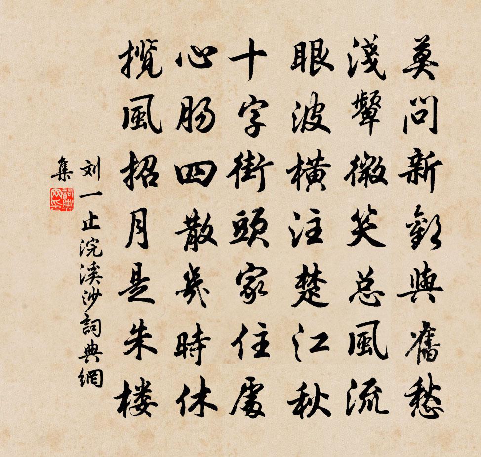 詩詞名句歷史字典書法欣賞書法字典國語詞典說文解字康熙字典古漢語字典標 題 作 者 詩 句 浣溪沙作者:劉一止 朝代:宋代浣溪沙原文莫問新歡與舊愁。淺顰微笑總風流。眼波橫注楚江秋。十字街頭家住處,心腸四散幾時休。攬風招月是朱樓。詩詞問答問:浣溪沙的作者是誰?答:劉一止問:浣溪沙寫於哪個朝代?答:宋代問:浣溪沙是什麼體裁?答:詞劉一止浣溪沙書法欣賞浣溪沙書法作品詩詞推薦失調名宋祁〔宋代〕因為銜泥污錦衣。垂下珠簾不敢歸。溪南大雪示常子正朱翌〔宋代〕王者有德琪樹生,兵馬欲洗銀瓮出。天將以寶奠中原,何用真如傳恍惚。沙寒汀冷鷺啄冰,藻暖餌香魚近罾。梅花書里中所見史衛卿〔宋代〕闌乾十二纈簾遮,獸棟鱗鱗鼎貴家。莫道樓台無地起,滿城秋色半槐花。寄徐文淵徐照〔宋代〕別君一百一十日,喜聽人傳八句詩。只在鄰州難得見,卻思前任遠相隨。分名丹荔畫成軸,出處子魚糟過時。近日送嵩客白居易〔唐代〕登山臨水分無期,泉石煙霞今屬誰?君到嵩陽吟此句,與教三十六峰知。山中答人齊己〔唐代〕謾道詩名出,何曾著苦吟。忽來還有意,已過即無心。夏月山長往,霜天寺獨尋。故人憐拙樸,時復寄空林。寄崇福源長老釋智愚〔宋代〕一髮千鈞適此時,風前無語皺雙眉。松源正脈將枯竭,浚發靈源復是誰。風入松(聞鄰女吹笛)高觀國〔宋代〕粉嬌曾隔翠簾看。橫玉聲寒。夜深不管柔荑冷,櫻朱度、香噴雲鬟。霜月搖搖吹落,梅花簌簌驚殘。蕭郎且放鳳簫庭前菊蘇泂〔宋代〕百圳黃香十月春,東籬佳節誤陶巾。開花較晚酒羞澀,風味依然似主人。贈畫者連文鳳〔宋代〕麒麟閣上十一人,斯人瑞世真麒麟。雲台功臣二十八,中興事業爭嶙峋。或在生前或死後,藉藉聲名自不朽。不知待制中書舍人陳公之亡以山宅須利既遷殯而未葉適〔宋代〕嗟我與公同澹泊,一生一死又淒涼。經綸傳世止於此,老病著身行自當。掛壁斷弦從別調,拂天進駐水渡新。暮春荷花宋伯仁〔宋代〕綠蓋半篙新雨,紅香一點清風。天賦本根如玉,濂溪以道心同。句石延年〔宋代〕弋下失溟鴻,網細遺巨鯤。經故丁補闕郊居許渾〔唐代〕死酬知己道終全,波暖孤冰且自堅。鵩上承塵才一日,鶴歸華表已千年。風吹藥蔓迷樵徑,雨暗蘆花失釣船。四尺玉女詞張安石〔唐代〕綺薦銀屏空積塵,柳眉桃臉暗銷春。不須更學陽台女,為雨為雲趁惱人。依韻和晁之十七見招之什張耒〔宋代〕斷送春光酒萬壺,敢辭羸馬為君驅。桑田日暖鳩呼婦,楊柳葉深鶯哺雛。詩冷有情尋水石,年豐無盜起萑蒲。河陽病因飲致方回〔宋代〕痰鎖卦喉管,瘡釘突齒齦。猥勤無算爵,肯顧不貲身。未即容殂謝,徒令受楚辛。果能深避地,何敢妄尤人。送高才卿守永康二首洪咨夔〔宋代〕同社紛紛早上坡,一麾獨愛晚婆娑。矜春桃李好能幾,飽雨稻梁收更多。管攝三才還正大,陶鎔萬象是中和。西風婦嘆危稹〔宋代〕記得蕭郎登第時,謂言即日鳳皇池。而今老等閒官職,日欠人錢夜欠詩。和羅春伯奉常寄題稽山閣韻袁說友〔宋代〕公來只謁自周行,腳踏稽山意遠翔。疊嶂排雲煙杳靄,半天得月夜淒涼。無言可狀湖山好,有客來時綿繡張。底事名句推薦貂不足,狗尾續。房玄齡《晉書·列傳·第二十九章》 雪紛紛,掩重門,不由人不斷魂,瘦損江梅韻。關漢卿《大德歌·冬》 松江上,念故人老矣,甘臥閒雲。吳文英《沁園春·送翁賓暘游鄂渚》 人告之以有過則喜。孟子《孟子·公孫丑章句上·第八節》 苦心中常得悅心之趣;得意時便一失意之悲。洪應明《菜根譚·概論》 大德不官,大道不器,大信不約,大時不齊。戴聖《禮記·學記》 一夕輕雷落萬絲,霽光浮瓦碧參差。秦觀《春日》 月照城頭烏半飛,霜淒萬樹風入衣。李頎《琴歌》 人過留名,雁過留聲。佚名《增廣賢文·下集》 四牡何時入,吾君憶履聲。張九齡《奉和聖制送尚書燕國公赴朔方》