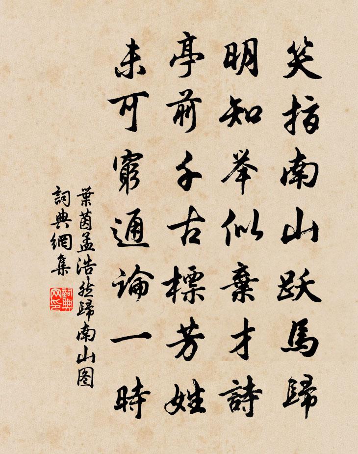 詩詞名句歷史字典書法欣賞書法字典國語詞典說文解字康熙字典古漢語字典標 題 作 者 詩 句 孟浩然歸南山圖作者:葉茵 朝代:宋代孟浩然歸南山圖原文笑指南山躍馬歸,明知舉似棄才詩。亭前千古標芳姓,未可窮通論一時。詩詞問答問:孟浩然歸南山圖的作者是誰?答:葉茵問:孟浩然歸南山圖寫於哪個朝代?答:宋代葉茵孟浩然歸南山圖書法欣賞孟浩然歸南山圖書法作品詩詞推薦寄山僧趙嘏〔唐代〕雲里幽僧不置房,橡花藤葉蓋禪床。朝來逢著山中伴,聞說新移最上方。次韻蘇主管大礬山歌項安世〔宋代〕我昔典司群玉峰,中有一峰如此雄。層珪累璧以億計,垂棘縣黎知幾重。瑤墀日上光煜爚,琪樹風過聲冬瓏。依稀再過溧陽縣見李侍御二首項安世〔宋代〕憶昔兒子時,仁公兩朱轓。吟篇與醉墨,零落遍湘沅。少長聽鳴騶,清霜粲華軒。風流故多奇,欲說非一言。但聞訪上文質西塾顧逢〔宋代〕獨對梅花坐,枝頭數點開。畫中無此景,雪裡有僧來。飢鶴窺流水,行龜落凍苔。茶邊清話處,一字共敲推。新正三首白玉蟾〔宋代〕九重天上星三點,萬頃波心月一鉤。醉有百篇來筆下,愁無半點到眉頭。夜訪侃直翁劉瀾〔宋代〕疏瓴亂見星,危坐冷無燈。索句髭先白,餐蔬貌欲青。樓禽翻麓雪,墮栗破溪冰。昨夜中峰頂,同看海日升。競渡蘇轍〔宋代〕史君欲聽榜人謳,一夜江波拍岸流。父老不知招屈恨,少年爭作弄潮游。長鯨破浪聊堪比,小旆逆風殊未收。角勝天仙子(壽陳倅八月十五)洪咨夔〔宋代〕風月分將秋一半。昨夜月明今夜滿。有人笙鶴御風來,玉繩轉。銀河淡。涼入天孫雲錦段。笑拈桂枝香婉娩。十字過黎君郊居(一作過黎子云新居)蘇軾〔宋代〕半園荒草沒佳蔬,煮得占禾半是薯。萬事思量都是錯,不如還叩仲尼居。諸公於石氏東齋宴鄭工部分韻得悲秋浮楊億〔宋代〕楚客登臨處,離懷重隱憂。二毛初入髩,一葉早驚秋。旅雁他鄉思,悲笳絕塞愁。憑何遣羈緒,菊蕊滿杯浮。題范寬臨流獨坐圖何權〔宋代〕茅堂結構背江乾,日日愛看江上山。箕踞盤陀吟未穩,不知身在畫圖間。趙令答詩約攜山妓見訪黃庭堅〔宋代〕晴波鸂鶒漾潭隈,能使遊人判不回。風入園林寒漠漠,日移宮殿影枚枚。未嘗綠蟻何妨撥,宿戒紅妝莫待催。缺月壽立齋王柏〔宋代〕思泉種德懋,後皇命浮美。髧髦傳正學,一念不妄起。真固滿腔仁,兢兢日增累。甲子正一周,龐眉追甪綺。年年伯收東岡麥戴表元〔宋代〕伯收東岡麥,仲移西塍秧。四季各有役,餬口走皇皇。豈不惜冠履,兼嘗業縑湘。鄰爾衣食微,及茲筋力強。古來次韻子瞻賦雪二首蘇轍〔宋代〕麥苗花出土正纖花纖,春早寒官令尚嚴。雲覆南山初半嶺,風乾東海舊花。來時瞬息平吞野,積久欹危欲敗檐。強春歸劉過〔宋代〕百花開盡到荼縻,一片春心又欲歸。可恨東風留不得,漫教啼鳥怨斜輝。長沙陪裴大夫夜宴李群玉〔唐代〕東山夜宴酒成河,銀燭熒煌照綺羅。四面雨聲籠笑語,滿堂香氣泛笙歌。泠泠玉漏初三滴,灩灩金觴已半酡。共向漁村晚照薛嵎〔宋代〕舊遊憶得瀟湘路,今喜煙波似舊時。澤畔怕逢漁父問,桃源已被世人知。數家草市添新戶,一樹寒鴉傍古祠。蘭杜再次韻四首陳造〔宋代〕語不能工恨作堆,撚髭空對翠屏開。清吟賴有雕龍手,繡段聯翩詔後來。儀坤廟樂章金奏徐彥伯〔唐代〕陰靈效祉,軒曜降精。祥符淑氣,慶集柔明。瑤俎既列,雕桐發聲。徽猷永遠,比德皇英。名句推薦擬把傷離情緒,待曉寒重說。納蘭性德《好事近·簾外五更風》 即從巴峽穿巫峽,便下襄陽向洛陽。杜甫《聞官軍收河南河北》 年年歲歲花相似,歲歲年年人不同。劉希夷《代悲白頭翁 / 白頭吟 / 有所思》 酒肆人間世,琴台日暮雲。杜甫《琴台》 擲地,當作金石聲房玄齡《晉書·列傳·第二十六章》 欲系青春,少住春還去。朱淑真《蝶戀花·送春》 好學近乎知。力行近乎仁。知恥近乎勇。子思《中庸·第二十章》 又有牆頭千葉桃,風動落花紅蔌蔌。元稹《連昌宮詞》 鄉國真堪戀,光陰可合輕。白居易《洛橋寒食日作十韻》 大道之行也,天下為公。戴聖《禮記·禮運》
