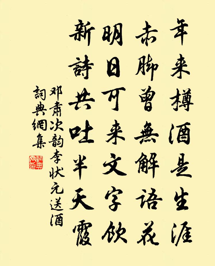 詩詞名句歷史字典書法欣賞書法字典國語詞典說文解字康熙字典古漢語字典標 題 作 者 詩 句 次韻李狀元送酒作者:鄧肅 朝代:宋代次韻李狀元送酒原文年來樽酒是生涯,赤腳曾無解語花。明日可來文字飲,新詩共吐半天霞。詩詞問答問:次韻李狀元送酒的作者是誰?答:鄧肅問:次韻李狀元送酒寫於哪個朝代?答:宋代鄧肅次韻李狀元送酒書法欣賞次韻李狀元送酒書法作品詩詞推薦鐵柱觀一首王阮〔宋代〕西晉旌陽令,南昌鐵柱宮。人間依道庇,天上擢陰功。江靜蠻夷漲,爐存造化工。我來如有遇,舉袂欲凌風。贈張繪秘教九題詩魔林逋〔宋代〕花露濕晴春,秋燈落燼頻。祇緣吟有味,不覺坐勞神。寄遠情無極,搜奇事轉新。此魔降不到,珍重五天人。贈河東虞押衙二首許渾〔唐代〕長劍高歌換素衣,君恩未報不言歸。舊精鳥篆諳書體,新授龍韜識戰機。萬里往來征馬瘦,十年離別故人稀。生平泗州山王獻臣〔宋代〕大石小石皆羅列,造化安排非人設。覆者如軒深者洞,方者如屏平者席。可以安尊罍,可以橫琴瑟。天邊烏兔眼前句諶祜〔宋代〕山花笑人人似醉,勸農文似天花墜。農今一杯回勸官,吏瘠民肥官有利。官休休,民休休,勸農文在牆壁頭。官此陪館中諸人游天竺分得香字林季仲〔宋代〕不到八年久,重來雙鬢蒼。珠璣濺寒溜,笙磬咽風篁。啼鳥千林晚,飛花一路香。吾宗故廬在,立馬傍殘陽。追憶余泊舟黃庭堅〔宋代〕老大無機如漢陰,白鳥不去相知深。往事刻舟求墜劍,懷人揮淚著亡簪。城南鼓罷吹畫筒,城北歸帆落晚風。人煙九月六日泛舟航村而舟人不審誤抵道場之麓越王阮〔宋代〕千岩矗空濛,一水還蔥蒨。寺從馴虎立,山作盤龍轉。嗟予千里來,適此十年願。初拿蓮葉舟,誤逐桃花片。重攜贈韋七贊善杜甫〔唐代〕鄉裡衣冠不乏賢,杜陵韋曲未央前。爾家最近魁三象,時論同歸尺五天。北走關山開雨雪,南遊花柳塞雲煙。洞庭贈薛總管棄官從□陳著〔宋代〕壯年自下退工夫,看破人閒戲劇圖。靈運在家心已放,知章還里計非迂。梅花夢好拋鴛侶,蕙帳閒多引鶴雛。湖海送水雲歸吳葉靜慧〔宋代〕塞上砧聲響似雷,憐君騎馬望南回。今宵且向穹廬醉,後夜相思無此杯。薛老亭晚歸曾鞏〔宋代〕終日行山不出城,城中山勢與去平。萬家市井魚鹽合,千里川原彩錯明。座上潮風醒酒力,晚來岩霧蓋鐘聲。歸時送李主簿之任南陵魏野〔宋代〕無嘆徒勞向宦途,不群氣岸有誰如。南陵暫掌仇香印,北闕終行賈誼書。且喜江山尋勝境,莫辭韋杜別幽居。少年洗竹白居易〔唐代〕布裘寒擁頸,氈履溫承足。獨立冰池前,久看洗霜竹。先除老且病,次去纖而曲。剪棄猶可憐,琅玕十餘束。青青楚公鷹范令聞〔宋代〕與鷹寫真惟楚公,與公作歌惟老杜。畫托此歌以不朽,至今人誦摶空句。相傳妙畫舊通靈,烏鵲不敢巢庭樹。飢未邯鄲宮人怨崔顥〔唐代〕邯鄲陌上三月春,暮行逢見一婦人。自言鄉里本燕趙,少小隨家西入秦。母兄憐愛無儔侶,五歲名為阿嬌女。七歲與郛郎作骨董羹四首釋慧空〔宋代〕寒士百葅食藉佳,敢比八珍五侯家。分甘長貧體生粟,誰能一飽面發霞。自羹青菘燒蘆菔,更雜石耳相天花。願留湯田早行,見李花甚盛二首楊萬里〔宋代〕此地先春信,年年只是梅。南中春更早,臘日李花開。初秋感事三首劉克莊〔宋代〕跌盪當年賦兩京,晚拋筆硯事春耕。達空函啟已心懶,讀夾注書猶眼明。金匱舊聞虛論次,香奩少作悔流行。而今勉陳石二生鄭獬〔宋代〕精金埋深山,鑿土不難得。大貝貯滄海,破浪亦能識。山趨猛虎穴,海入長蛟室。必意往取之,投軀不少惜。仁義名句推薦懷家寒食夜,中酒落花天。趙長卿《臨江仙·暮春》 至人天隱,其次地隱,其次名隱。王通《中說·卷四·事君篇》 孰知不向邊庭苦,縱死猶聞俠骨香。王維《少年行四首》 金剛則折,革剛則裂。劉向《說苑·敬慎》 但得一片橘皮吃,莫便忘了洞庭湖。施耐庵《水滸傳·第二十四回》 冥冥重泉哭不聞,蕭蕭暮雨人歸去。白居易《寒食野望吟》 一切法無我無人無眾生無壽者。鳩摩羅什譯《金剛經·究竟無我》 別浦今朝暗,羅帷午夜愁李賀《七夕》 力田已告成,計日宜收藏。黃燮清《秋日田家雜詠》 我歌君起舞,潦倒略相同。陳師道《除夜對酒贈少章》