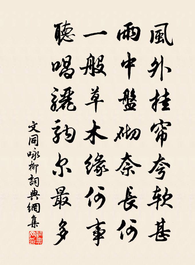 詩詞名句歷史字典書法欣賞書法字典國語詞典說文解字康熙字典古漢語字典標 題 作 者 詩 句 詠柳作者:文同 朝代:宋代詠柳原文風外1/1掛簾夸軟甚,雨中盤砌奈長何。一般草木緣何事,聽唱驪駒爾最多。詩詞問答問:詠柳的作者是誰?答:文同問:詠柳寫於哪個朝代?答:宋代文同詠柳書法欣賞詠柳書法作品詩詞推薦感皇恩 洛西為劉景玄賦秋蓮曲元好問〔金代〕金粉拂霓裳,凌波微步。瘦玉亭亭倚秋渚。澹香高韻,費盡一天清露。惱人容易被、西風誤。微雨岸花,斜陽汀樹龔令國英約小集感冷暴下皈臥感而賦焉楊萬里〔宋代〕客里何煩病,春余不謂寒。並來無計柰,那得有懷寬。憎藥猶須強,耽書更暇看。兩親問訊息,敢道不平安。眼有黑花戲書自遣歐陽修〔宋代〕洛陽三見牡丹月,春醉往往眠人家。揚州一遇芍藥時,夜飲不覺生朝霞。天下名花惟有此,樽前樂事更無加。如今謾天嶺羅隱〔唐代〕西去休言蜀道難,此中危峻已多端。到頭未會蒼蒼色,爭得禁他兩度謾。挽恭靖司法兄九首劉宰〔宋代〕賢書五上動宸旒,鵰鶚橫飛正得秋。老去劉蕡終不第,時來校尉幾封侯。雜曲歌辭。昔昔鹽。今歲往遼西趙嘏〔唐代〕萬里飛書至,聞君已渡遼。只諳新別苦,忘卻舊時嬌。烽戍年將老,紅顏日向凋。胡沙兼漢苑,相望幾迢迢。柳羅紹威〔唐代〕妝點青春更有誰,青春常許占先知。亞夫營畔風輕處,元亮門前日暖時。花密宛如飄六出,葉繁何惜借雙眉。交情張敬之縣尉陳著〔宋代〕仙棹發秋灣,稽山到不難。要將培遠業,便答自初官。秦望一峰峭,賀湖千頃寬。用心行己處,時向此中看。春暮王叔安〔宋代〕坐看飛溜落檐牙,吟里風吹鬢腳斜。洛下牡丹無買處,一枝空插杜鵑花。松江晚泊吳融〔唐代〕吳台越嶠兩分津,萬萬檣烏簇夜雲。吟盡長江一江月,更無人似謝將軍。感遇十首次韻和黃著作魯直以將窮山海跡勝絕晁補之〔宋代〕鳲鳩興獨居,百兩誰與將。未見憂忡忡,既覯為龍光。吹竽沸齊市,零雨暗空桑。寒歌牛軛底,激烈氣彌剛。用梅山別諸賢韻陳著〔宋代〕世變事難必,天倫愛自深。醉醒皆外物,甘苦共初心。倦翼山招返,寒林風為吟。休當長聚首,衰境況侵尋。鷓鴣天晏幾道〔宋代〕小令尊前見玉簫。銀燈一曲太妖嬈。歌中醉倒誰能恨,唱罷歸來酒未消。春悄悄,夜迢迢。碧雲天共楚宮遙。夢魂雜曲歌辭夜夜曲田娥〔唐代〕愁人夜獨傷,滅燭臥蘭房。只恐多情月,旋來照妾床。虢中酬陝西甄判官見贈岑參〔唐代〕微才棄散地,拙宦慚清時。白髮徒自負,青雲難可期。胡塵暗東洛,亞相方出師。分陝振鼓鼙,二崤滿旌旗。夫子玉樓春劉秉忠〔元代〕翠微掩映農家住。水滿玉溪花滿樹。青山隨我入門來,黃鳥背人穿竹去。煙霞隔斷紅塵路。試問功名知此趣。一壺和謝倅見贈生日二首陳傅良〔宋代〕獨醒長愛眾歡酣,酸苦隨人卻嗜甘。好客不知彈劍鋏,聞公風味可無慚。宿香山閣賈彥璋〔唐代〕暝望香山閣,梯雲宿半空。軒窗閉潮海,枕席拂煙虹。朱網防棲鴿,紗燈護夕蟲。一聞雞唱曉,已見日曈曈。宿雲門寺宋之問〔唐代〕雲門若邪里,泛鷁路才通。夤緣綠筱岸,遂得青蓮宮。天香眾壑滿,夜梵前山空。漾漾潭際月,飀飀杉上風。茲焉秋蕊香·簾幕疏疏風透張耒〔宋代〕簾幕疏疏風透。一線香飄金獸。朱闌倚遍黃昏後。廊上月華如晝。別離滋味濃於酒。著人瘦。此情不及牆東柳。春名句推薦詩成自寫紅葉,和恨寄東流。晏幾道《訴衷情·憑觴靜憶去年秋》 人之事兄,不可同於事父,何怨愛弟不及愛子乎?顏之推《顏氏家訓·兄弟篇》 飛雲當面化龍蛇,夭矯轉空碧。秦觀《好事近·夢中作》 君看石芒碭,掩淚悲千古李白《丁督護歌》 持斧伐遠揚,荷鋤覘泉脈。王維《春中田園作》 憂勞可以興國,逸豫可以亡身歐陽修《伶官傳序》 松下茅亭五月涼,汀沙雲樹晚蒼蒼。戴叔倫《題稚川山水》 華而不實,恥也。左丘明《國語·晉語·秦伯享重耳以國君之禮》 今又重陽,戰地黃花分外香。 * 《採桑子·重陽》 古之得道者,窮亦樂,達亦樂,所樂非窮達也。呂不韋《呂氏春秋·覽·孝行覽》