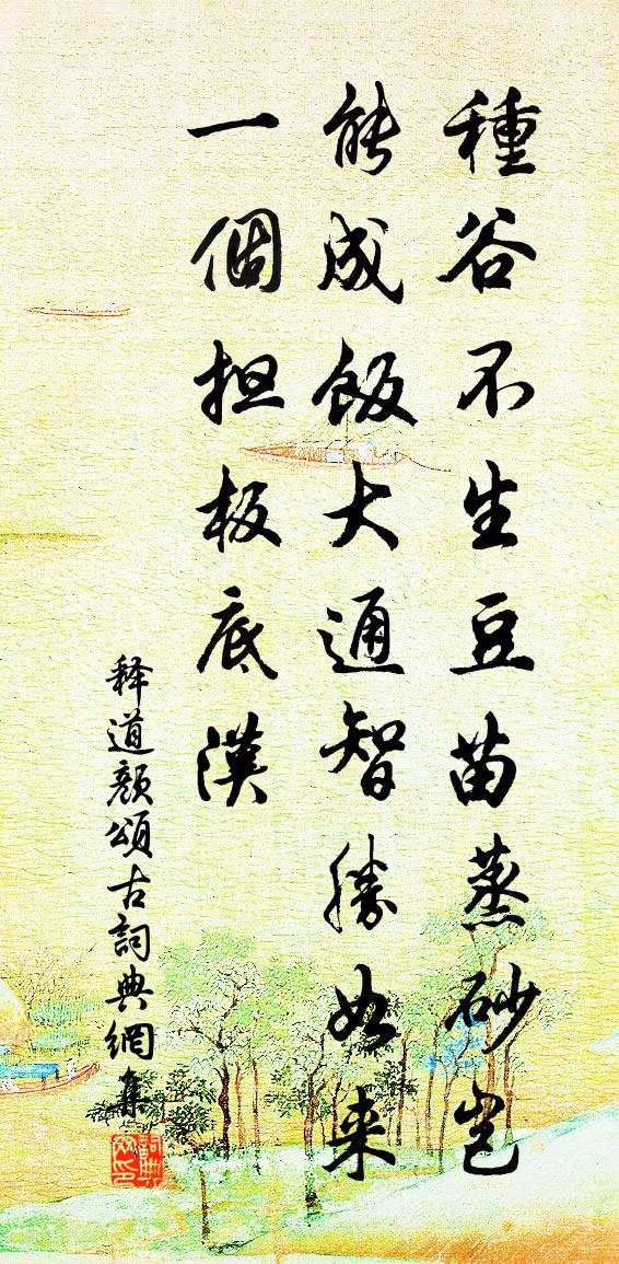 詩詞名句歷史字典書法欣賞書法字典國語詞典說文解字康熙字典古漢語字典標 題 作 者 詩 句 頌古作者:釋道顏 朝代:宋代頌古原文種穀不生豆苗,蒸砂豈能成飯。大通智勝如來,一個擔板底漢。詩詞問答問:頌古的作者是誰?答:釋道顏問:頌古寫於哪個朝代?答:宋代釋道顏頌古書法欣賞頌古書法作品詩詞推薦薊丘覽古贈盧居士藏用七首。樂生陳子昂〔唐代〕王道已淪昧,戰國競貪兵。樂生何感激,仗義下齊城。雄圖竟中夭,遺嘆寄阿衡。冬日寄河中楊少尹馬戴〔唐代〕黃河岸柳衰,城下渡流澌。年長從公懶,天寒入府遲。家山望幾遍,魏闕赴何時。懷古心誰識,應多謁舜祠。關西驛亭即事吳融〔唐代〕晚霞零落雨初收,關上危闌獨悵留。千里好春聊極目,五陵無事莫回頭。山猶帶雪霏霏恨,柳未禁寒冉冉愁。直是減字木蘭花范成大〔宋代〕玉煙浮動。銀闕三山連海凍。翠袖闌乾。不怕樓高酒力寒。雙松凍折。忽憶衰翁容易別。想見鷗邊。壓損年時小釣八月初一日方回〔宋代〕秋風幾日尚無詩,政坐炎歊轉赫曦。閒被貧為魔攬撓,病須涼當藥醫治。薄田董獲收新粟,老圃開包獻巨梨。顧此柳梢青·與龜翁登研意觀雪懷癸卯歲臘朝斷橋並馬之游吳文英〔宋代〕斷夢遊輪。孤山路杳,越樹陰新。流水凝酥,征衫沾淚,都是離痕。玉屏風冷愁人。醉爛漫、梅花翠雲。傍夜船回飛行二首白玉蟾〔宋代〕劍光長笑古劉家,不斬流星只斬蛇。從得歷年三四百,蟠桃猶自未開花。暮春聯句九首許月卿〔宋代〕徐字不晉帖,楚詩無國風。天邊長劍倚,花外小車通。不肯吏文叔,誰能書子公。二三豪俊骨,數萬甲兵胸。柳暗用韻寄孫推官二首趙蕃〔宋代〕淚垢悲啼失母雛,可思營室共銜蕪。未能因事賦歸去,尚此折腰成走趨。豈謂微官堪顧藉,不難征路指虛無。重輕得家書張鎡〔宋代〕北堂萱獨雁行疎,旅夢通宵只敝廬。未暇拆封忙喚仆,先將安否問何如。過蕭關張蠙〔唐代〕出得蕭關北,儒衣不稱身。隴狐來試客,沙鶻下欺人。曉戍殘烽火,晴原起獵塵。邊戎莫相忌,非是霍家親。頌古二十首釋道顏〔宋代〕清淨本然遍法界,山河大地即皆現。性覺必明認影明,眼耳便隨聲色轉。題玉泉溪湘驛女子〔唐代〕紅樹醉秋色,碧溪彈夜弦。佳期不可再,風雨杳如年。喜藥山賢師見過宋祁〔宋代〕風林曾語別,王舍此相逢。淨月常涵水,孤雲易去峰。供緣賓閣飲,耳界帝城鍾,卻舉當年話,無言促麈松。賞柳吟金朋說〔宋代〕舞翠垂絲來小橋,春風庭院鳥聲嬌。自從靖節蕭速後,復許誰人不折腰。再拜閬風帥乾寶謨郎中朱繼芳〔宋代〕家世蜀青城,摶扶幾萬程。神遊應八表,骨煉已三生。舉酒呼麟脯,吹笙答鳳鳴。欲將余馬紲,蜷局不堪行。踏莎行(泰妓胡芳來常隸籍,以其端嚴如木偶,人因目之為佛,乃作是雲)蔡伸〔宋代〕如是我聞,金仙出世。一超直入如來地。慈悲方便濟群生,端嚴妙相誰能比。四眾歸依,悉皆歡喜。有情同赴龍華湖山尋梅陸游〔宋代〕小雪湖上尋梅時,短帽亂插皆繁枝。路人看者竊相語:此老胸中常有詩。歸來青燈耿窗扉,心鏡忽入造化機。墨池春日閒居三首秦系〔唐代〕一似桃源隱,將令過客迷。礙冠門柳長,驚夢院鶯啼。澆藥泉流細,圍棋日影低。舉家無外事,共愛草萋萋。長謠眼兒媚·玉京曾憶昔繁華趙佶〔宋代〕玉京曾憶昔繁華。萬里帝王家。瓊林玉殿,朝喧弦管,暮列笙琶。 花城人去今蕭索,春夢繞胡沙。家山何處,忍名句推薦因思杜陵夢,鳧雁滿回塘。溫庭筠《商山早行》 正是天山雪下時,送君走馬歸京師。岑參《天山雪歌送蕭治歸京》 差之毫厘,失之千里。佚名《增廣賢文·上集》 中山人予之貓,貓善捕鼠及雞。劉基《乞貓》 深秋簾幕千家雨,落日樓台一笛風。杜牧《題宣州開元寺水閣閣下宛溪夾溪居人》 厭見千門萬戶,經過北里南鄰。王維《田園樂七首·其一》 凡戰,所謂攻者,知彼者也。佚名《百戰奇略·第四卷·攻戰》 遠夢歸侵曉,家書到隔年。杜牧《旅宿》 欲把西湖比西子,淡妝濃抹總相宜。蘇軾《飲湖上初晴後雨二首·其二》 今歲早梅開,依舊年時月。張孝祥《卜運算元·雪月最相宜》
