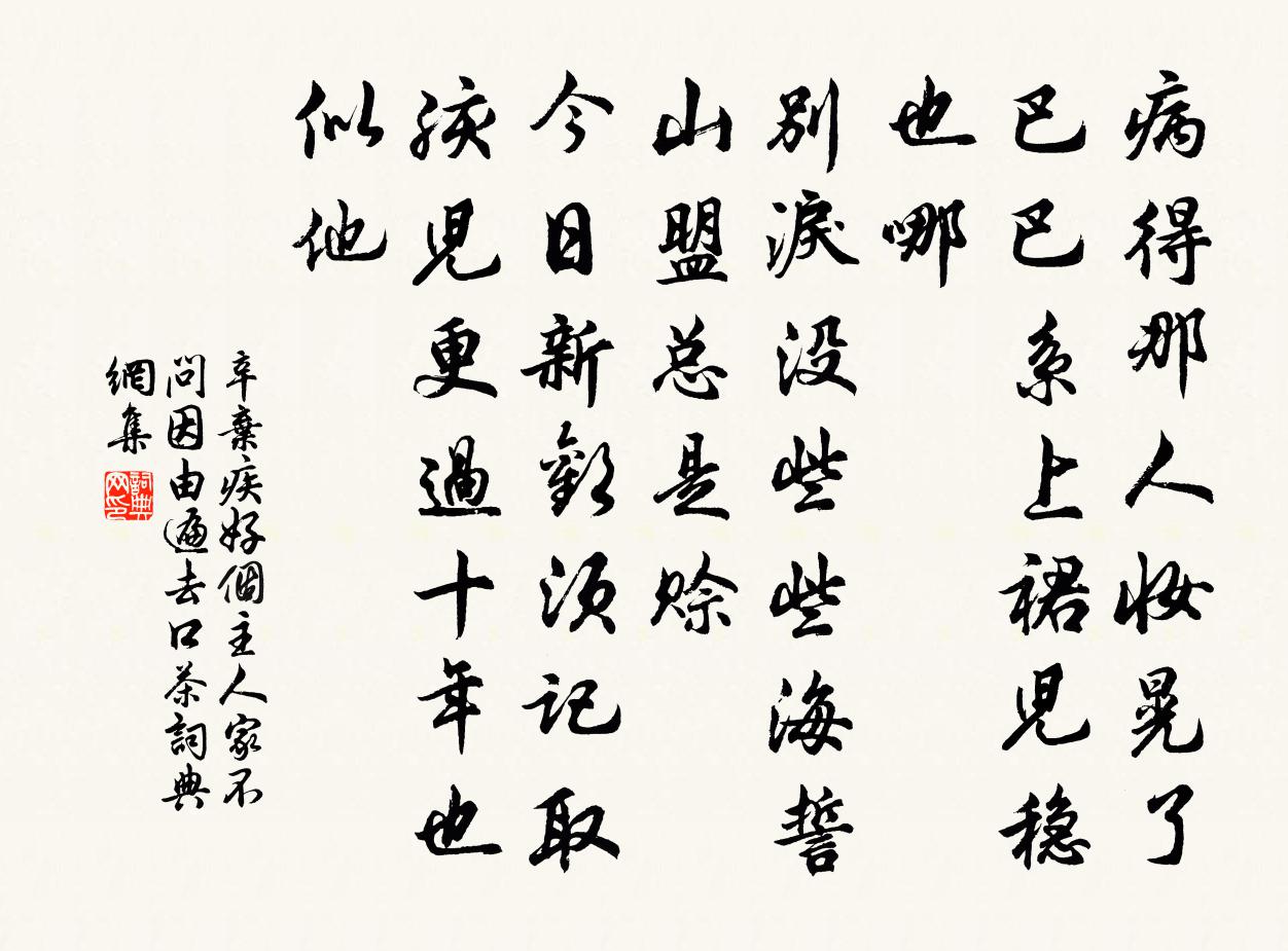 詩詞名句歷史字典書法欣賞書法字典國語詞典說文解字康熙字典古漢語字典標 題 作 者 詩 句 好個主人家,不問因由遍去[口茶]。作者:辛棄疾 朝代:宋代原文病得那人妝晃了,巴巴,繫上裙兒穩也哪。別淚沒些些,海誓山盟總是賒。今日新歡須記取,孩兒,更過十年也似他。詩詞問答問:《好個主人家,不問因由遍去[口茶]。》的作者是誰?答:辛棄疾問:該詩寫於哪個朝代?答:宋代問:該詩是什麼體裁?答:詞問:辛棄疾的名句有哪些?答:辛棄疾名句大全書法欣賞好個主人家,不問因由遍去[口茶]。書法作品詩詞推薦題殘雷琴銘譚嗣同〔清代〕破天一聲揮大斧,乾斷柯折皮骨腐,縱作良材遇已苦。遇已苦,嗚咽哀鳴莽終古!行住坐臥三十二頌釋印肅〔宋代〕主賓交接未開言,便過茶湯應口邊。察理聆音非外物,吉他歡喜萬千年。過太湖石塘三首楊萬里〔宋代〕每過松江得偉觀,玻璃盆底飣乾坤。天邊島嶼空無際,煙外人家澹有痕。笠澤古今多浪士,包山近遠在何村。季鷹情詩其四倉央嘉措〔清代〕欲題新詞寄嬌娘,風吹雨蝕半微茫。我有相思千般意,百磨不滅銘肝腸。八聲甘州李好古〔宋代〕古揚州、壯麗壓長淮,形勝絕東南。問竹西歌吹,蜀岡何許,楊柳鬖鬖。行樂誰家年少,兩兩更三三。知我江南客挽褚雪巘高士陳深〔宋代〕矯矯環中叟,清強八十餘。平生山水趣,盡力老莊書。黃鵠人間世,白雲天上居。蕉花吹又落,回首一唏噓。挽陳提舉趙善括〔宋代〕持斧威全振,分符盜易殲。真祠方賜逸,榮養遽難淹。許國心如在,繩家法正嚴。莫悲才不盡,祥覽臥寒苫。理菊趙蕃〔宋代〕攜鉏乘夏雨,分菊待秋風。幽事常關我,閒居不負公。苔深連竹地,籬破接蘭叢。更約兒童輩,須勤灌溉功。十一月二十日南至二首方回〔宋代〕風吹六十二年春,又見陽和一夜新。興廢親更三國事,死生暗易萬城人。種花縱好誰同賞,置酒良難自慣貧。今獨林景雲參學薛嵎〔宋代〕一門四世同堂樂,門外傳呼釋褐歸。自此高車訪游舊,屏將呵從叩漁扉。三冬晴暖春寒在,千里詩書野意違。又說和三門竇程寺丞見贈魏野〔宋代〕禹門分署似仙居,誰羨同年在直廬。閒制曲教鴉角唱,醉吟詩遣鳳毛書。蒙過村巷驚玄豹,命踏廳階上白驢。莫訝袖刺劉子翬〔宋代〕袖刺謁諸鄰,徘徊寄心賞。潭潭廣廈深,咳唾生餘響。茲邦懷地寶,比屋夸雄敞。如何蓬廬士,貧賤安所養。皇帝閣端午帖子詞宋庠〔宋代〕寶典靈辰舊,皇居瑞應偏。冰紈能辟暑,絲縷解延年。又用韻楊冠卿〔宋代〕窮巷無人車轍稀,尋巢燕子故飛飛。似嫌茅屋太低小,慶廈千間欣有歸。茲晨曾國藩〔清代〕茲晨何不樂?端念良自尤。自吾有爪觜,半啄匪躬謀。俯視見后土,仰視見光浮。關門赫婢僕,雄長如諸侯。專精長汀寄李使君戴復古〔宋代〕在處晚禾熟,經今瘴霧消。山林無盜賊,道路有歌謠。人喜逢豐歲,誰知感聖朝。溪橋閒寓目,魚鳥亦逍遙。次韻陳夢錫陳造〔宋代〕手板廣緣替荷鋤,從渠爭挾子公書。三年已辦青箱蠹,一飽才分代舍魚。煙燼萁爐朝兀兀,窗明風霰夜疎疎。獨思紹興十三年發皇后冊寶十三首佚名〔宋代〕款承祗事,時惟肅雍。跪奉冊炷,陳於法宮。以俯以仰,有德有容。明神介之,福祿來崇。錢神曾鞏〔宋代〕擊牲釃酒薦明蠲,飣果裝香婢僕專。揀米作糜分糝碗,折蓴為箸插芳筵。兒驚庖下添燻肉,神笑人間用紙錢。巫祝二和劉克莊〔宋代〕四傍山色青環郭,八面波光練抹坤。天造居然成別墅,帝招未肯入修門。愛蓮豈欲希周子,起蕝終難滯叔孫。介甫名句推薦多謝月相憐,今宵不忍圓。朱淑真《菩薩蠻·山亭水榭秋方半》 時見幽人獨往來,縹緲孤鴻影。蘇軾《卜運算元·黃州定慧院寓居作》 眼覷著災傷教我沒是處,只落得雪滿頭顱。張養浩《一枝花·詠喜雨》 千里黃雲白日曛,北風吹雁雪紛紛。高適《別董大二首》 威宜自嚴而寬,先寬後嚴者人怨其酷。洪應明《菜根譚·概論》 梅定妒,菊應羞。畫闌開處冠中秋。李清照《鷓鴣天·桂花》 風老鶯雛,雨肥梅子,午陰嘉樹清圓。周邦彥《滿庭芳·夏日溧水無想山作》 過也,人皆見之;更也,人皆仰之。孔子弟子《論語·子張篇》 騷屑西風弄晚寒,翠袖倚闌乾。納蘭性德《眼兒媚·詠紅姑娘》 我今因病魂顛倒,唯夢閒人不夢君。元稹《酬樂天頻夢微之》