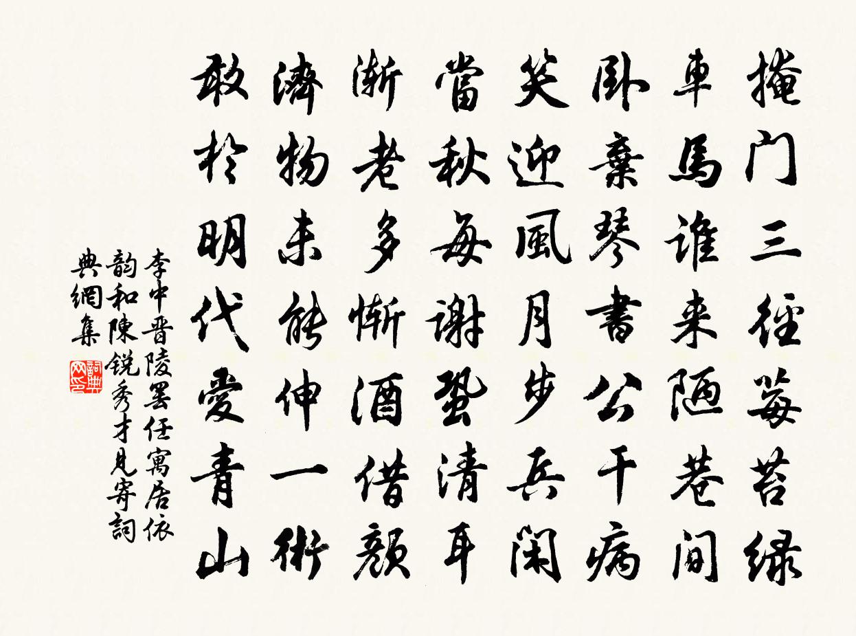 詩詞名句歷史字典書法欣賞書法字典國語詞典說文解字康熙字典古漢語字典標 題 作 者 詩 句 晉陵罷任寓居,依韻和陳銳秀才見寄作者:李中 朝代:唐代原文掩門三徑莓苔1/1綠,車馬誰來陋巷間。臥棄琴書公幹病,笑迎風月步兵閒。當秋每謝蛩清耳,漸老多慚酒借顏。濟物未能伸一術,敢於明代愛青山。詩詞問答問:《晉陵罷任寓居,依韻和陳銳秀才見寄》的作者是誰?答:李中問:該詩寫於哪個朝代?答:唐代書法欣賞晉陵罷任寓居,依韻和陳銳秀才見寄書法作品注釋全唐詩:卷749-2詩詞推薦自作真贊邵雍〔宋代〕松桂操行,鶯花文才。江山氣度,風月情懷。借爾面貌,假爾形骸。弄丸餘暇,閒往閒來。端午帖子皇帝閣周必大〔宋代〕暑衣先進聖皇宮,時服分頒百執同。惟有清躬衣浣濯,更令蠶織被華戎。偈頌七首釋思岳〔宋代〕芭蕉聞雷開,耳在什麽處。葵花隨日轉,眼在什麽處。若還眼耳分明,透出千門萬戶。雪夜呂定〔宋代〕漠漠同雲遍海涯,曉風寒逼綠窗紗。飛揚鱗甲三午界,妝點樓台百萬家。何處妙歌金帳酒,誰人清對玉梅花。便應大衍易吟四十首方回〔宋代〕屯初康險難,蒙上覺昏童。開闢乾坤後,君師大有功。都作院楊冠卿〔宋代〕天子除戎戒不虞,修車備器會東都。羽林憶昨厭弓矢,剡木弦弧兒戲爾。我公號令何精明,武庫森嚴耀五丘。威震幸少林寺應制宋之問〔唐代〕紺宇橫天室,迴鑾指帝休。曙陰迎日盡,春氣抱岩流。空樂繁行漏,香菸薄彩斿。玉膏從此泛,仙馭接浮丘。贈道者張蠙〔唐代〕得道疑人識,都城獨閉關。頭從白後黑,心向鬧中閒。饑渴唯調氣,兒孫亦駐顏。始知仙者隱,殊不在深山。再代和通字韻釋紹嵩〔宋代〕驛路穿林斷復通,客程蛇繞亂山中。三杯軟飽千林暝,萬事從來一笑空。珍重故人相問意,自憐羈客尚飄蓬。江湖華亭百詠前京城許尚〔宋代〕廬落皆無有,依稀古堞存。登臨認遺蹟,林莽暮煙昏。汴堤柳樂雷發〔宋代〕萬縷春風窣汴堤,錦帆何處柳空垂。流鶯應有兒孫在,問著隋朝總不知。餘杭界早發鄭起〔宋代〕早發促程期,籃輿帶月低。山中如白書,斗下渡清溪。群動霜初薄,四鄰雞未啼。惟聞兵遞舖,星急過淮西。酬成少尹駱谷行見呈岑參〔唐代〕聞君行路難,惆悵臨長衢。豈不憚險艱,王程剩相拘。憶昨蓬萊宮,新授刺史符。明主仍賜衣,價值千萬餘。何幸挈累來當塗聞已入境感懷有作二首吳芾〔宋代〕方與晴窗愛日親,若為天又作重陰。年來已是憂思過,老去那堪疾病侵。默數七旬寧幾日,更添一歲愈驚心。喜聞寄別楊憑〔唐代〕晚煙洲霧並蒼蒼,河雁驚飛不作行。回旆轉舟行數里,歌聲猶自逐清湘。偈慧日庵主〔宋代〕丘師伯莫曉,寂寂明皎皎。日午打三更,誰人打得了。草堂一上人戴叔倫〔唐代〕一公持一缽,相復度遙岑。地瘦無黃獨,春來草更深。竹湖李內翰哀詩二首劉克莊〔宋代〕自古稀全傳,於今獨重名。羞蒙彼相力,寧伴此群清。加璧猶堅臥,搘筇或散行。過江不大用,汪李兩端明。送令狐憲周度支知秀州梅堯臣〔宋代〕鬢絲不是吳蠶吐,未到吳中已成縷。清腸無繭自能生,窮愁便織連今古。論兵說劍三十秋,乃知功名難強取。往往登興元城觀烽火唐彥謙〔唐代〕漢川城上角三呼,扈蹕防邊列萬夫。褒姒冢前烽火起,不知泉下破顏無。名句推薦對酒當歌,人生幾何!曹操《短歌行》 窮巷多怪,曲學多辯。商鞅《商君書·更法》 畫船撐入花深處,香泛金卮。歐陽修《採桑子·荷花開後西湖好》 萬物迎春送殘臘,一年結局在今宵。戴復古《除夜》 愁顏與衰鬢,明日又逢春。戴叔倫《除夜宿石頭驛》 是數人之齒,而以為富。墨子《墨子·48章 公孟》 馬蹀閼氏血,旗裊可汗頭。岳飛《送紫岩張先生北伐》 春愁難遣強看山,往事驚心淚欲潸。丘逢甲《春愁》 漢口夕陽斜渡鳥,洞庭秋水遠連天。劉長卿《自夏口至鸚鵡洲夕望岳陽寄源中丞》 十五入漢宮,花顏笑春紅。李白《怨歌行》
