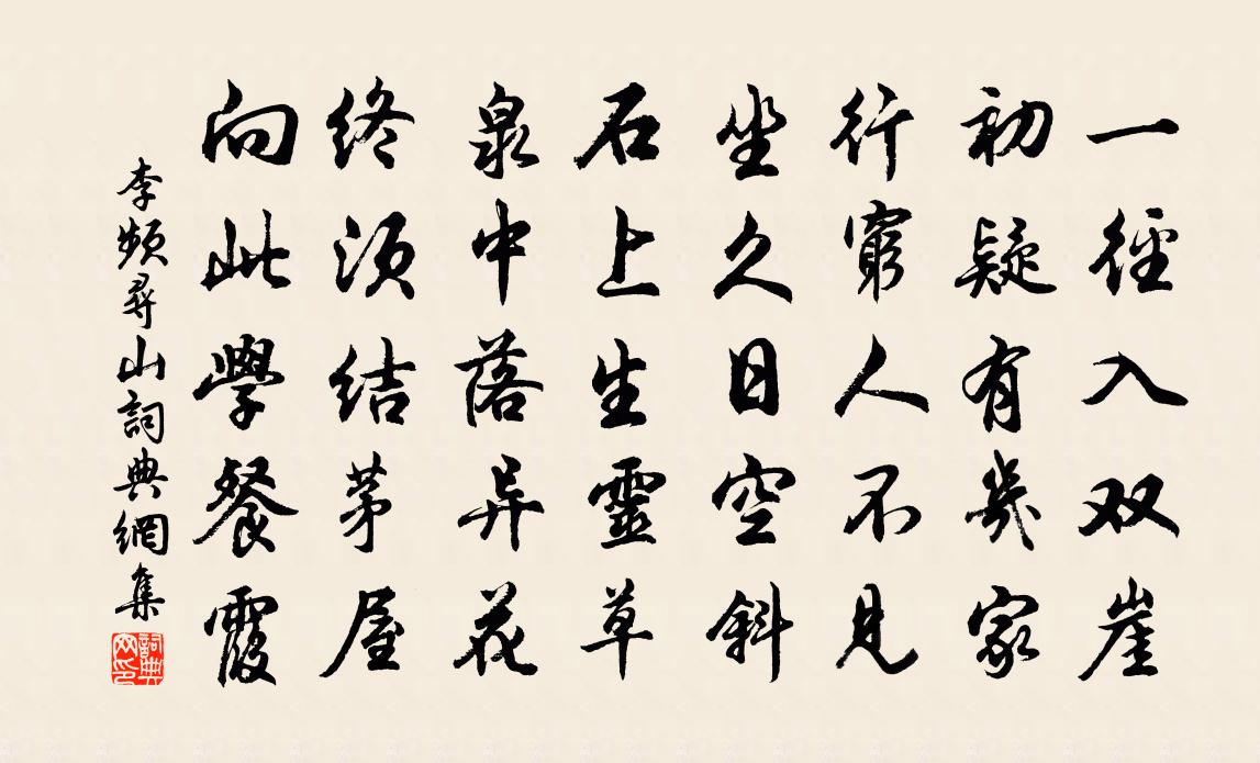 詩詞名句歷史字典書法欣賞書法字典國語詞典說文解字康熙字典古漢語字典標 題 作 者 詩 句 尋山作者:李頻 朝代:唐代尋山原文一逕入雙崖,初疑有幾家。行窮人不見,坐久日空斜。石上生靈草,泉中落異花。終須結茅屋,向此學餐霞。詩詞問答問:尋山的作者是誰?答:李頻問:尋山寫於哪個朝代?答:唐代問:尋山是什麼體裁?答:五律李頻尋山書法欣賞尋山書法作品注釋全唐詩:卷587-47詩詞推薦南雄郡守致怪石四株曾幾〔宋代〕只道無南雁,書今數往還。一窗江表地,數朵廣東山。奇甚君風骨,蒼然我面顏。歸時要船重,更為斸岩間。東林院何麟〔宋代〕此地非廬岳,東林邂逅過,我羞陶靖節,僧異遠頭陀。記夢舒岳祥〔宋代〕梅花清入夢,詩骨定非常。半樹原遮蘚,無風也自香。籃輿沖暮雪,茅舍帶晨霜。傍竹依松處,無心肯向陽。哀夏孝女鄭大惠〔宋代〕射生戶,北山有虎何不射。豈不聞夏家有女年十五,隨父樵薪入山塢,父行在前忽遭虎。女見父傷奮不懼,號泣逐初去郡齋書懷(一作初去郡書情)薛據〔唐代〕肅徒辭汝潁,懷古獨悽然。尚想文王化,猶思巢父賢。時移多讒巧,大道竟誰傳。況是疾風起,悠悠旌旆懸。征鳥酬堅大師陶夢桂〔宋代〕蜀山越嶠倦躋攀,拄杖經年掛壁間。駒隙光中驚迅速,龍泉山時占清閒。但存寶藏明珠在,不管石頭行路難。香冷從軍詩五首·其二王粲〔兩漢〕涼風厲秋節,司典告詳刑。我君順時發,桓桓東南征。泛舟蓋長川,陳卒被隰埛。征夫懷親戚,誰能無戀情。拊衿江城子 為張同知壽王惲〔元代〕灤江晴漾首山前。玉為淵。秀相連。總把華英,都付使君賢。梅竹堂深歌吹動,香似霧,酒如川。列城千里聽鳴弦和姚子敬秋懷趙孟頫〔元代〕搔首風塵雙短鬢,側身天地一儒冠。中原人物思王猛,江左功名愧謝安。苜蓿秋高戎馬健,江湖日短白鷗寒。金尊四明山中十絕茶焙戴表元〔宋代〕山深不見焙茶人,霜日清妍樹樹春。最有風情是岩水,味甘如乳色如銀。喜涼王鎡〔宋代〕吹笛何人在小樓,夜深不下玉簾鉤。涼風敲落梧桐葉,片片飛來儘是秋。鏡檻李商隱〔唐代〕鏡檻芙蓉入,香台翡翠過。撥弦驚火鳳,交扇拂天鵝。隱忍陽城笑,喧傳郢市歌。仙眉瓊作葉,佛髻鈿為螺。五里癸巳除夕偶成黃景仁〔清代〕年年此夕費吟呻,兒女燈前竊笑頻。汝輩何知吾自悔,枉拋心力作詩人。鄘風·柏舟佚名〔先秦〕泛彼柏舟,在彼中河。髧彼兩髦,實維我儀。之死矢靡它。母也天只!不諒人只!泛彼柏舟,在彼河側。髧彼兩髦入道詩十九首王慶升〔宋代〕羲文孔子一先天,互把精微著易篇。不用陰陽真正理,旁蹊曲徑是徒然。最明寺殿悟道後贈之助道頌五首釋普寧〔宋代〕老僧初到與三拳,埋恨胸中結此冤。痛恨忽消開正眼,方知吾不妄宣傳。賜資治通鑑呈范淳父學士張舜民〔宋代〕通鑑初成賜近臣,不遺疏賤布恩均。我投淮水五千里,君滯周南二十春。東觀汗青身是夢,西宮削稿事如新。細思庵壁題詩許宣平〔唐代〕隱居三十載,石室南山巔。靜夜玩明月,清朝飲碧泉。樵人歌壟上,谷鳥戲岩前。樂矣不知老,都忘甲子年。雪竇達觀禪師見寄依韻答梅堯臣〔宋代〕岩竇常留雪,山雪不有心。禪衣百衲重,香剎四明深。馴鹿來銜果,栽松去作林。自緣冠紱累,未解遠公尋。寄春膏牋與何同叔監簿因居古體張鎡〔宋代〕蘇州粉牋美如花,萍文霜粒古所夸。近年專制淺蠟色,軟玉瑩膩無纖瑕。盤門系纜高橋住,呼僮徑訪孫華鋪。琱鎪名句推薦君家玉女從小見,聞道如今畫不成。黃庭堅《謝張仲謀端午送巧作》 榮寵有初,鮮有終者;吉凶無常,智者少禍。來俊臣《羅織經·固榮卷第六》 和戎詔下十五年,將軍不戰空臨邊。陸游《關山月》 金陵津渡小山樓,一宿行人自可愁。張祜《題金陵渡》 木葉紛紛下,東南日煙霜。劉昚虛《暮秋揚子江寄孟浩然》 春思遠,誰嘆賞、國香風味。周密《繡鸞鳳花犯·賦水仙》 淚濕羅巾夢不成,夜深前殿按歌聲。白居易《後宮詞》 哀莫大於心死。莊子《莊子·外篇·田子方》 空門寂寞汝思家,禮別雲房下九華。金地藏《送童子下山》 綠楊煙外曉寒輕,紅杏枝頭春意鬧。宋祁《玉樓春·春景》