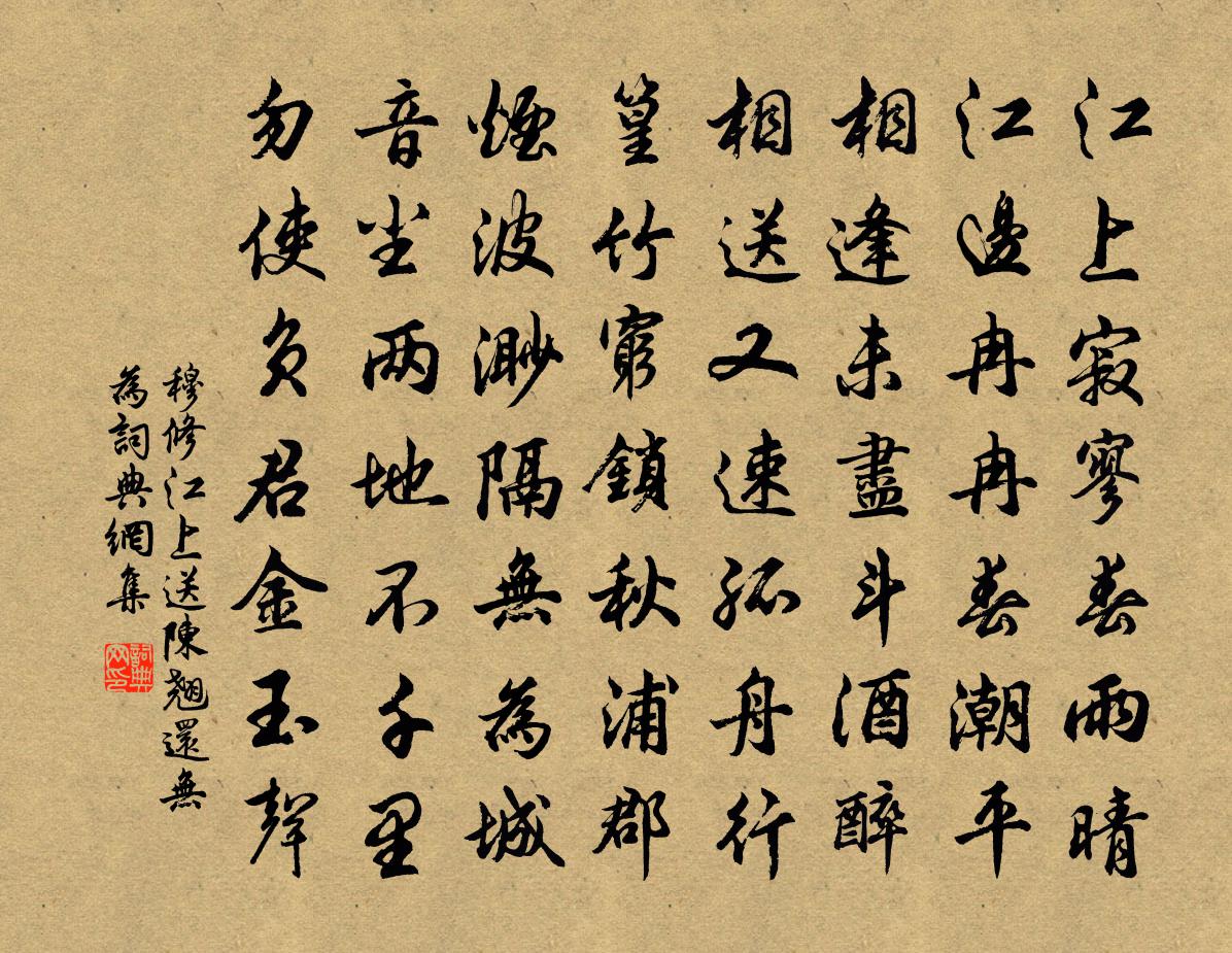 詩詞名句歷史字典書法欣賞書法字典國語詞典說文解字康熙字典古漢語字典標 題 作 者 詩 句 江上送陳翹還無為作者:穆修 朝代:宋代江上送陳翹還無為原文江上寂寥春雨晴,江邊冉冉春潮平。相逢未盡斗酒醉,相送又速孤舟行。篁竹窮鎖秋浦郡,煙波渺隔無為城。音塵兩地不千里,勿使負君金玉聲。詩詞問答問:江上送陳翹還無為的作者是誰?答:穆修問:江上送陳翹還無為寫於哪個朝代?答:宋代穆修江上送陳翹還無為書法欣賞江上送陳翹還無為書法作品詩詞推薦頌古四十四首釋師範〔宋代〕一年三百六十日,日日日從東畔出。昨夜黃昏又落西,茫茫無處尋蹤跡。送袁都官知徽州魏了翁〔宋代〕英英蓬省郎,表表秋官屬。劍佩行青霄,揚且鬢雙綠。掉頭不肯住,去作新安牧。班班萊氏衣,粲粲學了服。歸來諶仙詩王義山〔宋代〕冉冉飛霜綴綺裳,遙知諶母下丹陽。黃金鍊就三山藥,來采蒲花獻壽觴。次韻曹提管楚東之作洪咨夔〔宋代〕蕭騷兩岸落秋蓬,楚水西流不肯東。好酒但須知婦有,新涼莫問與誰同。片心置向嚚塵外,萬事留將醉眼中。喜得韓康公輓詞三首蘇軾〔宋代〕西第開東閣,初筵點後塵。笙歌邀白髮,燈火樂青春。扶路三更罷,回頭一夢新。賦詩猶墨濕,把卷獨沾巾。偈頌二十一首釋堅璧〔宋代〕仲冬嚴寒,一陽長至。佛祖有機關,俱落第二義。豈不見溈山寂子與香嚴,未免將泥土裡洗。徐竹隱王冕〔元代〕連江修竹靜郊居,門外陰陰千畝余。直節不移高士操,息交那與俗人書。臥聽翠雨飛瓴甋,笑挹清風過綺疏。卻掃聞馬文天祥〔宋代〕過海安來柰若何,舟人去後馬臨河。若非神物扶忠直,世上未應僥倖多。原仲致中寄梅雪二詩再次前韻劉子翬〔宋代〕一雪度臘寒不春,風光淡然溪谷濱。清湖讀易月當午,烏石掛廬梅照晨。未借流膏耕沃野,聊乘爽氣款蒼垠。嗣音蔬餐林泳〔宋代〕山人藜莧慣枯腸,上頓時憑般若湯。折項葫蘆初熟美,著毛蘿蔔久煨香。炊粱剪韭貧聊辦,煮餅澆蔥病未嘗。晦叔白髮繆鑒〔宋代〕老矣無心競寸陰,不知公道為何人。晴梳櫛齒千絲雪,靜掩梨花一鏡春。鑷處北兒愁是種,染來因藥怪無嗔。兒曹次韻周畏知問訊城東梅塢七首張栻〔宋代〕堤上已垂新柳,屋邊尚有錢梅。雪盡春生湖水,野航竟日悠哉。東林願禪師院崔塗〔唐代〕與世漸無緣,身心獨瞭然。講銷林下日,臘長定中年。磬絕朝齋後,香焚古寺前。非因送小朗,不到虎谿邊。雪霽玉堂曉眺程珌〔宋代〕當年銀界隔鯨江,今日分明玉作堂。不是瓊林宮樹密,也應 * 接明光。盧奉御自上都回見訪汪元量〔宋代〕詩人騎馬接官回,解後居庸懷抱開。冷地不禁風聒聒,炎天長見雪堆堆。昨宵我夢中南去,今日君從直北來。說盡春日雜書八首張耒〔宋代〕出門逢一士,韋布污塵土。延之升賓階,再拜色低沮。問來何所欲,涕下說貧窶。其求升斗爾,我亦不能具。我窮蝶戀花晁端禮〔宋代〕瀲灩長波迎鷁首。雨淡煙輕,過了清明候。岸草汀花渾似舊。行人只是添清瘦。瀋水香消羅袂透。雙櫓聲中,午夢送翁應叟翁卷〔宋代〕逢君亦姓翁,莫即是吾宗。遠自刺桐里,來看孤嶼峰。雖雲相識晚,宛若故情濃。回首秋風路,閩山復幾重。折丹桂(中秋南湖賞月)張鎡〔宋代〕玉為樓觀銀為地。秋到中分際。淡金光襯水晶球,上碧虛、千萬里。香風浩蕩吹蟾桂。影落澄波底。揭天簫鼓要詩幕客載酒舟中即席序別文天祥〔宋代〕故人滿江海,遊子下瀟湘。夢載月千里,意行雲一方。櫓聲人語小,岸影客心長。總是浮萍跡,飛花莫近檣。名句推薦路出寒雲外,人歸暮雪時。盧綸《李端公 / 送李端》 慎在於畏小;智在於治大尉繚《尉繚子·十二陵》 一生大笑能幾回,斗酒相逢須醉倒。岑參《涼州館中與諸判官夜集》 樵人歸欲盡,煙鳥栖初定。孟浩然《宿業師山房期丁大不至 / 宿業師山房待丁大不至》 半壁橫江矗起,一舟載雨孤行。歸莊《錦堂春·半壁橫江矗起》 女曰雞鳴,士曰昧旦。佚名《女曰雞鳴》 人間夢隔西風,算天上、年華一瞬。吳文英《惜秋華·七夕》 殘燈明滅枕頭欹,諳盡孤眠滋味。范仲淹《御街行·秋日懷舊》 長歌吟松風,曲盡河星稀。李白《下終南山過斛斯山人宿置酒》 將軍發白馬,旌節度黃河。李白《發白馬》