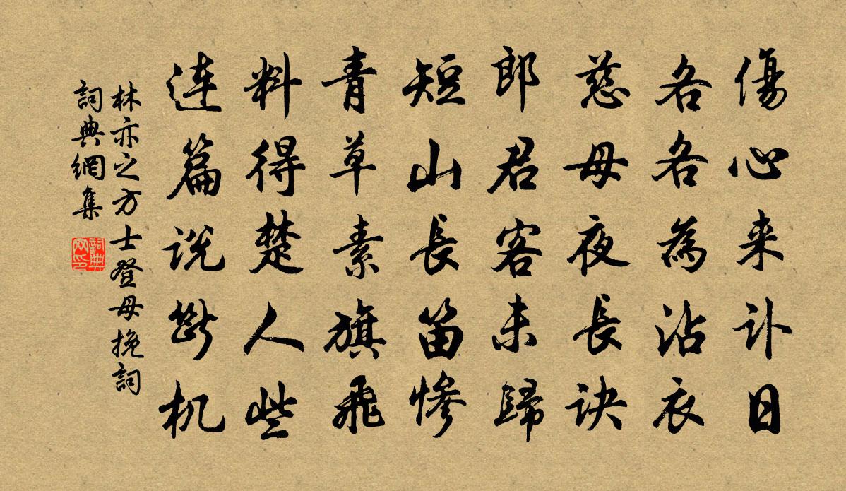 詩詞名句歷史字典書法欣賞書法字典國語詞典說文解字康熙字典古漢語字典標 題 作 者 詩 句 方士登母輓詞作者:林亦之 朝代:宋代方士登母輓詞原文傷心來訃日,各各為沾衣。慈母夜長訣,郎君客未歸。短山長笛慘,青草素旗飛。料得楚人些,連篇說斷機。詩詞問答問:方士登母輓詞的作者是誰?答:林亦之問:方士登母輓詞寫於哪個朝代?答:宋代林亦之方士登母輓詞書法欣賞方士登母輓詞書法作品詩詞推薦己酉九日次靖節是幾是日韻葉茵〔宋代〕采采籬下菊,熙熙白首交。挈觴酬佳節,先驚蒲柳凋。日月不兩與,名位空相高。巋然龍山青,千古擎丹霄。彼美野望二首楊萬里〔宋代〕野童擷菜疏移步,客子追程有底忙。茅屋破時偏入畫,布衫洗了曬枯桑。寄題滑台龍圖梅君新作西溪宋庠〔宋代〕遙羨西溪境,鳴笳從賞頻。蒲蓮應得地,魚鳥更留人。樹密藏川雨,堤長截路塵。清移嚴瀨月,歡陋習家春。按曲蝶戀花呂勝己〔宋代〕牆角栽梅分兩下。夾竹穿松,巧傍柴門亞。不似西湖明月夜。展開一片江南畫。老子尋芳心已罷。為愛孤高,結約陳督乾第一百二十五文天祥〔宋代〕挺身艱難際,虎穴連里閭。高天高恓惻,同盡隨丘墟。淳熙二年發太上皇帝太上皇后冊寶十一首佚名〔宋代〕蚴蟉青龍,婉嬗象興。其載伊何,煌煌金書。乃由端門,乃行康術。於以榮親,振古所無。偈二首釋清旦〔宋代〕三世諸佛不知有,一一面南看北斗。狸奴白牯卻知有,雲外金毛正哮吼。箇中隱顯現全身,頭頭透脫無前後。撥轉制幕孫君即益昌舍館疊石栽竹於盆池索賦程公許〔宋代〕好山意度如高人,偃蹇那肯來朱門。青油幕中盛快士,愛山惟恐不能致。昭亭東望天一涯,武擔亦復歸遲遲。開窗再和寄藍六黃庭堅〔宋代〕南極一星淮上老,承家令子氣橫秋。萬端只要稱心耳,五鼎何如委吏優。海燕催歸人作社,江花欲動雨含愁。追思使還,七里瀨上逢薛承規赴江西貶官劉長卿〔唐代〕遷客歸人醉晚寒,孤舟暫泊子陵灘。憐君更去三千里,落日青山江上看。送楊學士三首宋祁〔宋代〕觚稜初日九天開,躞蹀桑郊五馬回。群玉三山藏冊府,偃壺雙筆給中台。編堂舊政盤留薤,畫省新辭砌有苔。闕里直閣張功甫南湖集曾豐〔宋代〕百好何嘗一徇時,游心上與古相追。不容萬物移吾學,猶得余功到此詩。玄酒太羹無痛快,光風霽月有長思。披吟勸漢老弟飲酒虞儔〔宋代〕尊前一醉莫辭頻,三萬場當歲十旬。況有好詩能泣鬼,寧無妙畫可通神。快呼左手持螯客,莫著傾身障鹿人。綠漲蝶戀花·幾度鳳樓同飲宴馮延巳〔五代〕幾度鳳樓同飲宴。此夕相逢,卻勝當時見。低語前歡頻轉面,雙眉斂恨春山遠。蠟燭淚流羌笛怨。偷整羅衣,欲唱成都書事陸游〔宋代〕大城少城柳已青,東台西台雪正晴。鶯花又作新年夢,絲竹常聞靜夜聲。廢苑煙蕪迎馬動,清江春漲拍堤平。尊中臘雪次遲韻蘇轍〔宋代〕冬儲久未辦,佳雪為人留。谷豆入高廩,薪蒸轉十輈。紛紛了歲事,閔閔念農疇。家有二頃田,一頃種米麰。風聲送蕃叟弟赴江西帥幕分韻得獨字陳傅良〔宋代〕生平未省友松竹,愛言從宦輸幽獨。子也諸侯老賓客,襆被僅緣升斗祿。為問江神何世情,霽月光風送帆幅。天意次韻孔四著作北行滹沱黃庭堅〔宋代〕駝褐蒙風霜,雞聲眇墟里。青燈進豆粥,落月踏冰水。平生不龜藥,才可衛十指。持比千戶封,誰能優劣此。寒夜袁枚〔清代〕寒夜讀書忘卻眠,錦衾香盡爐無煙。美人含怒奪燈去,問郎知是幾更天!謝乾明滋老送炒團晁說之〔宋代〕蓼花散畔輕盈意,炒米糰邊笑語親。多謝稻畦磨衲老,十方撮聚戲閒人。名句推薦寵錫從仙禁,光華出漢京。張九齡《奉和聖制送尚書燕國公赴朔方》 悠悠卷旆旌,飲馬出長城。李世民《飲馬長城窟行》 玉勒雕鞍遊冶處,樓高不見章台路。歐陽修《蝶戀花·庭院深深深幾許》 淒淒歲暮風,翳翳經日雪。陶淵明《癸卯歲十二月中作與從弟敬遠》 一切都是命,半點不由人。佚名《增廣賢文·上集》 青林翠竹,四時俱備。陶弘景《答謝中書書》 燕子不知人去也,飛認闌乾。韓疁《浪淘沙·莫上玉樓看》 祿不患其不來,患祿來,而不能無愧其祿。王永彬《圍爐夜話·第四四則》 飢而欲食,寒而欲暖,勞而欲息,好利而惡害,是人之所生而有也。荀子《荀子·榮辱》 歌舞尊前,繁華鏡里,暗換青青發。薩都剌《念奴嬌·登石頭城次東坡韻》