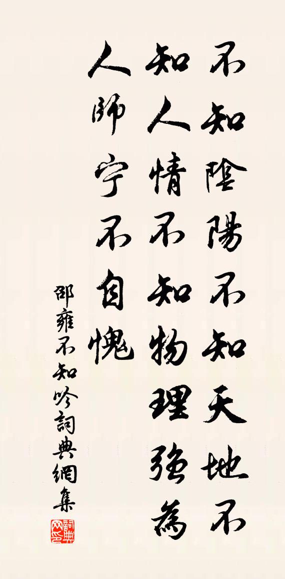 詩詞名句歷史字典書法欣賞書法字典國語詞典說文解字康熙字典古漢語字典標 題 作 者 詩 句 不知吟作者:邵雍 朝代:宋代不知吟原文不知陰陽,不知天地。不知人情,不知物理。強為人師,寧不自愧。詩詞問答問:不知吟的作者是誰?答:邵雍問:不知吟寫於哪個朝代?答:宋代邵雍不知吟書法欣賞不知吟書法作品詩詞推薦宴胡楚真禁所陳子昂〔唐代〕人生固有命。天道信無言。青繩一相點。白璧遂成冤。請室閒逾邃。幽庭春未暄。寄謝( 一作語 )韓安國。何立春日邂逅周文顯於子暢兄許飲酒論文歡有餘趙蕃〔宋代〕文字追秦漢,簞瓢保賤貧。延英空側席,下里老斯人。傾蓋寧嗟晚,推門莫厭頻。罷談芻狗用,且看土牛春。無準禪師鑄鐘偈釋祖欽〔宋代〕通身只是一張口,百鍊爐中{上六下衣去亠}出來。斷送夕陽歸去後,又催明月上樓台。過長橋張栻〔宋代〕西風吹短髮,復此渡長橋。木落波空闊,亭孤影動搖。徘徊念今昔,領略到漁樵。儻有山中隱,憑誰為一招。江陵即事王建〔唐代〕瘴雲梅雨不成泥,十里津樓壓大堤。蜀女下沙迎水客,巴童傍驛賣山雞。寺多紅藥燒人眼,地足青苔染馬蹄。夜半泛舟過吉澤陸游〔宋代〕蕭蕭菰蒲如荻林,五月已覺秋意深。煙波滅沒有漁艇,浦漵飛鳴多水禽。稽山出雲極奇變,陸子岸幘方微吟。一聲受用劉克莊〔宋代〕阮遙集平生幾屐,晏平仲半世一裘。禿翁受用能多少,槲葉為衣荷蓋頭。游龍門詩十二首西溪韓維〔宋代〕我從南嶺來,引轡下雲木。不知溪流處,但見翠滿谷。涼葉覆山泉,脩篁醫茅屋。壽馬裕齋觀文右東山,二章,章四句陳著〔宋代〕鳳凰于飛,出自幽谷。載好其音,集於灌木。寄題泉南陳氏步雲亭賀鑄〔宋代〕紫翠峰前水一灣,趣亭微徑白雲關。漁樵不見攜筇去,猿鶴相隨採藥還。晚月帶潮來海上,春風吹雨到人間。恨君金雞叫馬鈺〔元代〕元是神仙何不曉。聽予勸、家緣事小。迷津苦海須當跳。一個靈明,免使塵籠罩。物外澄心通密妙。常清淨、龍蟠雜歌謠辭。吳楚歌(一曰燕美人歌)張籍〔唐代〕庭前春鳥啄林聲,紅夾羅襦縫未成。今朝社日停針線,起向朱櫻樹下行。句孟浩然〔唐代〕微雲淡河漢,疏雨滴梧桐。逐逐懷良馭,蕭蕭顧樂鳴。(《省試騏驥長鳴》,詩見《丹陽集》)田舍即事十首劉克莊〔宋代〕溪上漁郎占斷春,一川碧浪映紅雲。問渠定是神仙否,艣去如飛語不聞。張上舍送望水偶成小詩杜范〔宋代〕我受東南隅,去海不逾咫。乘潮厭鮮美,望水快珍脆。朅來以溪上,河魚僅青鯉。泥滓漬膚肉,強食輒三噦。此物偶成晁公溯〔宋代〕深深小合夜籠香,日上珠簾逗曉光。為喚蜀帷春睡起,翠盆添水試新妝。飲袁提學林亭方回〔宋代〕古淡林縈沼,清輝日漏雲。百梅先世植,一鶴舊侯分。天引吟懷遠,春供飲意醺。徐卿二雛者,已解聽論文。送程桂軒子方還羅治先墓方回〔宋代〕周宣中興常武雅,程伯休父為司馬。其先重黎掌天地,此佐尹氏征伐者。顏曾思復有七篇,孰雲軻死道不傳。洛中菩薩蠻李真人〔元代〕還丹秘訣將何作。因師口授親糟粕。未悟莫施為。前程路**。尋文終不的。義在文中出。文義縱惺惺。摶量早晚均台辭二首陳與義〔宋代〕東家西家爾盍來,聽說空圄如春台。決曹高臥印生綠,叢棘化為交遜木。策勛此木那可遺,動地風搖枝不曲。願我名句推薦絕景良時難再並,他年此日應惆悵。劉禹錫《八月十五夜桃源玩月》 心者修裔之根,未有根不植而枝葉榮茂者。洪應明《菜根譚·概論》 度德而處之,量力而行之左丘明《左傳·隱公·隱公十一年》 寒來暑往,秋收冬藏。周興嗣《千字文·全文》 惜恐鏡中春。不如花草新。張先《菩薩蠻·憶郎還上層樓曲》 春宵苦短日高起,從此君王不早朝。白居易《長恨歌》 行雲歸楚峽,飛夢到揚州。晁補之《臨江仙·綠暗汀洲三月暮》 且就洞庭賒月色,將船買酒白雲邊。李白《游洞庭湖五首·其二》 荷笠帶斜陽,青山獨歸遠。劉長卿《送靈澈上人》 一生之內, 當無愧古人姚察、姚思廉《梁書·列傳·卷二十九》