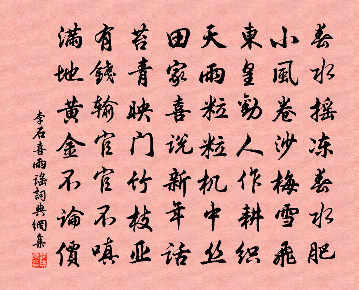 詩詞名句歷史字典書法欣賞書法字典國語詞典說文解字康熙字典古漢語字典標 題 作 者 詩 句 喜雨謠作者:李石 朝代:宋代喜雨謠原文春水搖凍春水肥,小風卷沙梅雪飛。東皇勸人作耕織,天雨粒粒機中絲。田家喜說新年話,苔青映門竹枝亞。有錢輸官官不嗔,滿地黃金不論價。詩詞問答問:喜雨謠的作者是誰?答:李石問:喜雨謠寫於哪個朝代?答:宋代李石喜雨謠書法欣賞喜雨謠書法作品詩詞推薦送交代王公輔洪咨夔〔宋代〕興州乳臭腥紅袍,萬馬夾擁橫磨刀。奴顏婢舌競動進,羅拜狗彘護優猱。漢家衣冠余兩豪,卻立渠肯污腥臊。傳呼節使少師王公輓詩二首李彌遜〔宋代〕晚歲閩江上,來從竹下賢。肯為文字飲,時訪祖師禪。念舊藏遺墨,忘形出近編。忍頌一卮酒,揮淚對新阡。初六日雨而甚微趙蕃〔宋代〕旱勢若燎火,雨粒如投珠。望望恐不及,嗷嗷欲成呼。叩龍探古湫,號佛喧通衢。山川禱斯必,社稷報不渝。古人宮詞林龍遠〔宋代〕桃李六宮寂,君王幸石渠。臨鸞梅梳洗,女色不如書。酬程嘉定楊漢州見和三首洪咨夔〔宋代〕詩禮椎徐徐,律令符急急。翛然世紛遠,愛此山斗人。政無勸課條,功蔑捕虜級。尺清蓋丈渾。過眼秋已及。濁暑踏莎行譚處端〔元代〕雲水閒人,婪耽布素。逍遙物外煙霞步。存心乞化度朝昏,巡門諾須分付。水定雲閒,不隨他去。煙消滅清涼趣。紹熙別廟二首真宗〔宋代〕祥發俔天,符彰夢日。有懷慈容,孝享廟室。泰尊是酌,旨酒嘉粟。靈其格思,祚以元吉。永嘉行張籍〔唐代〕黃頭鮮卑入洛陽,胡兒執戟升明堂。晉家天子作降虜,公卿奔走如牛羊。紫陌旌幡暗相觸,家家雞犬驚上屋。婦人偈頌一百二十三首釋祖欽〔宋代〕事有萬殊,法無異說。寒但言寒,熱但言熱。小宴陸游〔宋代〕洗君鸚鵡杯,酌我蒲萄醅。冒雨鶯不去,過春花續開。英雄漫青史,富貴亦黃埃。今夕湖邊醉,還須秉燭回。雪中寄令狐相公,兼呈夢得白居易〔唐代〕兔園春雪梁王會,想對金罍詠玉塵。今日相如身在此,不知客右坐何人。長安即事林寬〔唐代〕暝鼓才終復曉雞,九門何計出沉迷,樵童亂打金吾鼓,豪馬爭奔丞相堤。翡翠鬟欹釵上燕,麒麟衫束海中犀。須知【雙調】楚天遙過清江引薛昂夫〔元代〕花開人正歡,花落春如醉。春醉有時醒,人老歡難會,一江春水流,萬點楊花墜。誰道是楊花?點點離人淚!回首菊無可〔唐代〕東籬搖落後,密艷被寒催。夾雨驚新拆,經霜忽盡開。野香盈客袖,禁蕊泛天杯。不共春蘭並,悠揚遠蝶來。渡漢江宋之問〔唐代〕嶺外音書斷,經冬復歷春。近鄉情更怯,不敢問來人。答李侍郎嘉定庚長冬這官成都至城外驛侍郎亦崔與之〔宋代〕柏竹老歲寒,梅礬澹春風。邂後萬里橋,相對雙鬢蓬。論心豈無酒,舉盞不忍空。恐渠道旁嗤,咄咄醉頰紅。送以詠史詩魯城胡曾〔唐代〕魯公城闕已丘墟,荒草無由認玉除。因笑臧孫才智少,東門鐘鼓祀鶢鶋。頌證道歌證道歌釋印肅〔宋代〕調古神清風自高,忘榮傲世性堅牢。示一往還無個事,見人搖手莫忉忉。十二時(一曲)范祖禹〔宋代〕轉招搖。厚陵回望,雙闕起岧嶢。曉日麗譙。金爵上乾霄。風雨闋,夜宮閉,不重朝。奉鸞鑣漸遙。玉京知何處,次韻朱晦翁十梅疏梅王炎〔宋代〕詩人自情親,俗子極交淺。所以疏著花,即之風韻遠。名句推薦利人乎即為,不利人乎即止。墨子《墨子·32章 非樂(上)》 馬作的盧飛快,弓如霹靂弦驚。辛棄疾《破陣子·為陳同甫賦壯詞以寄之》 焚琴煮鶴從來有,惜玉憐香幾個知!馮夢龍《醒世恆言·卷三》 歌里千重意,才欲歌時淚已流,恨應更、多於淚杜安世《卜運算元·樽前一曲歌》 富貴必從勤苦得,男兒須讀五車書。杜甫《柏學士茅屋》 取酒須勤醉,鄉關不可思。司馬光《送張寺丞覲知富順監》 燕子欲歸時節,高樓昨夜西風。晏殊《破陣子·燕子欲歸時節》 心心視春草,畏向階前生。王維《雜詩三首 / 雜詠三首》 學問無大小,能者為尊。李汝珍《鏡花緣·第二十三回》 閒碾鳳團消短夢,靜看燕子壘新巢。周邦彥《浣溪沙·水漲魚天拍柳橋》
