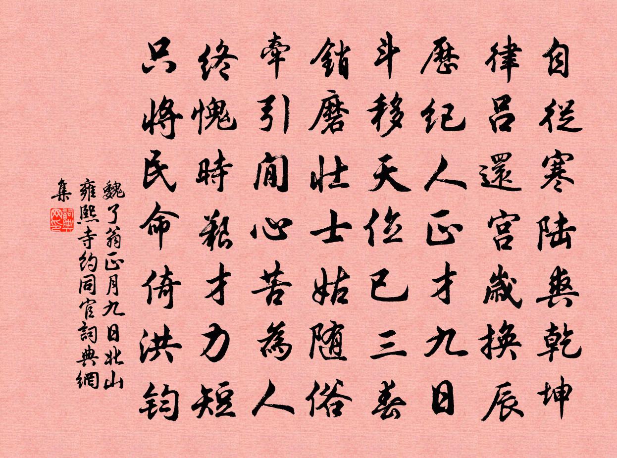 詩詞名句歷史字典書法欣賞書法字典國語詞典說文解字康熙字典古漢語字典標 題 作 者 詩 句 正月九日北山雍熙寺約同官作者:魏了翁 朝代:宋代正月九日北山雍熙寺約同官原文自從寒陸爽乾坤,律呂還宮歲換辰。曆紀人正才九日,斗移天位已三春。銷磨壯士姑隨俗,牽引閒心苦為人。終愧時艱才力短,只將民命倚洪鈞。詩詞問答問:正月九日北山雍熙寺約同官的作者是誰?答:魏了翁問:正月九日北山雍熙寺約同官寫於哪個朝代?答:宋代魏了翁正月九日北山雍熙寺約同官書法欣賞正月九日北山雍熙寺約同官書法作品詩詞推薦臨江仙(中秋夜雨次石敦夫韻)姚述堯〔宋代〕萬石家聲夸第一,清材更美姿容。笑談落落與誰同。煙分丹篆碧,香泛小槽紅。準擬中秋圓月好,暮雲忽翳晴空。秋來益覺頑健時一出遊意中甚適雜賦五字陸游〔宋代〕輕裝兩衣笈,假寢一胡床。喚渡江樓下,逢僧縣驛傍。橫林生夕靄,孤蝶弄秋光。老慣人間事,無詩寄斷腸。岳陽雲夢亭看蓮花崔櫓〔唐代〕似醉如慵一水心,斜陽欲暝彩雲深。清明月照羞無語,涼冷風吹勢不禁。曾向楚台和雨看,只於吳苑弄船尋。當時春入鯉湖徐夤〔唐代〕到來峭壁白雲齊,載酒春遊渡九溪。鐵嶂有樓霾欲墮,石門無鎖路還迷。湖頭鯉去轟雷在,樹杪猿啼落日低。回首句胡君防〔宋代〕水邊閒詠處,雲島月斜明。和李公擇赴歷下道中雜詠十二首其十一梁山洎蘇轍〔宋代〕花開南北一般紅,路過江淮萬里通。飛蓋靚妝迎客笑,鮮魚白酒醉船中。秋日懷王專魏野〔宋代〕菊花原上立,村落雨睛初。晚吹清群物,秋光澹太虛。空看新雁字,不得故人書。猶賴華亭鶴,林閒伴索居。雪中雪坡十憶姚勉〔宋代〕倚空銀管立嵯峨,看雪須登窣堵波。一覽瓊田三萬頃,分明掌上見山河。廳前柏元稹〔唐代〕廳前柏,知君曾對羅希奭。我本癲狂耽酒人,何事與君為對敵。為對敵,洛陽城中花赤白。花赤白,囚漸多,花之行住坐臥三十二頌釋印肅〔宋代〕聞道真空不著言,信心清淨在拳拳。只將此性光明遍,語默行藏豈離禪。對芳樽廣韋蘇州詩作姜特立〔宋代〕對芳樽,老來萬事不足論。朱唇皓腕年少伴,青山白雲居古鄰。對芳樽,老來萬事不足論。叔與戲雲謂我窮我嘗傷食從而嘲之晁補之〔宋代〕羊踏胸中昨夜蔬,不應捫腹怪如壺。婦家得餔猶須忍,莫索檳榔笑爾臞。失調名王詵〔宋代〕帶了黃花,強飲茱萸酒。寄育王東生和尚釋雲岫〔宋代〕三十餘年無故人,只留雲外伴間身。夜來夢入宸奎閣,戶牖重開見日輪。驀山溪 贈衡陽妓陳湘黃庭堅〔宋代〕鴛鴦翡翠,小小思珍偶。眉黛斂秋波,盡湖南、山明水秀。娉娉裊裊,恰近十三餘,春未透。花枝瘦。正是愁時候贈田九判官(梁丘)杜甫〔唐代〕崆峒使節上青霄,河隴降王款聖朝。宛馬總肥春苜蓿,將軍只數漢嫖姚。陳留阮〔王禹〕誰爭長,京兆田郎早見招別沈處士杜牧〔唐代〕舊事參差夢,新程邐迤秋。故人如見憶,時到寺東樓。次韻靈鷲清長老二首方回〔宋代〕粗讀書難盡信書,世誰鯁直但何諛。平生湖海悲遊子,晚歲乾坤老腐儒。知己尚堪抬醉眼,從僧似欲剃吟須。可當枕邊武衍〔宋代〕枕邊清坐散餘酲,慘澹西窗月半明。燕子夢回簾未卷,楝花風信曉寒輕。賀新郎(姑蘇台觀雪)盧祖皋〔宋代〕十頃涵空碧。畫圖中、崢嶸幻玉,亂零吹璧。倚遍危闌吟不盡,把酒風前岸幘。記當日、西湖為客。誰翦吳淞江上名句推薦橫眉冷對千夫指,俯首甘為孺子牛。魯迅《自嘲》 臘盡愁難盡,春歸人未歸。馮夢龍《喻世明言·卷一》 枕上十年事,江南二老憂,都到心頭。徐再思《水仙子·夜雨》 衣不如新,人不如故。佚名《古艷歌》 以地事秦,譬猶抱薪而救火也,薪不盡,則火不止。劉向《戰國策·魏三·華軍之戰》 柳絮風輕,梨花雨細。謝逸《踏莎行·柳絮風輕》 家貧出孝子,國亂顯忠臣!佚名《增廣賢文·下集》 奸不自招,忠不自辯。奸者禍國,忠者禍身。來俊臣《羅織經·察奸卷第八》 以三寸之舌,彊於百萬之師。司馬遷《史記·平原君虞卿列傳》 不聞爺娘喚女聲,但聞黃河流水鳴濺濺。佚名《木蘭詩 / 木蘭辭》