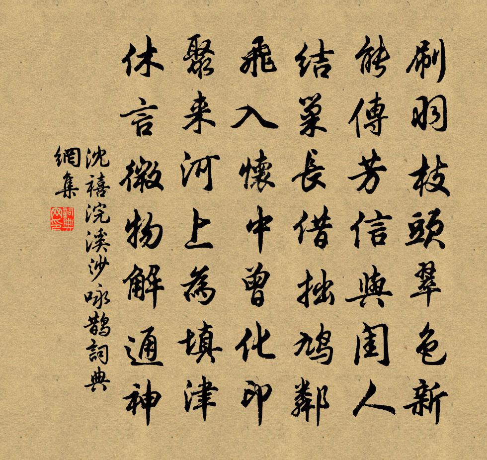 詩詞名句歷史字典書法欣賞書法字典國語詞典說文解字康熙字典古漢語字典標 題 作 者 詩 句 浣溪沙 詠鵲作者:沈禧 朝代:元代浣溪沙 詠鵲原文刷羽枝頭翠色新。能傳芳信與閨人。結巢長借拙鳩鄰。飛入懷中曾化印,聚來河上為填津。休言微物解通神。詩詞問答問:浣溪沙 詠鵲的作者是誰?答:沈禧問:浣溪沙 詠鵲寫於哪個朝代?答:元代問:浣溪沙 詠鵲是什麼體裁?答:詞沈禧浣溪沙 詠鵲書法欣賞浣溪沙 詠鵲書法作品詩詞推薦諸公詠探春花二首張明中〔宋代〕飛瓊將命下瑤台,欲探新春口未開。剛被東風留住著,卻酡醉臉未歸來。【雙調】夜行船_院宇深沉人佚名〔元代〕院宇深沉人靜悄,冷清清寶獸煙消。四壁秋蟲,一簾疏雨,兩般兒斗來相惱。 【麼】一夜先爭十歲老,悶厭厭和余時中元夕二首王之道〔宋代〕今夕知何夕,熙熙萬室春。歌樓醒醉客,燈市往來人。勸酒行杯促,聯詩得句新。銅壺休見迫,歡笑正相親。小閣省心舒岳祥〔宋代〕避地逃名花時臧,春風何事轉桑樞。退藏小閣收心靜,閒下危階放步徐。身到衰時方學道,眼當昏處始觀書。一生句胡仔〔宋代〕白髮惟公道,春風不世情。鵲踏枝馮延巳〔唐代〕秋入蠻蕉風半裂,狼籍池塘,雨打疏荷折。繞砌□聲芳草歇,愁腸學盡丁香結。回首西南看晚月,孤雁來時,塞管經汾陽舊宅趙嘏〔唐代〕門前不改舊山河,破虜曾經馬伏波。今日獨經歌舞地,古槐疏冷夕陽多。八聲甘州 讀諸葛武侯傳王質〔宋代〕過隆中、桑柘倚斜陽,禾黍戰悲風。世若無徐庶,更無龐統,沈了英雄。本計東荊西益,觀變取奇功。轉盡青天粟點絳唇陳亮〔宋代〕煙雨樓台,曉來獨上無滋味。落花流水。掩映漁樵市。酒聖詩狂,只遣愁無計。頻凝睇。問人天際。曾見歸舟未。東畿舟居阻雪懷寄二三知舊三首之一賀鑄〔宋代〕舟路江淮永,歲寒冰雪深。戍期良敦迫,王畿方滯淫。疲筋苦跧臥,行藥長川陰。雲物接平陸,不見西飛禽。風從傲將軍歌贈周叔子馬帥劉宰〔宋代〕君不見細柳將軍專號令,壁門不受天子命。又不見隆中將備天下奇,屈致不可就見之。丈夫意氣類如此,達則守官逍遙詠宋太宗〔宋代〕知之修練但辛勤,苦志由來離六塵。金鼎乍分紅燄火,月魂高鎖碧潭津。深思五嶺凡間路,好作三天物外人。萬里禪人並化主寫真求贊釋正覺〔宋代〕雲水之身,叢林之人。眉毛長蓋眼,鼻孔直欺唇。等閒西院兩聲錯,急快雲門一路親。不肯割城還奪璧,相如肝膽新辟小園陸游〔宋代〕席地幕天君勿嘲,隨宜野蔌與山殽。幽花避日藏深葉,歸燕尋人理舊巢。曲水詠觴空念昔,斜川鄰曲自論交。清貧自鹹平至太康鞍馬間得十小詩寄懷晏叔原並問黃庭堅〔宋代〕四十垂垂老,文章豈更新。鼻端如可斲,猶擬為揮斤。黃龍三關釋慧開〔宋代〕佛手紡腳生緣,非佛非道非禪。莫怪無門關險,結盡衲子興冤。早秋感懷張耒〔宋代〕永日付悠悠,年華逝不留。風聲送殘暑,雲色淡新秋。吾道倘有待,窮通寧遽憂。朝來望清潁,一雁下汀洲。杭州祝濤頭二首徐凝〔唐代〕不道沙堤盡,猶欺石棧頑。寄言飛白雪,休去打青山。倒打錢塘郭,長驅白浪花。吞吳休得也,輸卻五千家。送張季平歸永嘉鄭剛中〔宋代〕霜葉搖風九月秋,披披歸袖挽難留。知君久作陶山夢,無意相從鄭谷游。率略杯盤常共醉,艱難身世最同憂。人情答陳拾遺贈竹簪張九齡〔唐代〕與君嘗此志,因物復知心。遺我龍鍾節,非無玳瑁簪。幽素宜相重,雕華豈所任。為君安首飾,懷此代兼金。名句推薦未收天子河湟地,不擬回頭望故鄉。令狐楚《少年行四首·其三》 奔車之上無仲尼,覆舟之下無伯夷。韓非及後人《韓非子·安危》 馬嘶經戰地,雕認打圍山。王鎡《塞上曲》 晚來天欲雪,能飲一杯無?白居易《問劉十九》 會天大雨,道不通,度已失期司馬遷《陳涉世家》 自憐十五餘,顏色桃李紅。李白《長干行二首》 陶潛酷似臥龍豪,萬古潯陽松菊高龔自珍《己亥雜詩·其一百三十》 十日春寒不出門,不知江柳已搖村。蘇軾《正月二十日往岐亭郡人潘古郭三人送余於女王城東禪莊院》 枯楊枯楊爾生稊,我獨七十而孤棲。李白《雉朝飛》 欲共柳花低訴,怕柳花輕薄,不解傷春。黃孝邁《湘春夜月·近清明》