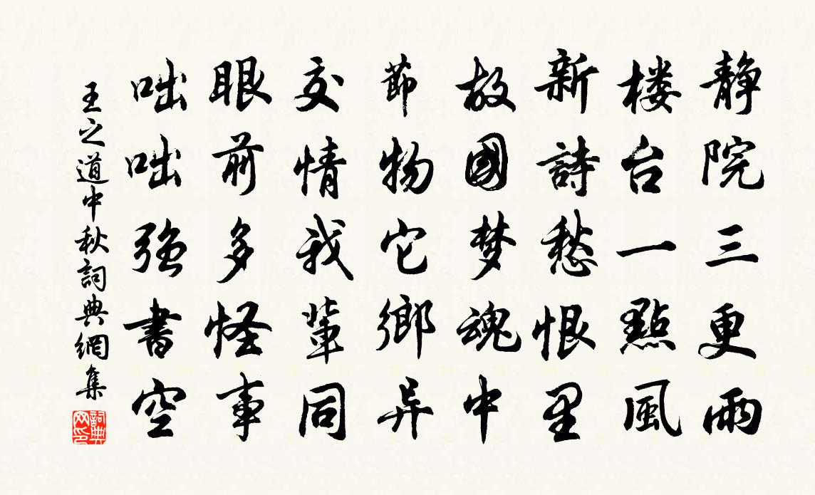 詩詞名句歷史字典書法欣賞書法字典國語詞典說文解字康熙字典古漢語字典標 題 作 者 詩 句 中秋作者:王之道 朝代:宋代中秋原文靜院三更雨,樓台一點風。新詩愁恨里,故國夢魂中。節物它鄉異,交情我輩同。眼前多怪事,咄咄強書空。詩詞問答問:中秋的作者是誰?答:王之道問:中秋寫於哪個朝代?答:宋代王之道中秋書法欣賞中秋書法作品詩詞推薦燕居十六首彭龜年〔宋代〕競索駕高車,吾寧守戶樞。安能念榮悴,且欲辨賢愚。偶成梅詠三首張嵲〔宋代〕故園微路繞江乾,常記開時偪歲寒。萬晨臨風驚老眼,卻疑還是霧中看。偶題張伯威〔宋代〕壺中別景絕塵埃,不是山靈閟不開。午夜月華冬雪,為無人向此時來。內人臂白鸚鵡圖陳深〔宋代〕華清宮中歌既醉,南海奇禽無爭致。玉環最愛雪衣孃,當時曾得龍顏媚。璿房雕檻春日長,繡繃嬌兒在傍戲。君王和耘老弟木犀詩韻且督漢老弟同賦虞儔〔宋代〕團餅秋光入好枝,一天風露最清時。管窺豹霧岩前隱,杯泛鵝黃月下宜。子落誰賡滄海詠,叢生應有小山知。惠連侍郎亭黃庚〔宋代〕東鄰花圃栽雙松,一朝煨燼枝葉空。侍郎庭前有雙松,至今古色摩蒼穹。此木受記本千栽,扶持若有神始終。天留度洛因泛舟東下數里頗憶淮上張耒〔宋代〕沄沄清洛轉山隈,渺渺東流不復回。輕鳥竟隨青嶂去,亂波爭泛夕陽來。偶驚舟楫鄉心起,乍脫塵埃病眼開。疑是城南道中有感陸游〔宋代〕行李蕭然一束書,城南觸目更愁予。市門乞食僧持缽,關路喔詩客跨驢。殘發無多真已矣,名山未去獨何歟?芒鞋送虞城劉明府謁魏郡苗太守高適〔唐代〕天官蒼生望,出入承明廬。肅肅領舊藩,皇皇降璽書。茂宰多感激,良將復吹噓。永懷一言合,誰謂千里疏。對酒雜興十二首方回〔宋代〕魯論安昌侯,田至二百頃。後堂羅曲旃,女樂極妍靚。晚愛肥牛亭,僭上輒有請。行內憂外家,略不效忠鯁。口張行役縣西喜雨寄任公漸大夫黃庭堅〔宋代〕行役勞人望縣齋,心如枯井喜塵埃。青燈簾外蕭蕭雨,破夢山根殷殷雷。新麥欲連天際好,濃雲猶傍日邊來。田歌銅陵縣步項安世〔宋代〕二年三過銅陵縣,欲采蘋花意自羞。他日夢中應記得,淺山銜縣水銜州。太真入宮圖二首趙文〔宋代〕夾道千花護彩雲,三郎馬上不勝情。誰知繡幰深深許,中有漁陽百萬兵。魏元履國錄挽章二首呂祖謙〔宋代〕群公祖疏傳,多士送陽城。短棹非前約,長亭及此行。深留移白日,共語只蒼生。會續山陽賦,鄰人笛未橫。賞柳吟金朋說〔宋代〕舞翠垂絲來小橋,春風庭院鳥聲嬌。自從靖節蕭速後,復許誰人不折腰。偈頌四十一首釋普寧〔宋代〕向上一路滑,壁立千仞險。南禪不立階級,直與當頭坐斷。天門街西觀榮王聘妃(榮王,憲宗幼子)張光朝〔唐代〕仙媛來朱邸,名山出紫微。三周初展義,百兩遂言歸。鄭國通梁苑,天津接帝畿。橋成烏鵲助,蓋轉鳳凰飛。霜仗題趙園宗澤〔宋代〕鑿池智有泉源,種木胸無芥蒂。螭頭吐水涓涓,端是銀潢一派。暮秋重過山僧院李頻〔唐代〕卻接良宵坐,明河幾轉流。安禪逢小暑,抱疾入高秋。靜室聞玄理,深山可白頭。朝朝獻林果,亦欲學獼猴。戊午生朝和居厚弟五絕劉克莊〔宋代〕靈龜曳尾防鑽殼,老蚌潛光怕剖珠。史筆久無兩龔傳,畫家曾有二疏圖。名句推薦順風而呼,聲非加疾也,而聞者彰。荀子《勸學》 水上遊人沙上女,回顧,笑指芭蕉林里住。歐陽炯《南鄉子·畫舸停橈》 雪洗虜塵靜,風約楚雲留張孝祥《水調歌頭·和龐佑父》 三千丈清愁鬢髮,五十年春夢繁華。喬吉《折桂令·客窗清明》 薄晚西風吹雨到。明朝又是傷流潦。王國維《蝶戀花·百尺朱樓臨大道》 風起,雪飛炎海變清涼。蘇軾《定風波·南海歸贈王定國侍人寓娘》 雲山有意,軒裳無計,被西風吹斷功名淚劉致《山坡羊·燕城述懷》 多情卻被無情惱。蘇軾《蝶戀花·春景》 卻恨悲風時起,冉冉雲間新雁,邊馬怨胡笳。葉夢得《水調歌頭·秋色漸將晚》 瘦雪一痕牆角,青子已妝殘萼。王庭筠《謁金門·雙喜鵲》