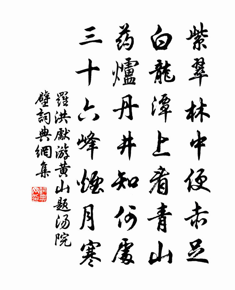 詩詞名句歷史字典書法欣賞書法字典國語詞典說文解字康熙字典古漢語字典標 題 作 者 詩 句 游黃山題湯院壁作者:羅洪先 朝代:明代游黃山題湯院壁原文紫翠林中便赤足,白龍潭上看青山。藥爐丹井知何處,三十六峰煙月寒。 詩詞問答問:游黃山題湯院壁的作者是誰?答:羅洪先問:游黃山題湯院壁寫於哪個朝代?答:明代羅洪先游黃山題湯院壁書法欣賞游黃山題湯院壁書法作品詩詞推薦明月湖宋祁〔宋代〕湖色淡無際,月華相與閒。臨波雙璧映,照浦一珠還。宿火燈洲外,橫煙桑柘間。不妨清思劇,舉國盡溪山。王莽蘇軾〔宋代〕漢家殊未識經綸,入手功名事事新。百尺穿成連夜井,千金購得解飛人。蝶戀花王安中〔宋代〕高奇是蠟梅。剪蠟成梅天著意。黃色濃濃,對萼勻裝綴。百和薰肌香旖旎。仙裳應漬薔薇水。雪徑相逢人半醉。手春雨衛宗武〔宋代〕一自蒼精渙號揚,如酥小雨釀春忙。霏霏透入根荄脈,點點染成桃杏妝。澤遍高深俱及物,氣融枯槁亦生香。老夫淨居寺李澗〔宋代〕金地無塵俯碧灣,蒼藤古木獲幽閒。老僧袖手垂楊里,靜閱渡頭人往還。和衛尉寺柳杜之松〔唐代〕漢將本屯營,遼河有戍城。大夫曾取姓,先生亦得名。高枝拂遠雁,疏影度遙星。不辭攀折苦,為入管弦聲。送王昌齡李頎〔唐代〕漕水東去遠,送君多暮情。淹留野寺出,向背孤山明。前望數千里,中無蒲稗生。夕陽滿舟楫,但愛微波清。舉酒光啟四年春戊申(一作歸王官次年作)司空圖〔唐代〕亂後燒殘數架書,峰前猶自戀吾廬。忘機漸喜逢人少,覽鏡空憐待鶴疏。孤嶼池痕春漲滿,小闌花韻午晴初。酣歌題君子亭趙蕃〔宋代〕菊落淵明手,愛人仍及烏。荷花定好友,周子亦陶徒。寄裴起居姚合〔唐代〕千官曉立爐煙里,立近丹墀是起居。彩筆專書皇帝語,書成幾卷太平書。省宿題天官廳後竹林楊萬里〔宋代〕秋聲偷入翠琅玕,葉葉竿竿玉韻寒。聲在樹間元未是,秋聲只在竹林間。奉和魯望樵人十詠樵徑皮日休〔唐代〕蒙蘢中一徑,繞在千峰里。歇處遇松根,危中值石齒。花穿枲衣落,雲拂芒鞋起。自古行此途,不聞顛與墜。幽居作李端〔唐代〕山舍千年樹,江亭萬里雲。回潮迎伍相,驟雨送湘君。和劉後村梅花百詠方蒙仲〔宋代〕凜凜冰清岩壑氣,亭亭玉立廟廊身。從前誤把瑤姬比,雌了梅花俗了人。春日絕句陸游〔宋代〕便恐東皇促駕回,小軒無事且銜杯。不知何處桃花落,一片飛從屋角來。游郭希呂石洞二十詠谷口劉過〔宋代〕水流自何許,遠欲窮其源。石梯苔蘚層,微有屐齒痕。祭十二郎文韓愈〔唐代〕年、月、日,季父愈聞汝喪之七日,乃能銜哀致誠,使建中遠具時羞之奠,告汝十二郎之靈: 嗚呼!吾少孤,再用韻李洪〔宋代〕風罥遊絲百尺長,蜂房釀蜜露微黃。翠榕一半委陳葉,紫柰十分留暗香。盧橘帶酸歸老圃,側生未熟去閩鄉。浮雲南海旅次曹松〔唐代〕憶歸休上越王台,歸思臨高不易裁。為客正當無雁處,故園誰道有書來。城頭早角吹霜盡,郭里殘潮盪月回。心似秦樓月/憶秦娥黎廷瑞〔宋代〕羅浮暮。青松林下相逢處。相逢處。縞衣素袂,沈吟無語。行雲飛入瑤台路。夢回飄渺香風度。香風度。參橫月落名句推薦半盞屠蘇猶未舉,燈前小草寫桃符。陸游《除夜雪》 新帖繡羅襦,雙雙金鷓鴣。溫庭筠《菩薩蠻·小山重疊金明滅》 久在樊籠里,復得返自然。陶淵明《歸園田居·其一》 青,取之於藍而青於藍;冰,水為之而寒於水。荀子《荀子·勸學》 不戚戚於貧賤,不汲汲於富貴。陶淵明《五柳先生傳》 一去無訊息,那能惜馬蹄。薛道衡《昔昔鹽》 墦間人散後,烏鳥正西東。范成大《清明日狸渡道中》 翻空白鳥時時見,照水紅蕖細細香。蘇軾《鷓鴣天·林斷山明竹隱牆》 斟酌乎質文之間,而隱括乎雅俗之際,可與言通變矣。劉勰《文心雕龍·通變》 是法平等無有高下。鳩摩羅什譯《金剛經·淨心行善》