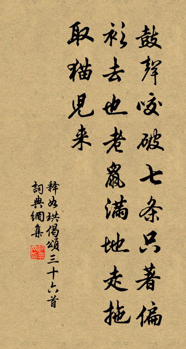 詩詞名句歷史字典書法欣賞書法字典國語詞典說文解字康熙字典古漢語字典標 題 作 者 詩 句 偈頌三十六首作者:釋如珙 朝代:宋代偈頌三十六首原文鼓聲咬破七條,只著偏衫去也。老鼠滿地走,拖取貓兒來。詩詞問答問:偈頌三十六首的作者是誰?答:釋如珙問:偈頌三十六首寫於哪個朝代?答:宋代釋如珙偈頌三十六首書法欣賞偈頌三十六首書法作品詩詞推薦用晦翁十梅詩韻酬張伯修孫子直吳泳〔宋代〕浮名鏡邊塵,驕氣爐上雪。年來如木雞,我肱已三折。浣溪沙劉仲尹〔元代〕貼體宮羅試袷衣。冰藍嬌淺染東池。春風一把瘦腰支。戲鏤寶鈿呈翡翠,笑拈金翦下酴。最宜京兆畫新眉。送陳子歸陸渾別業岑參〔唐代〕雖不舊相識,知君丞相家。故園伊川上,夜夢方山花。種藥畏春過,出關愁路賒。青門酒壚別,日暮東城鴉。漢光武廟韓元吉〔宋代〕涿郡漁陽此呼分,用兵諸將總如神。白頭浪說關中事,鄧禹當年已笑人。賜梅摯知杭州宋仁宗〔宋代〕地有湖山美,東南第一州。剖符宣政化,持橐輟才流。暫出論思列,遙分旰昃憂。循良勤撫俗,來暮聽歌謳。息舟荊溪,入陽羨南山,游善權寺,呈李功曹巨羊士諤〔唐代〕結纜蘭香渚,柴車上連岡。晏溫值初霽,去繞山河長。獻歲冰雪盡,細泉生路傍。行披煙杉入,激澗橫石樑。層閣答崔賓客晦叔十二月四日見寄白居易〔唐代〕今歲日餘二十六,來歲年登六十二,尚不能憂眼下身,因何更算人間事。居士忘筌默默坐,先生枕麴昏昏睡。早晚舍北搖落景物殊佳偶作陸游〔宋代〕草徑人稀到,柴扉手自開。林疏鴉小泊,溪淺鷺頻來。檐角除瓜蔓,牆隅斸芋魁。東鄰膰肉至,一笑舉新醅。暗香(用韻賦雪)吳潛〔宋代〕九垓共色。想洛濱劍客,吹呼長笛。貏豸老松,別樹平欺爛柯折。應是千官鶴舞,騰賀表、誰家椽筆。賜宴也,內舍北野望陸游〔宋代〕斷壟圍蔬圃,枯桑系釣查。經行橋獨木,佇立路三叉。野卉棲孤蝶,平川起亂鴉榰筇無定處,興盡即還家。與子仁登天柱岡,過胡家塘蒪塘歸東園四首楊萬里〔宋代〕數間茅屋傍山根,一隊兒童出竹門。只愛行穿楊柳渡,不知失卻李花村。書慈光塔釋智圓〔宋代〕靈骨未藏三十載,我來收得葬孤山。此中起塔不在大,已有高名垂世間。鷓鴣天 化度寺作吳文英〔宋代〕池上紅衣伴倚闌。棲鴉常帶夕陽還。殷雲度雨疏桐落,明月生涼寶扇閒。鄉夢窄,水天寬。小窗愁黛澹秋山。吳鴻公孫孝子韓維〔宋代〕喪期著常數,在古固有之。嗟嗟三季後,禮讓俗亦衰。親亡有不葬,況問功與期。公孫布衣士,未免寒與飢。生兮頌十玄談塵異釋印肅〔宋代〕濁者自濁清自清,一輪堅白不容塵。鏡中妍醜誰分別,水月融光爭法身。送表之李處權〔宋代〕平生佳處在離騷,怪我年來得此家。不信胸中橫太華,試從筆下看驚濤。門連止水心無競,地接名山眼更高。要是魯仲連徐鈞〔宋代〕布衣不肯帝強秦,天下皆聞高士名。何事勸降輕守節,一書飛矢入聊城。哭子晉兄冷士嵋〔清代〕吾兄雖弱冠,忠義古人難。憤血千秋碧,操心一寸丹。旌旗落泗水,魂夢繞金壇。痛作包胥淚,霜飛六月寒。二十二日立秋夜行泊林皇港二首張耒〔宋代〕蕭蕭晚風起,孤舟愁思生。蓬窗一螢過,葦岸數蛩鳴。老大畏為客,風波難計程。家人夜深語,應念客猶征。趙唐卿邀游西湖即席賦十二韻孫應時〔宋代〕春風客皇州,積雨不得晴。倚樓望西湖,想見煙水平。芳時諒難負,勝侶欣來並。杖藜一蕭散,喚船弄空明。浮雲名句推薦離恨恰如春草,更行更遠還生。李煜《清平樂·別來春半》 分明小像沉香縷,一片傷心欲畫難。納蘭性德《於中好·送梁汾南還為題小影》 二月黃鶯飛上林,春城紫禁曉陰陰。錢起《贈闕下裴舍人》 紅粉佳人休使老,風流浪子莫教貧。佚名《增廣賢文·上集》 千里稻花應秀色,五更桐葉最佳音。曾幾《蘇秀道中》 君子食無求飽,居無求安,敏於事而慎於言,就有道而正焉。可謂好學也已。孔子弟子《論語·學而篇》 君子無入而不自得焉。子思《中庸·第十四章》 手種堂前垂柳,別來幾度春風?歐陽修《朝中措·送劉仲原甫出守維揚》 鴻雁在雲魚在水。惆悵此情難寄。晏殊《清平樂·紅箋小字》 不知香積寺,數里入雲峰王維《過香積寺》
