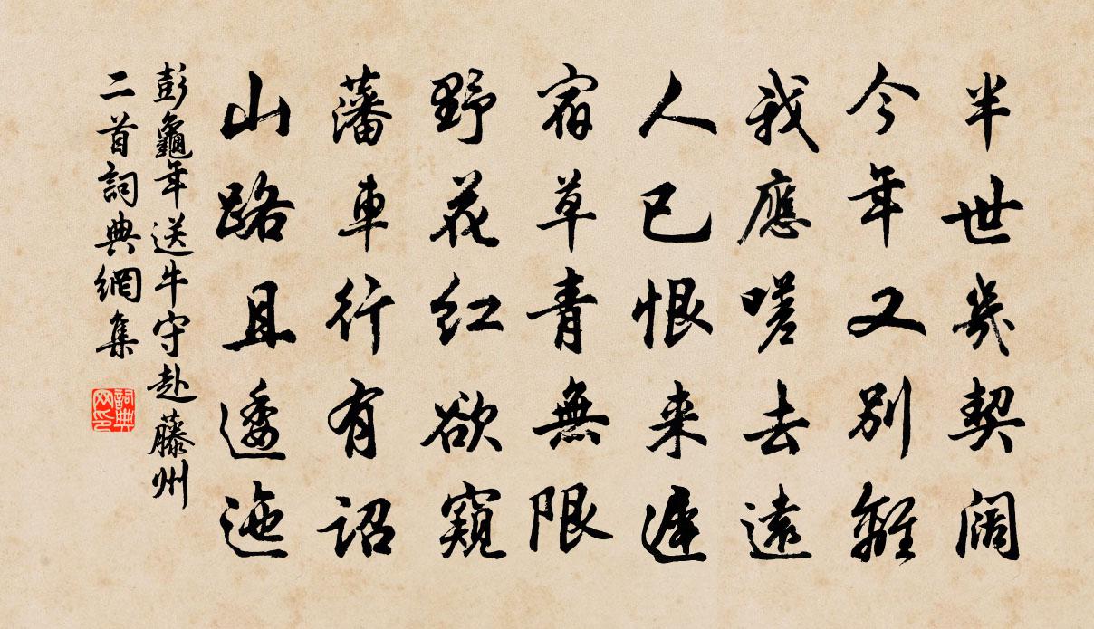 詩詞名句歷史字典書法欣賞書法字典國語詞典說文解字康熙字典古漢語字典標 題 作 者 詩 句 送牛守赴藤州二首作者:彭龜年 朝代:宋代送牛守赴藤州二首原文半世幾契闊,今年又別離。我應嗟去遠,人已恨來遲。宿草青無限,野花紅欲窺。藩車行有詔,山路且逶迤。詩詞問答問:送牛守赴藤州二首的作者是誰?答:彭龜年問:送牛守赴藤州二首寫於哪個朝代?答:宋代彭龜年送牛守赴藤州二首書法欣賞送牛守赴藤州二首書法作品詩詞推薦次韻杜若川春日雜興集句二首於石〔宋代〕九陌淨無車馬塵,不須移檻損天真。凡花俗草敗人意,悵望煙雲縹緲人。雜興利登〔宋代〕昨宵狂風起,折我桑樹枝。徘徊履桑園,賤妾當何依。豈無薜蘿生,亦有柔苧肥。素情在君子,綺帛良重斯。無桑韋長史輓詞崔融〔唐代〕日落桑榆下,寒生松柏中。冥冥多苦霧,切切有悲風。京兆新阡辟,扶陽甲第空。郭門從此去,荊棘漸蒙籠。早春書懷寄李少府仲宣皎然〔唐代〕早年初問法,因悟目中花。忽值胡雛起,芟夷若亂麻。脫身投彼岸,弔影念生涯。跡與空門合,心將世路賒。東田少年游陳允平〔宋代〕蘭屏香暖,松醪味滑,湖蟹薦香橙。雁宇秋高,鳳台人遠,明月自吹笙。輕寒翦翦生襟袖,銀漏漸催更。暗憶年時金剛隨機無盡頌法會因由分第一釋印肅〔宋代〕聖凡同遣日,盡講波羅蜜。□唯解空知,更不勞心力。幕次閒吟王禹偁〔宋代〕文章曾受帝褒稱,幕次孤吟冷似冰。借馬趁朝長後到,問人求米盡難憑。僮教罷藥朝無酒,兒廢看書夜絕燈。除卻別李嶠得勝字駱賓王〔唐代〕芳尊徒自滿,別恨轉難勝。客似游江岸,人疑上灞陵。寒更承夜永,涼景向秋澄。離心何以贈,自有玉壺冰。林宏才秉義輓辭楊萬里〔宋代〕行盡江南北,於何隱去休。福清好雲谷,老子得菟裘。風釆今千古,英靈閟一丘。庭階俱玉樹,仲氏立鰲頭。西江月何夢桂〔宋代〕猶記春風庭院,柳陰深鎖簾帷。東君去後雨絲絲。空認紫騮嘶處。夢斷簫台無據,十年往事休追。忽然拈起舊來書題大善寺王之道〔宋代〕絮帽曳絲雲帶雨,瓊梳環髻水圍山。江村五月黃梅過,十里人煙渺莽間。喜晴崔敦禮〔宋代〕頑雲收四野,皎日麗千門。水響魚龍落,雲高鸛鶴翻。近陽書幌暖,繞室篆煙昏。擬欲尋春去,梅花水際村。瓶中梅花徐似道〔宋代〕可憐玉雪不供愁,似情詩翁作□□。□□此君雖強項,歲寒相對卻風流。玉台體利登〔宋代〕兩彎弓月眉端照,一朵忪雲鬢畔歸。欲默不能言不可,嬌心無著憑青衣。次韻和吳侍郎偶至城西一二名園宋庠〔宋代〕幾曲西園路,幽深隱歲華。偶乘安道興,直過辟疆家。畦脈爭分溜,叢名各記花。身閒飛蓋遠,容易到曛霞。虞美人李珣〔唐代〕金籠鶯報天將曙,驚起分飛處。夜來潛與玉郎期,多情不覺酒醒遲,失歸期。映花避月遙相送,膩髻偏垂鳳。卻回送趙侍朗被召曹彥約〔宋代〕祗為分尤輟近臣,不應持久費經綸。暫來制閫無多日,歸去朝天及早春。紅旆綠油生羽翼,落霞秋水動精神。行行夜飲呈葉司戶張鎡〔宋代〕欲薄交難古,心親話許深。更長銀燭夜,院靜石雲陰。冷夢多孱骨,修程費老襟。松壺梅並插,投醉且高吟。白雲李處士於大樗下築小庵用題王子由書齋韻方回〔宋代〕天地元知一指齊,樗庵小小架榱題。故應懶散身常健,孰謂昂藏意未低。神氣自調丹鼎火,仙班不藉紫芝泥。落成極相思·題陳藏一水月梅扇吳文英〔宋代〕玉纖風透秋痕。涼與素懷分。乘鸞歸後,生綃淨翦,一片冰雲。心事孤山春夢在,到思量、猶斷詩魂。水清月冷,名句推薦它山之石,可以攻玉。佚名《鶴鳴》 年時俯仰過,功名宜速崇。張華《壯士篇》 岸容待臘將舒柳,山意沖寒欲放梅。杜甫《小至》 獨倚危欄,神遊無際,天地猶嫌隘。朱栴《念奴嬌·雪霽夜月中登樓望賀蘭山作》 嚴妝欲罷囀黃鸝,飛上萬年枝。和凝《喜遷鶯·曉月墜》 一郡官閒唯副使,一年冷節是清明。王禹偁《清明日獨酌》 木落山空天遠大,送飛鴻、北去傷懷久。戴復古《賀新郎·寄豐真州》 佇聽寒聲,雲深無雁影。周邦彥《關河令·秋陰時晴漸向暝》 寒笛對京口,故人在襄陽。劉昚虛《暮秋揚子江寄孟浩然》 將之器,其用大小不同。諸葛亮《將苑·卷一·將器》