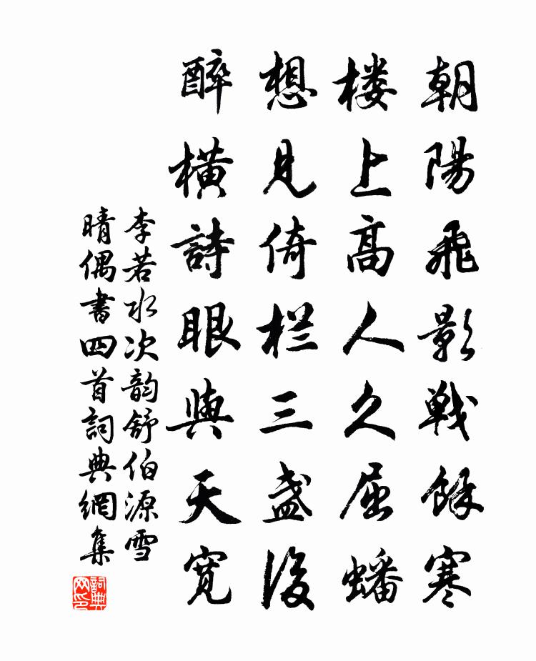 詩詞名句歷史字典書法欣賞書法字典國語詞典說文解字康熙字典古漢語字典標 題 作 者 詩 句 次韻舒伯源雪晴偶書四首作者:李若水 朝代:宋代次韻舒伯源雪晴偶書四首原文朝陽飛影戰余寒,樓上高人久屈蟠。想見倚欄三盞後,醉橫詩眼與天寬。詩詞問答問:次韻舒伯源雪晴偶書四首的作者是誰?答:李若水問:次韻舒伯源雪晴偶書四首寫於哪個朝代?答:宋代李若水次韻舒伯源雪晴偶書四首書法欣賞次韻舒伯源雪晴偶書四首書法作品詩詞推薦閏八月望日登青陽峰觀可玉所得天池之勝徐瑞〔宋代〕天風吹我上崔鬼,凍面漬塵亦快哉。止水泓澄金鏡淨,遠峰羅列畫屏開。幽奇定有神仙到,陰怪從教俗子咍。莫道酬秘書王丞見寄雍陶〔唐代〕朝下有閒思,南溝邊水行。因來見寥落,轉自嘆平生。白首丈夫氣,赤心知己情。留詩本相慰,卻憶苦吟聲。湖蘇二郡語佚名〔唐代〕湖接兩頭,蘇聯三尾。句李曾伯〔宋代〕春風亭上問秋風。送入都僉事何夢桂〔宋代〕天教持斧下錢塘,來為蒼生滌痏瘡。胸次對天懸日月,筆端隨地轉冰霜。雲山有分高名在,江水無情清議長。臨別罪所留系寄張十四劉長卿〔唐代〕不見君來久,冤深意未傳。冶長空得罪,夷甫豈言錢。直道天何在,愁容鏡亦憐。因書欲自訴,無淚可潸然。冬日書事張耒〔宋代〕昨夜新霜著瓦乾,西園梧葉盡飛翻。楚鄉原野長青草,澤國風雲只薄寒。梅蕊半含空有待,菊叢已過似無言。杖藜又和賞梅范仲淹〔宋代〕故人為使富天才,相與抽毫賦早梅。氣豓未勞橫玉笛,風光先合倒金壘。隴頭欲寄交情遠,林下初逢病眼開。必若喜宗兄端叟再會武林還暨陽二首方回〔宋代〕我亦七旬老,公為兩歲兄。共知吾輩拙,各賴此心平。江海逃簪紱,乾坤寢甲兵。喜逢又惜別,久幸蔭宗盟。題李公麟山莊圖其二十鵲源蘇轍〔宋代〕溪深龜魚驕,石瘦椿楠勁。借子木蘭船,寬我芒鞋病。訪楊伯子監丞自白沙問路而去戴復古〔宋代〕欲訪揚雄宅,扁舟過白沙。自從山以後,直到水之涯。風節古人物,文章老作家。相尋有忙事,第一問梅花。江月晃重山 中秋客邵亨貞〔元代〕碧樹天香帶露,朱樓翠袖欹寒。夜深人醉碧闌乾。玲瓏影,長是隔簾看。又見庭前素魄,何堪鏡里朱顏。十年一夢宮詞三十三首曹勛〔宋代〕拱北星辰靜守心,暫清警蹕鳳凰深。蕭條梅柳春如許,可復風煙比上林。羅江驛唐彥謙〔唐代〕數枝高柳帶鳴鴉,一樹山榴自落花。已是向來多淚眼,短亭回首在天涯。鹽車重楊維楨〔元代〕鹽車重,鹽車重,官驥牽不動。官鉈私秤秤不平,秤秤束縛添畸令。鹽車重,重奈何,旑令帶多私轉多。大商鬻不山居雜詩九十首曹勛〔宋代〕造化致有生,旋亦致凋瘁。草木方薿薿,枝葉忽靡靡。初發白玉滌,接以赤日熾。末為飈風吹,從是即委翳。中書令裴公輓歌詞二首溫庭筠〔唐代〕王儉風華首,蕭何社稷臣。丹陽布衣客,蓮渚白頭人。銘勒燕山暮,碑沉漢水春。從今虛醉飽,無復污車茵。箭下廣教寺張弋〔宋代〕英雄居處終奇特,幾度欲來今始能。騎省文高存古篆,橋公樹朽長寒藤。清流並繞分三澗,翠竹相依住數僧。沙鳥李堅甫淨居雜題一十三首琴室文同〔宋代〕將何寫幽意,有此古桐聲。為問好彈處,誰來聽蟹行。送張少府赴夏縣李端〔唐代〕雖為州縣職,還欲抱琴過。樹古聞風早,山枯見雪多。雞聲連絳市,馬色傍黃河。太守新臨郡,還逢五袴歌。名句推薦時節是重陽,菊花牽恨長。徐燦《菩薩蠻·秋閨》 滿地殘紅宮錦污,昨夜南園風雨。王安國《清平樂·春晚》 星漢燦爛,若出其里。曹操《觀滄海 / 碣石篇》 燈前目力雖非昔,猶課蠅頭二萬言。陸游《讀書》 桃花春水淥,水上鴛鴦浴。韋莊《菩薩蠻》 明月淨松林,千峰同一色。歐陽修《自菩提步月歸廣化寺》 義典則弘,文約為美。劉勰《文心雕龍·銘箴》 如來說諸心皆為非心是名為心。鳩摩羅什譯《金剛經·一體同觀》 昨夜狂風度,吹折江頭樹李白《長干行二首》 兒女此情同。往事朦朧。湘娥竹上淚痕濃。辛棄疾《浪淘沙·賦虞美人草》