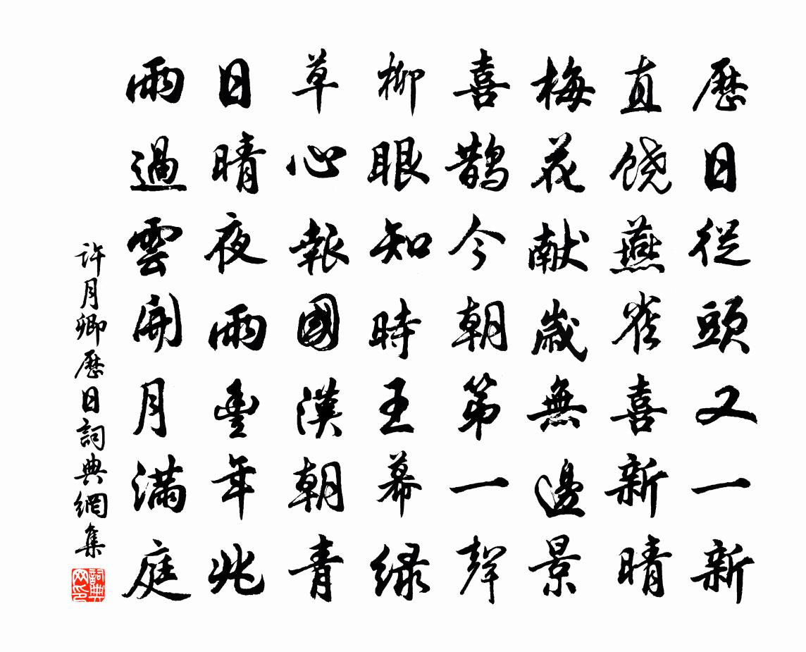 詩詞名句歷史字典書法欣賞書法字典國語詞典說文解字康熙字典古漢語字典標 題 作 者 詩 句 曆日作者:許月卿 朝代:宋代曆日原文曆日從頭又一新,直饒燕雀喜新晴。梅花獻歲無邊景,喜鵲今朝第一聲。柳眼知時王幕綠,草心報國漢朝青。日晴夜雨豐年兆,雨過雲開月滿庭。詩詞問答問:曆日的作者是誰?答:許月卿問:曆日寫於哪個朝代?答:宋代許月卿曆日書法欣賞曆日書法作品詩詞推薦閒居釋文珦〔宋代〕四體本虛空,萬物猶土苴。以此存內照,頗覺非外假。存亡楚人弓,得失塞翁馬。但使吾道存,正欲知者寡。即席次君禮年兄韻秦觀〔宋代〕情舒喜面山浮翠,袖滿薰風涼透時。萍碎錦鱗金網舉,影差簾燕玉鉤垂。輕輕篆鼎凝香細,款款方壼轉漏遲。清興有懷青城霧中道友陸游〔宋代〕雪谷孤松自郁然,紛紛朝菌但堪憐。坐更拂石芥城劫,時說開皇龍漢年。淡煮藜羹天送供,閒拖藤杖地行仙。共看醉蓬萊(壽八窗叔)李曾伯〔宋代〕指梅花雪片,問訊八窗,南枝開未。一點春風,訊息嶺頭寄。太白精神,廣平韻度,是豈眾芳擬。東閣吟邊,水清朝中措(茶)曹冠〔宋代〕春芽北苑小方圭。碾畔玉塵飛。金箸春蔥擊拂,花瓷雪乳珍奇。主人情重,留連佳客,不醉無歸。邀住清風兩腋,西江月 贈古知觀 藏頭馬鈺〔元代〕貌先生姓古。中不講之乎。壬妙處用功夫。道是他省悟。亦玄門得趣。飛玉兔金烏。君相伴化頑愚。意如同數罟。自述二首邵雍〔宋代〕何者堪名席上珍,都緣當日得師真。是知佚我無如老,惟喜放懷長似春。得志當為天下事,退居聊作水雲身。胸中上令狐相公趙嘏〔唐代〕鶚在卿雲冰在壺,代天才業奉訏謨。榮同伊陟傳朱戶,秀比王商入畫圖。昨夜星辰回劍履,前年風月滿江湖。不知睢陽學舍書懷范仲淹〔宋代〕白雲無賴帝鄉遙,漢苑誰人奏洞簫。多難未應歌鳳鳥,薄才猶可賦鷦鷯。瓢思顏子心還樂,琴遇鍾君恨即銷。但使達觀亭歌為健康徐氏作戴表元〔宋代〕天風颯爽岩曦開,雲溪縈環芳樹來。林棲島處眼未識,何人擇勝誅荒萊。仙跡著人清辟易,徐郎襟懷趙郎筆。經營別翁定宿瀑上劉克莊〔宋代〕偶送詩人共宿山,擁爐吹燭聽潺湲。已修茗事將安枕,因看梅花復啟關。崖色無苔通磵底,月光如練抹林間。平生龍女祠後塘自生荷花數權與史誠之更相酬和司馬光〔宋代〕清江向晚採蓮稀,獨倚蘭膛久未歸。目斷可堪人不至,斜風細雨濕羅衣。沁園春(壽岳君舉)蔣捷〔宋代〕昔裴晉公,生甲辰歲,秉唐相鈞。向東都治第,才娛老眼,北門建節,又絆閒身。燠館花濃,涼台月淡,不記弓刀送常州陳商學士宋祁〔宋代〕紅梨秋老石渠霜,並欲蕭蕭伴祖觴。台上補綾收柘枕,水邊古獸得鞶囊。浮雲並蓋辭京輦,曉月將潮促使艎。緣飾賀新涼(壽吳梘郡)佚名〔宋代〕共審挽七日之書雲,西方生妙喜佛;占四明之福地,南極現老人星。人歌海沂之康,天錫河沙之算。太守與我同理偈十二首釋文準〔宋代〕高吟大笑意猖狂,潘閬騎驢出故鄉。驚起暮天沙上雁,海門斜去兩三行。古人道,不看經,不念佛,看經念佛是何題游昭畫牛四圖王灼〔宋代〕山平皋壠低,秋深雲雨晦。牧人荷蓑笠,匍伏在牛背。穉牛先跳逸,兩牛追不及。安得青天出白日,重來緩驅莫相十二峰登龍閻伯敏〔宋代〕散而成章合為龍,迴風混事游鴻濛。舟人上下神女供,俗妝鉛粉胭脂紅。月下笛(次韻)曾允元〔宋代〕又老楊花,浮萍點點,一溪春色。閒尋舊跡。認溪頭、浣紗磧。柔條折盡成輕別,向空外、瑤簪一擲。算無情更苦封禪寺居羅隱〔唐代〕盛禮何由睹,嘉名偶寄居。周南太史淚,蠻徼長卿書。砌竹搖風直,庭花泣露疏。誰能賦秋興,千里隔吾廬。名句推薦寂寂竟何待,朝朝空自歸。孟浩然《留別王侍御維 / 留別王維》 柴門聞犬吠,風雪夜歸人。劉長卿《逢雪宿芙蓉山主人》 橫眉冷對千夫指,俯首甘為孺子牛。魯迅《自嘲》 群峭碧摩天,逍遙不記年李白《尋雍尊師隱居》 應知早飄落,故逐上春來。何遜《詠早梅 / 揚州法曹梅花盛開》 愚而好自用,賤而好自專。生乎今之世,反古之道。如此者災及其身者也。子思《中庸·第二十八章》 秋風夜渡河,吹卻雁門桑。王昌齡《塞下曲·秋風夜渡河》 春水滿四澤,夏雲多奇峰。陶淵明《四時》 月下飛天鏡,雲生結海樓。李白《渡荊門送別》 先到為君,後到為臣。佚名《增廣賢文·上集》