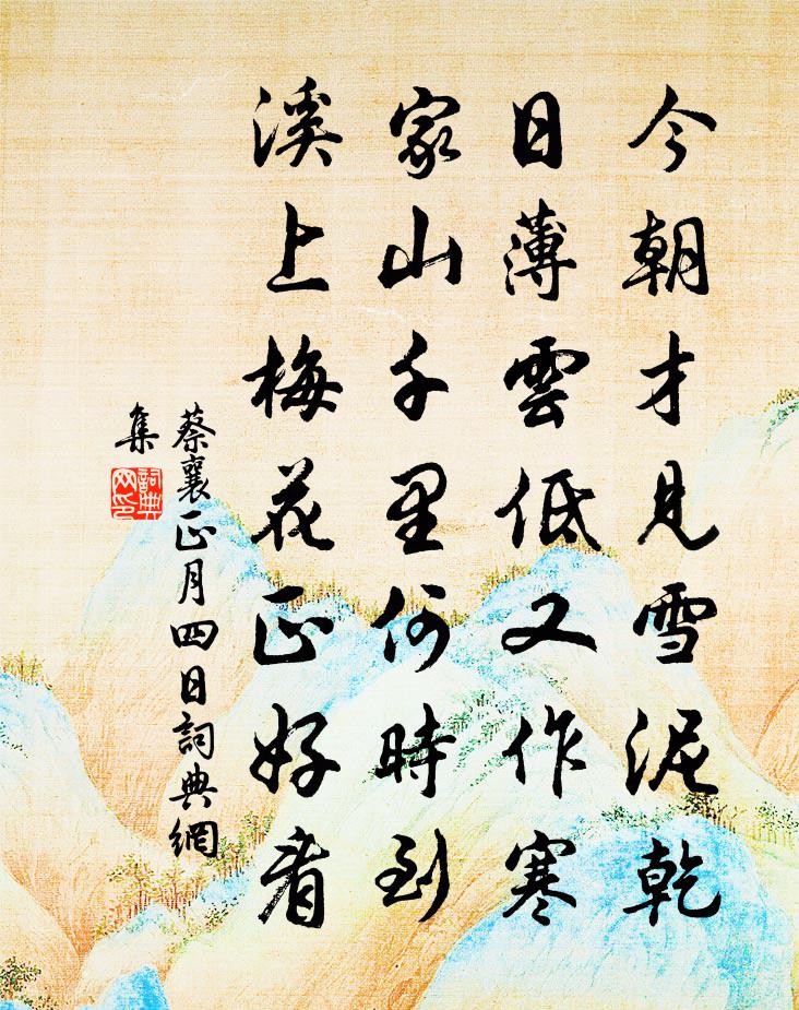 詩詞名句歷史字典書法欣賞書法字典國語詞典說文解字康熙字典古漢語字典標 題 作 者 詩 句 正月四日作者:蔡襄 朝代:宋代正月四日原文今朝才見雪泥乾,日薄雲低又作寒。家山千里何時到,溪上梅花正好看。詩詞問答問:正月四日的作者是誰?答:蔡襄問:正月四日寫於哪個朝代?答:宋代蔡襄正月四日書法欣賞正月四日書法作品詩詞推薦和林處士梅詩八首劉學箕〔宋代〕一樹才開玉未殘,忍此風雪耐些寒。不須俗子聊翩去,政要幽人自在看。白玉堂中春信早,黃金珏裹酒痕乾。後凋漁父吳鎮〔元代〕重整絲綸欲掉船。江頭新月正明圓。酒瓶倒,岸花懸。拋卻漁竿和月懷元度四首王安石〔宋代〕舍南舍北皆春水,恰似蒲萄初撥醅。不見秘書心若失,百年多病獨登台。依韻和促庶省壁畫山水司馬光〔宋代〕畫工執筆已心游,稍稍蘅皋引杜洲。堆案煩文猶倦暑,滿軒新意勿驚秋。天生賢者非無為,官同明時未易休。正恐南海曹松〔唐代〕傾騰界漢沃諸蠻,立望何如畫此看。無地不同方覺遠,共天無別始知寬。文魮隔霧朝含碧,老蚌凌波夜吐丹。萬狀入山胡圭〔宋代〕擺落世塵縛,願結岩棲緣。一層復一層,古道多迴旋。白雲隨我後,幽鳥鳴我前。雲禽亦佳侶,一見即忻然。示寶頭陀之徑山打鐘釋紹曇〔宋代〕勞生夢寐分途轍,深省一聲何處發。客系楓林半夜舟,僧敲煙寺黃昏月。爭似凌霄峰頂頭,怒鯨吼徹千林秋。飽噇浪淘沙·一泊沙來一泊去白居易〔唐代〕一泊沙來一泊去,一重浪滅一重生。相攪相淘無歇日,會教東海一時平。怨回紇歌二首皇甫冉〔唐代〕白首南朝女,愁聽異域歌。收兵頡利國,飲馬胡蘆河。毳布腥膻久,穹廬歲月多。雕巢城上宿,吹笛淚滂沱。祖席漁父蘇泂〔宋代〕漁翁年幾雪垂肩,釣罷歸來月一船。明日酒醒尋伴侶,賣魚依舊禹祠前。在伯教授為考試之行不知其地漫成五詩送之趙蕃〔宋代〕峽州使君我所親,書去猶新報未聞。此士如今為第一,見之煩為致殷勤。沉醉東風·重九盧摯〔元代〕題紅葉清流御溝,賞黃花人醉歌樓。天長雁影稀,月落山容瘦,冷清清暮秋時候。衰柳寒蟬一片愁,誰肯教白衣送為言以道賦岩隱釋文珦〔宋代〕隱者心常靜,山林跡易安。幾年靈運屐。九轉葛玄丹。石圃菁苗在,崖房桂影寒。豈知塵世窄,萬事雜悲歡。句佚名〔宋代〕社近記穿黃增子,雨前趲摘紫槍旗。丙除夜泊舟東湖用白石歸苕溪韻書懷徐端〔宋代〕空山歲晚足堪娛,殘雪千峰水半湖。明發臨風相諸弟,共扶白髮進屠蘇。謁金門(和昌甫)韓淲〔宋代〕花肅肅。楊柳三眠未足。一棹溪山新漲綠。舊歡無夢續。莫問杜鵑啼蜀。只有江南水竹。北客淒涼無伴獨。春山生酬別微之 臨都驛醉後作。白居易〔唐代〕灃頭峽口錢唐岸,三別都經二十年。且喜筋骸俱健在,勿嫌須鬢各皤然。君歸北闕朝天帝,我住東京作地仙。博望府齋感懷酬夢得白居易〔唐代〕府伶呼喚爭先到,家醞提攜動輒隨。合是人生開眼日,自當年老斂眉時。丹砂煉作三銖土,玄發看成一把絲。勞寄沁園春·將止酒戒酒杯辛棄疾〔宋代〕杯汝來前!老子今朝,點檢形骸。甚長年抱渴,咽如焦釜;於今喜睡,氣似奔雷。汝說“劉伶,古今達者,醉後何觀我齋再分韻得下字陳與義〔宋代〕一慵縛兩腳,閉戶了晨夜。夢攀城西樹,起造君子舍。紫髯出堂堂,見客披衣謝。平生功名手,嗜靜如食蔗。小齋名句推薦碧野朱橋當日事,人不見,水空流。秦觀《江城子·西城楊柳弄春柔》 風乍暖,日初長,裊垂楊。陳子龍《訴衷情·春遊》 空床臥聽南窗雨,誰復挑燈夜補衣。賀鑄《半死桐·重過閶門萬事非》 萬里歸船弄長笛,此心吾與白鷗盟。黃庭堅《登快閣》 城雪初消薺菜生,角門深巷少人行。楊載《到京師》 後庭花一曲,幽怨不堪聽。劉禹錫《金陵懷古》 舊山松竹老,阻歸程。岳飛《小重山·昨夜寒蛩不住鳴》 此夜星繁河正白,人傳織女牽牛客。沈佺期《七夕曝衣篇》 嗟萬事難忘,惟是輕別。周邦彥《浪淘沙慢·曉陰重》 錦瑟華年誰與度?賀鑄《青玉案·凌波不過橫塘路》