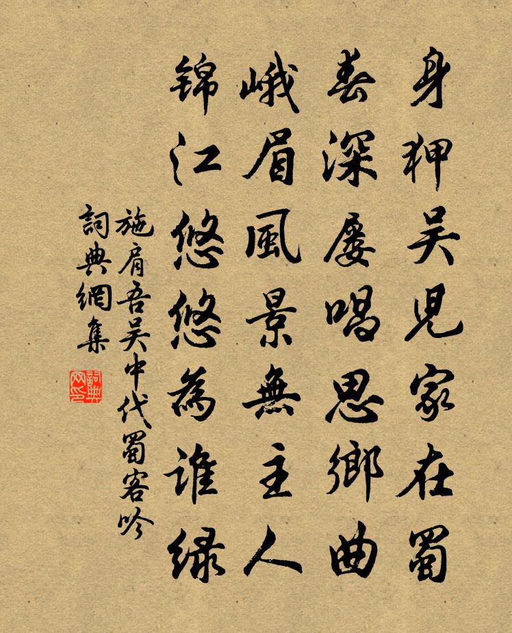 詩詞名句歷史字典書法欣賞書法字典國語詞典說文解字康熙字典古漢語字典標 題 作 者 詩 句 吳中代蜀客吟作者:施肩吾 朝代:唐代吳中代蜀客吟原文身狎吳兒家在蜀,春深屢唱思鄉曲。峨眉風景無主人,錦江悠悠為誰綠。詩詞問答問:吳中代蜀客吟的作者是誰?答:施肩吾問:吳中代蜀客吟寫於哪個朝代?答:唐代問:吳中代蜀客吟是什麼體裁?答:七古施肩吾吳中代蜀客吟書法欣賞吳中代蜀客吟書法作品注釋全唐詩:卷494-62詩詞推薦簡周允升三首趙蕃〔宋代〕春來多睡思,茗椀亦時須。不敢家園乞,芭蕉有剩無。招隱曇翼〔唐代〕連峰數千里,修林帶平津。雲起遠山翳,風至□荒榛。茅茨隱不見,雞鳴知有人。躡磴踐其跡,處處見遺薪。乃知同將作韋二少監贈水部李郎中張籍〔唐代〕舊年同是水曹郎,各罷魚符自楚鄉。重著青衫承詔命,齊趨紫殿異班行。別來同說經過事,老去相傳補養方。憶得紫芝和來鄧肅〔宋代〕雨余榴火欲燒空,宮槐老翠闇薰風。即今此景那可恃,忽觀玉露泣芙蓉。請公文急出新格,一變茅黃兼葦白。坐令偶作白居易〔唐代〕紅杏初生葉,青梅已綴枝。闌珊花落後,寂寞酒醒時。坐悶低眉久,行慵舉足遲。少年君莫怪,頭白自應知。紫牡丹二首楊萬里〔宋代〕歲歲東風二月時,司花辛苦染晴枝。夜輸百斛薔薇水,曉洗千層玉雪肌。寒食清明空過了,姚黃魏紫不曾知。春愁壁間韻趙崇鉘〔宋代〕海棠開盡故清寒,漠漠梨花暮色閒。酒滿綠樽愁滿酒,醉憑枕障認巫山。戲和微之答竇七行軍之作(依本韻)白居易〔唐代〕旌鉞從櫜鞬,賓僚禮數全。夔龍來要地,鵷鷺下遼天。赭汗騎驕馬,青娥舞醉仙。合成江上作,散到洛中傳。陋巷皇華薛紹彭〔宋代〕橘樹松林綠徑長,竹籬縈繞當城隍。皇華何異投荒客,已過山川是夜郎。詩阮瑀〔魏晉〕白髮隨櫛墮。未寒思厚衣。四支易懈惓。行步益疎遲。常恐時歲盡。魂魄忽高飛。自知百年後。堂上生旅葵。 雪後梅邊方岳〔宋代〕野逕茅茨竹作牆,歲寒曾亦幾平章。高人風味天然別,不在橫斜不在香。青玉案(送人赴黃岡令)王千秋〔宋代〕雪堂不遠臨皋路。悵仙伯、騎鯨去。燕麥桃花更幾度。橫橋雖在,種松無有,誰是關心處。解鞍君到冬雖暮。傳語鄉禪嵩老集古人佳句成詩編成巨帙以示余欽不楊夢信〔宋代〕胸中歷歷古人詩,妙用縱橫自一機。管得杜韓驚且泣,斕斑要作百家衣。學詩元不離參禪,萬象森羅總現前。觸著興化寺釋紹曇〔宋代〕門照雙池鏡樣明,東西廓喝寂無聲。紫羅帳里機玄密,雖有珍珠撒未成。捕蝗至浮雲嶺山行疲苦有懷子由弟二首蘇軾〔宋代〕西來煙障塞空虛,灑遍秋田雨不如。新法清平那有此,老身窮苦自招渠。無人可訴烏銜肉,憶弟難憑犬寄書。自笑臨平道中范成大〔宋代〕煙雨桃花夾岸栽,低低渾欲傍船來。石湖有此紅千葉,前日春寒總未開。蘇子瞻雪堂孔武仲〔宋代〕古縣東邊仄徑開,先生曾此屬蒿萊。鸞鳳一去應不返,花柳當年皆自栽。畫壁蒼茫留水墨,朱欄剝落長莓苔。鄰翁示同志劉克莊〔宋代〕滿身秋月滿襟風,敢嘆棲遲一壑中。除目解令丹灶壞,詔書能使草堂空。豈無高士招難出,曾有先賢隱不終。說與追涼歷下古城西北隅,此地有清泉喬木盧象〔唐代〕謝朓出華省,王祥貽佩刀。前賢真可慕,衰病意空勞。貞悔不自卜,游隨共爾曹。未能齊得喪,時復誦離騷。閒陰漢宮春佚名〔宋代〕玉減香銷,被嬋娟誤我,臨鏡妝慵。無聊強開強解,蹙破眉峰。憑高望遠,但斷腸、殘月初鍾。須信道,承恩在貌名句推薦疑人勿使,使人勿疑脫脫《金史·本紀·卷四》 城邊有古樹,日夕連秋聲。李白《沙丘城下寄杜甫》 休問梁園舊賓客,茂陵秋雨病相如。李商隱《寄令狐郎中》 諸葛大名垂宇宙,宗臣遺像肅清高。杜甫《詠懷古蹟五首·其五》 先到為君,後到為臣。佚名《增廣賢文·上集》 九日明朝酒香,一年好景橙黃。張可久《滿庭芳·客中九日》 蠟炬風搖簾不下,竹影半牆如畫。項鴻祚《清平樂·池上納涼》 三月正當三十日,占得,春光畢竟共春歸。莊棫《定風波·為有書來與我期》 將壇醇酒冰漿細,元夜邀賓燈火新。趙時春《元宵飲陶總戎家二首》 年少萬兜鍪,坐斷東南戰未休。辛棄疾《南鄉子·登京口北固亭有懷》