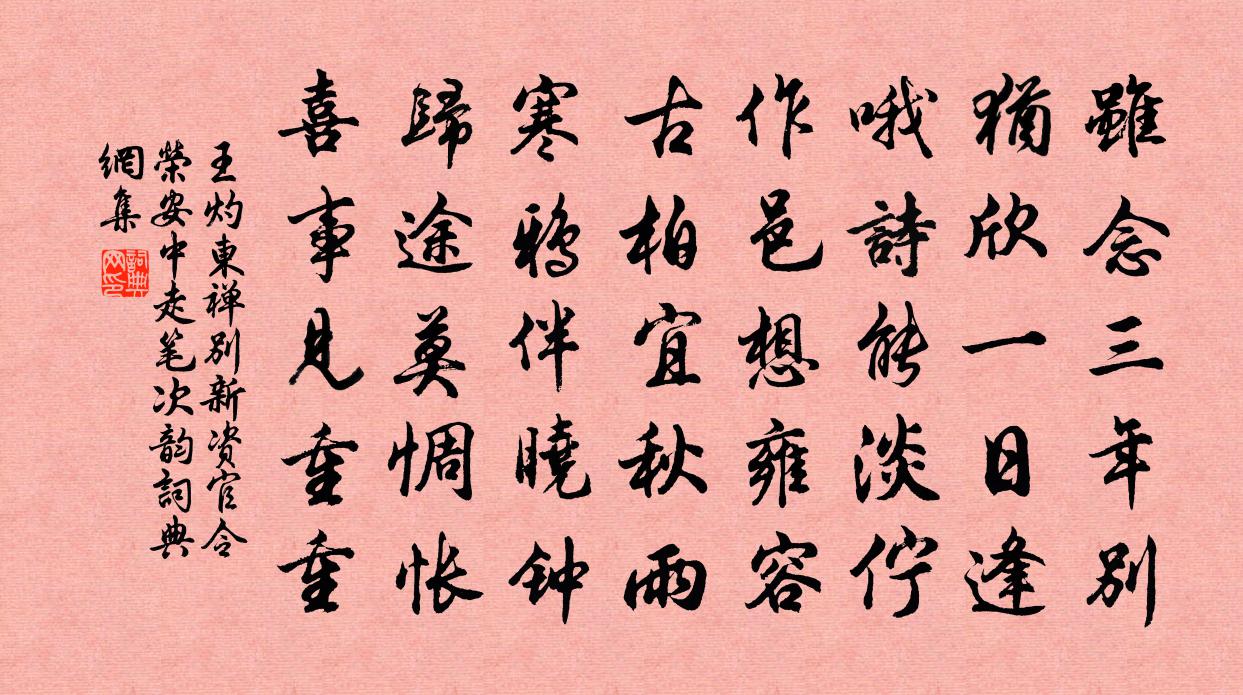 詩詞名句歷史字典書法欣賞書法字典國語詞典說文解字康熙字典古漢語字典標 題 作 者 詩 句 東禪別新資官令榮安中走筆次韻作者:王灼 朝代:宋代原文雖念三年別,猶欣一日逢。喔詩能淡佇,作邑想雍容。古柏宜秋雨,寒鴉伴曉鍾。歸途莫惆悵,喜事見重重,詩詞問答問:《東禪別新資官令榮安中走筆次韻》的作者是誰?答:王灼問:該詩寫於哪個朝代?答:宋代書法欣賞東禪別新資官令榮安中走筆次韻書法作品詩詞推薦湖北有茅齋湖西有松島輕棹往返頗諧素心因成四韻方乾〔唐代〕湖北湖西往復還,朝昏只處自由間。暑天移榻就深竹,月夜乘舟歸淺山。繞砌紫鱗欹枕釣,垂檐野果隔窗攀。古賢解纜洪咨夔〔宋代〕春落平蕪外,舟行白雨邊。鳩應山爾汝,櫓畫水之玄。官冷誰能吏,身閒便是仙。康廬真箇去,信有夙生緣。送韓簽判玉汝還南京梅堯臣〔宋代〕天子甘泉祀,歡聲浹九圍。綠章馳騎入,朱服佩魚歸。賦雪上賓席,買鬟更舞衣。清池無限雁,莫道信音稀。清都春霽,寄胡三、吳十一元稹〔唐代〕蕊珠宮殿經微雨,草樹無塵耀眼光。白日當空天氣暖,好風飄樹柳陰涼。蜂憐宿露攢芳久,燕得新泥拂戶忙。時節早梅芳·海霞紅柳永〔宋代〕海霞紅,山煙翠。故都風景繁華地。譙門畫戟,下臨萬井,金碧樓台相倚。芰荷浦漵,楊柳汀洲,映虹橋倒影,蘭失調名佚名〔宋代〕更作句桃符。題金陵雜興詩後蘇濱〔宋代〕六朝留寄多多恨,一士來歌百百詩。驅使春風游筆下,箇中情景箇中知。偈頌一百三十六首釋惟一〔宋代〕談玄談妙,將油洗皂。行棒行喝,剜肉成瘡。諸方多是誇張作說,集雲只據見定商量。年年九日是重陽。門前榕樹劉克莊〔宋代〕木壽尤推櫟與樗,觀榕可信漆園書。絕無翡翠來巢此,曾有蚍蜉欲撼渠。五鳳修成安用汝,萬牛力挽竟何如。山頭次韻袁憲勞軍許浦中路冰合二首陳造〔宋代〕風聲雪意恣馮陵,更挾霜華夜氣凝。水伯護河銀作板,欲留公鬧玉壺冰。歸鄉二首姜特立〔宋代〕憶昔東坡老,曾吟陌上花。我今歸故里,卉木正光華。游靈岩鮮于侁〔宋代〕千峰環郡宇,二水繞城堞。每憐山水佳,況復開岩穴。川流數里近,放棹攀巀嵲。靈岩駭神化,環陰數畝闊。何人湖西雜感詩釋智圓〔宋代〕尼父立言敦禮樂,能仁垂訓勵慈悲。堪嗟世路營營者,狡佞貪殘都不知。宴包二融宅①孟浩然〔唐代〕閒居枕清洛,左右接大野。門庭無雜賓,車轍多長者。是時方盛夏,風物自蕭灑。②五月休沐歸,相攜竹林下。③秦題游洋張明府流香亭時以薦章數下涉秋月馬林光朝〔宋代〕封題青李數緋桃,處分園林意自豪。旋出篇章陪樂府,更憑花木續離騷。酴醿架下提春榼,檐卜林中滴夜槽。卻是和祖擇之學士袁州慶豐堂十詠陳詵〔宋代〕鴻鵠遠矰弋,魚鳥脫池籠。始覺一無物,方知萬事空。西湖春日林逋〔宋代〕爭得才如杜牧之,試來湖上輒題詩。春煙寺院敲齋鼓,夕照樓台卓酒旗。濃吐雜芳薰巘崿,濕飛雙翠破漣漪。人間春興陳師道〔宋代〕東風作惡不成寒,野水穿沙自作灘。細草無端留客臥,繁枝有意待人看。東陽水樂亭(為東陽令王都官概作。)蘇軾〔宋代〕君不學白公引涇東注渭,五斗黃泥一鍾水。又不學哥舒橫行西海頭,歸來羯鼓打涼州。但向空山石壁下,愛此有聲柳梢青(賦牡丹)辛棄疾〔宋代〕姚魏名流。年年攬斷,雨恨風愁。解釋春光,剩須破費,酒令詩籌。玉肌紅粉溫柔。更染盡、天香未休。今夜簪花名句推薦一念慈祥,可以醞釀兩間和氣;寸心潔白,可以昭垂百代清芬。洪應明《菜根譚·概論》 高館張燈酒復清,夜鍾殘月雁歸聲。高適《夜別韋司士》 聞道春還未相識,走傍寒梅訪訊息。李白《早春寄王漢陽》 桃花流水窅然去,別有天地非人間。李白《山中問答》 其日,有雨不採,晴有雲不採;晴,采之、蒸之、搗之、焙之、穿之、封之、茶之乾矣。陸羽《茶經·三之造》 人去鞦韆閒掛月,馬停楊柳倦嘶風。吳文英《望江南·三月暮》 愚而好自用,賤而好自專。子思《中庸·第二十八章》 最是多情汴堤柳,春來依舊帶棲鴉!曾棨《維揚懷古》 千尺陰崖塵不到,惟有層冰積雪。辛棄疾《賀新郎·用前韻送杜叔高》 寂寂聞猿愁,行行見雲收李白《尋高鳳石門山中元丹丘》