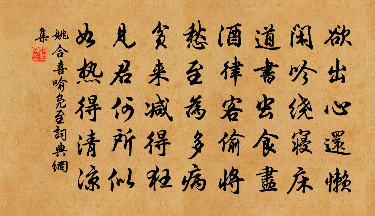 詩詞名句歷史字典書法欣賞書法字典國語詞典說文解字康熙字典古漢語字典標 題 作 者 詩 句 喜喻鳧至作者:姚合 朝代:唐代喜喻鳧至原文欲出心還懶,閒吟繞寢床。道書蟲食盡,酒律客偷將。愁至為多病,貧來減得狂。見君何所似,如熱得清涼。詩詞問答問:喜喻鳧至的作者是誰?答:姚合問:喜喻鳧至寫於哪個朝代?答:唐代問:喜喻鳧至是什麼體裁?答:五律姚合喜喻鳧至書法欣賞喜喻鳧至書法作品注釋全唐詩:卷501-51詩詞推薦過天津橋晴望姚合〔唐代〕閒立津橋上,寒光動遠林。皇宮對嵩頂,清洛貫城心。雪路初晴出,人家向晚深。自從王在鎬,天寶至如今。水蕉樓鑰〔宋代〕獵獵水芭蕉,如將隱士招。清風來處遠,袢暑坐中消。停雲 其二陶淵明〔魏晉〕停雲靄靄,時雨[氵蒙][氵蒙]。。八表同昏,平陸成江。有酒有酒,閒飲東窗。願言懷人,舟車靡從。大滌洞天留題二首秘仲威〔宋代〕紫府清都不可梯,何年宮闕下遷移。飛來殿閣風雷架,逼近岩崖日月馳。境靜固宜真聖宅,地靈唯許列仙知。想應題葉石軒學僧寮胡仲弓〔宋代〕靜坐求心印,傳經續祖燈。因吟呈佛句,方悟在家僧。芸葉熏檐蔔,枝辭剪葛藤。自從罵師後,無放可參承。御製慶先後升袝禮成七言六韻奉和寇準〔宋代〕天錫靈符興寶祚,澤流錦宇福含生。蒸蒸至孝鹹歸厚,翼翼精衷尚執盈。順考漢儀彰道廣,欽崇周典闡文明。豆籩定風波辛棄疾〔宋代〕聽我尊前醉後歌。人生亡奈別離何。但使情親千里近。須信。無情對面是山河。寄語石頭城下水。居士。而今渾不采蘩佚名〔先秦〕於以采蘩?於沼於沚。於以用之?公侯之事。於以采蘩?於澗之中。於以用之?公侯之宮。被之僮僮,夙夜在公。送僧入三峰釋仲皎〔宋代〕上人瞿曇裔,律身玉無瑕。力究毗尼論,注汪海無涯。振錫復何許,三峰隱蒼霞。堂上大道師,靈芝髮根芽。相見句楊億〔宋代〕眼中人是面前人。關榆漸落邊鴻過,誰勸劉郎酒十分。減字木蘭花徐鹿卿〔宋代〕狂吟江浦。不食人間煙火語。韋曲名家。也試河陽一縣花。群仙推去。暫寄嶺梅清絕處。笑俯清溪。只有清風明月寄陳次顏陳宓〔宋代〕人年六十志先衰,年過唯君意不疲。胸次嵬嵬山立壁,書叢矻矻鳥粘黐。重裘兼味人能賤,冬葛朝虀世所師。借問山居十二首淳藏王〔宋代〕一瓢顏子非為榮,四壁相如未是高。爭似山家真活計,屋頭松歆演秋濤。園蔬六首袁燮〔宋代〕攜鋤抱翁不辭勞,要使霜根足土膏。我去艱難生理窄,卻疑學圃屬吾曹。玉樓春辛棄疾〔宋代〕瘦筇倦作登高去。卻怕黃花相爾汝。嶺頭拭目望龍安,更在雲煙遮斷處。思量落帽人風度。休說當年功紀柱。謝公偈頌七十六首釋子益〔宋代〕現成公案,了無遷變。入得門來,一見便見。左顧則獅子嚬呻,右盼則象王迴轉。靈山一會儼然存,捏聚春風成一送春詞劉禹錫〔唐代〕昨來樓上迎春處,今日登樓又送歸。蘭蕊殘妝含露泣,柳條長袖向風揮。佳人對鏡容顏改,楚客臨江心事違。萬古春日汎舟南湖因遍游近港坐間書客所攜四扇張鎡〔宋代〕遠近高低錦樹明,直疑春教蝶多情。人間萬事思量盡,只好園居過此生。宮詞張公庠〔宋代〕北斗回杓欲建寅,宮嬪排備立春時。鐫花貼子留題處,只待金鑾學士詩。春有百花秋有月無門慧開禪師〔宋代〕春有百花秋有月,夏有涼風冬有雪。若無閒事掛心頭,便是人間好時節。名句推薦未收天子河湟地,不擬回頭望故鄉。令狐楚《少年行四首·其三》 草色青青柳色黃,桃花歷亂李花香。賈至《春思二首·其一》 殘月臉邊明,別淚臨清曉牛希濟《生查子·春山煙欲收》 姑蘇台上烏棲時,吳王宮裡醉西施。李白《烏棲曲》 不勁直,不能矯奸。韓非及後人《韓非子·孤憤》 閣道步行月,美人愁煙空。李白《上之回》 輕則寡謀,驕則無禮。左丘明《國語·周語·王孫滿觀秦師》 大雪北風催,家家貧白屋。環山樵《薛寶釵·雪竹》 門外無人問落花,綠陰冉冉遍天涯。曹豳《春暮·門外無人問落花》 茅檐人靜,蓬窗燈暗,春晚連江風雨。陸游《鵲橋仙·夜聞杜鵑》