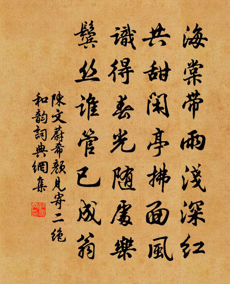 詩詞名句歷史字典書法欣賞書法字典國語詞典說文解字康熙字典古漢語字典標 題 作 者 詩 句 希顏見寄二絕和韻作者:陳文蔚 朝代:宋代希顏見寄二絕和韻原文海棠帶雨淺深紅,共甜閒亭拂面風。識得春光隨處樂,鬢絲誰管已成翁。詩詞問答問:希顏見寄二絕和韻的作者是誰?答:陳文蔚問:希顏見寄二絕和韻寫於哪個朝代?答:宋代陳文蔚希顏見寄二絕和韻書法欣賞希顏見寄二絕和韻書法作品詩詞推薦葉子山右史父宣義挽章二首呂祖謙〔宋代〕經笥深無底,高談一座傾。置身初濩落,有子晚光榮。命服鄉閭賀,安輿里巷迎。風枝何不定,忽忽到佳城。寄白頭陀白居易〔唐代〕近見頭陀伴,雲師老更慵。性靈閒似鶴,顏壯古於松。山里猶難覓,人間豈易逢。仍聞移住處,太白最高峰。獨坐吟邵雍〔宋代〕天告自丁寧,人多不肯聽。四時皆有景,萬物豈無情。禍福眼前事,是非身後名。誰能事閒氣,浪與世人爭。三用韻酬沈同年方岳〔宋代〕雨屢適從何許來,雙蓬無處避風埃。江湖誰共月千里,軒冕真同水一杯。縱有窮愁侵病骨,斷無榮辱到靈台。只銷次韻龍學丈鄧肅〔宋代〕水色山光入畫屏,浩然相對自由身。芳菲莫恨無情去,天地常藏不盡春。儻得江河化酒醴,何須瓦礫點金銀。花開奉使登終南山王灣〔唐代〕常愛南山游,因而盡原隰。數朝至林嶺,百仞登嵬岌。石壯馬徑窮,苔色步緣入。物奇春狀改,氣遠天香集。虛洞翠蛟亭呈孫元素鍊師張蘊〔宋代〕剡剡星虹白日寒,山香一曲落雲端。乘虬道士排空去,怒雨聲搖碧玉巒。送王恪郎中知襄州蘇轍〔宋代〕魏公德業冠當年,汝守威名竦漢邊。將相傳家俱未遠,子孫到處各推賢。風流最喜君真似,符竹連分政得專。峴首六月將晦,夜出凝歸門楊萬里〔宋代〕暑里街頭可久停,今宵無月也宵征。一天星點明歸路,十里荷香送出城。山轎聲聲柔櫓緊,葛衣眼眼野風清。五更鄭北山之元孫扁其樓王適莊為書北山之英四字金履祥〔宋代〕高牙大纛,虎節銅符。東將寬民,乃公所餘。合溪座上錢時〔宋代〕深碧沉沉冷欲秋,此時亭上飽追游。溪分溪合關何事,尚欠圜機訂九流。梅州重建中和堂劉克莊〔宋代〕中和堂昔隳於火,今剪荒榛再落成。博士尊師重演說,史君存古不更名。漸摩伋學三風熄,流布褒詩五瘴清。天子酬將作於少監方乾〔唐代〕由來至寶出毫端,五色炎光照室寒。仰望孤峰知聳峻,前臨積水見波瀾。冰絲織絡經心久,瑞玉雕磨措手難。不是梅花絕句五首要明叔仲威同作趙蕃〔宋代〕傍觀怪我底我病,不奈俗塵來敗人。故人寄我山中信,竹故歲寒梅告春。江城子(為滿春澤賦橫空樓)張炎〔宋代〕下臨無地手捫天。上雲煙。俯山川。棲止危巢,不隔道林禪。坐處清高風雨隔,全萬境,一壺懸。我來直欲挾飛仙賀陸鹽允濟二首黃公度〔宋代〕商飈送喜滿華軒,喬嶽鍾靈積慶門。天上台星對南極,人間佳節是中元。一時閩越看前輩,千載機雲見遠孫。香火別麻氏趙嘏〔唐代〕曉哭呱呱動四鄰,於君我作負心人。出門便涉東西路,回首初驚枕席塵。滿眼淚珠和語咽,舊窗風月更誰親。分離頌古一百首釋智愚〔宋代〕五十笑他先百步,何如參馬勝騎牛。不須重較多和少,歸到家山即便休。送集賢盛諫議出牧維揚宋庠〔宋代〕江海多年滯軾熊,書林諫霤得儒宗。寬條一劄仙泥熟,慈宴千觴湛露濃。迎舸蔽川交畫鷁,隊笳橫浦細吟龍。輕揚寄見首座釋善珍〔宋代〕借得茆齋傍澗泉,新年樂事勝常年。詩逢得意猶藏稿,琴畏知音自斷弦。鯨浪粘天思渡海,狼烽照夜憶游邊。嶮途名句推薦風回小院庭蕪綠,柳眼春相續。李煜《虞美人·風回小院庭蕪綠》 拆桐花爛熳,乍疏雨、洗清明。柳永《木蘭花慢·拆桐花爛熳》 微風搖紫葉,輕露拂朱房。沈約《詠芙蓉》 綠楊煙外曉寒輕,紅杏枝頭春意鬧。宋祁《玉樓春·春景》 處顛者危,勢豐者虧。王充《論衡·卷一·累害篇》 萬國奔騰,兩宮幽陷,此恨何時雪。黃中輔《念奴嬌·炎精中否》 夕陽無限好,只是近黃昏。李商隱《樂遊原 / 登樂遊原》 西湖又還春晚,水樹亂鶯啼。仲殊《訴衷情·寶月山作》 最是一年春好處,絕勝煙柳滿皇都。韓愈《早春呈水部張十八員外 / 初春小雨 / 早春》 其持之有故,其言之成理。荀子《荀子·非十二子》