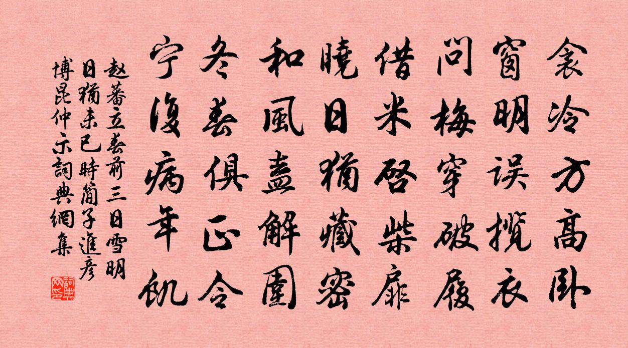 詩詞名句歷史字典書法欣賞書法字典國語詞典說文解字康熙字典古漢語字典標 題 作 者 詩 句 立春前三日雪明日猶未已時簡子進彥博昆仲示作者:趙蕃 朝代:宋代原文衾冷方高臥,窗明誤攬衣。問梅穿破履,借米啟柴扉。曉日猶藏密,和風盍解圍。冬春俱正令,寧復病年飢。詩詞問答問:《立春前三日雪明日猶未已時簡子進彥博昆仲示》的作者是誰?答:趙蕃問:該詩寫於哪個朝代?答:宋代書法欣賞立春前三日雪明日猶未已時簡子進彥博昆仲示書法作品詩文賞析【原題】:立春前三日雪明日猶未已時簡子進彥博昆仲示成父四首詩詞推薦西京道中羅隱〔唐代〕半夜秋聲觸斷蓬,百年身事算成空。禰生詞賦拋江夏,漢祖精神憶沛中。未必他時能富貴,只應從此見窮通。邊禽夏首病癒因招魯望皮日休〔唐代〕曉入清和尚袷衣,夏陰初合掩雙扉。一聲撥穀桑柘晚,數點舂鋤煙雨微。貧養山禽能個瘦,病關芳草就中肥。明朝南歌子向滈〔宋代〕路盡湘江水,人行瘴霧間。昏昏西日度嚴關。天外一簪初見、嶺南山。北雁連書斷,新霜點鬢斑。此時休問幾時還雜述林泳〔宋代〕仙掌承來求大藥,法身贖得費千金。兩宗曾誤國家事,百世誰明佛老心。過鄭曲祖詠〔唐代〕路向榮川谷,晴來望盡通。細煙生水上,圓月在舟中。岸勢迷行客,秋聲亂草蟲。旅懷勞 * ,淅淅有涼風。雨後城上種蜀葵效轆轤體聯句刁繹〔宋代〕不憚移根遠,姑憐向日姿。春風從自得,夜雨況相姿。敏速飛霜钁,婆娑擁碧枝。幽葩茲有待,雜卉漫多奇。野藿觀蟻二首楊萬里〔宋代〕一騎初來只又雙,全軍突出陣成行。策勛急報千丈長,渡水還爭一葦杭。次韻朱少章蘆橋柳橋二首晃沖之〔宋代〕蘆橋復柳橋,蘆枯柳可愛。不厭春與秋,主人客有待。和馬宜州卜居七首欣欣亭王炎〔宋代〕卉木俱含喜色,日迎杖屨床前。晚秀早芳相續,四時留得春天。余方悼亡適山圃牡丹芍藥盛開賦長句姜特立〔宋代〕白巾對紅艷,哀樂自不同。緬彼古之人,拔去體法中,親喪至嘔血,悲涕固無從。不哭即飲酒,陶然醉為鄉。吾愛又送湯國正五十六字杜范〔宋代〕一尊濁酒送君行,慘澹江雲似我情。已是園林堆落葉,更添風雨掃殘英。直存吾道曾何病,公在人心為不平。我久寄雲水禪師文興〔宋代〕百丈傳衣後,棲心近沃洲。道高歸毳侶,名重達凝旒。對話千峰雪,安禪萬木秋。仍聞有新偈,時向四方流。熙寧蜡祭十三首佚名〔宋代〕美若休德,民和幾豈。稼檣雲施,其積如墉。惠我四國,先檣之功。祭之百種,來享來崇。次韻謝惠山村送水仙王諶〔宋代〕自是神仙客,梅花亦讓青。綠垂雲葉重,黃映雪花輕。襪小凌波穩,杯斜帶露傾。一枝來贈我,吟幾覺春生。西庵晚步洪咨夔〔宋代〕荷披菰折似秋嚴,茀草叢中菊露尖。只有木犀荒不得,媻跚勃窣上亭檐。春和初遷坐堂中陸游〔宋代〕九月天始霜,澤中多烈風。東廂尋丈地,聊以安我躬。薪炭南山來,地爐晨暮紅。二月春始和,始蟲思舊螫。早堂小窗一首寄帥初舒岳祥〔宋代〕愛酒不嗜飲,行藏一小窗。斜陽屐樵磴,細雨笠漁矼。紅樹橋邊獨,青禽石上雙。永懷草廬葛,來訪鹿門龐。漁父詞一十八首入定呂岩〔唐代〕閉目藏真神思凝,杳冥中里見吾宗。無邊畔,迥朦朧,玄景觀來覺盡空。迎新倉守曾悅心道間偶賦馬廷鸞〔宋代〕黃旂紅幟走踆踆,曉出闉闍奔迓新。車蓋如雲騎如水,山頭牛背有閒人。田舍女李廌〔宋代〕田家女兒不識羞,草花竹葉插滿頭。紅眉紫襜青絹襖,領頸麤糙流黑油。日午擔禾上場曬,也喜年豐欲還債。傭工名句推薦去其智,絕其能,下不能意。韓非及後人《韓非子·主道》 中夜四五嘆,常為大國憂。李白《經亂離後天恩流夜郎憶舊遊書懷贈江夏韋太守良宰》 此中有真意,欲辨已忘言。陶淵明《飲酒·其五》 日落君山雲氣,春到沅湘草木,遠思渺難收。張孝祥《水調歌頭·過岳陽樓作》 日長唯鳥雀,春遠獨柴荊。杜甫《春遠 / 春運》 當言而不言,爾之責也;言而不聽,我之咎也。宋濂、王褘《元史·列傳·卷六》 洛陽城裡見秋風,欲作家書意萬重。張籍《秋思》 昨夜風開露井桃,未央前殿月輪高。王昌齡《 * 曲》 城門失火,殃及池魚。司馬光《資治通鑑·梁紀·梁紀十六》 思婦高樓上,當窗應未眠。徐陵《關山月》