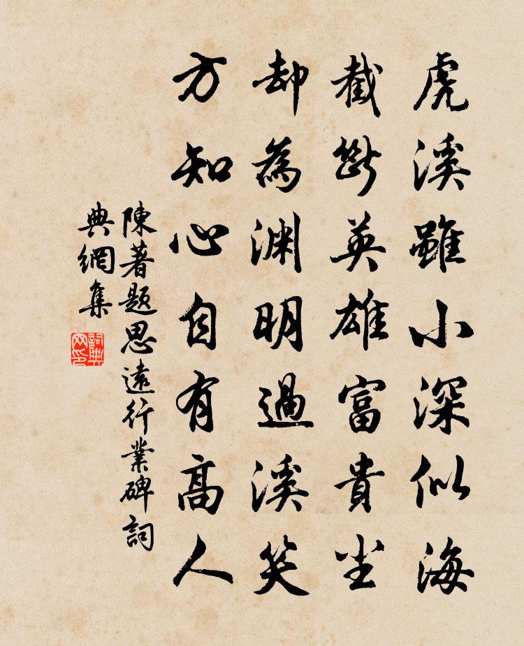 詩詞名句歷史字典書法欣賞書法字典國語詞典說文解字康熙字典古漢語字典標 題 作 者 詩 句 題思遠行業碑作者:陳著 朝代:宋代題思遠行業碑原文虎溪雖小深似海,截斷英雄富貴塵。卻為淵明過溪笑,方知心自有高人。詩詞問答問:題思遠行業碑的作者是誰?答:陳著問:題思遠行業碑寫於哪個朝代?答:宋代陳著題思遠行業碑書法欣賞題思遠行業碑書法作品詩詞推薦夏日梁王席送張岐州沈佺期〔唐代〕秦雞常下雍,周鳳昔鳴岐。此地推雄撫,惟良寄在斯。家傳七豹貴,人擅八龍奇。高傳生光彩,長林嘆別離。天人卜運算元蔡伸〔宋代〕重重雪外山,渺渺煙中路。路轉山橫無盡愁,正是分攜處。望極錦中書,腸斷魚中素。錦素沈沈兩未期,魚雁空相雪晴晚望賈島〔唐代〕倚杖望晴雪,溪雲幾萬重。樵人歸白屋,寒日下危峰。野火燒岡草,斷煙生石松。卻回山寺路,聞打暮天鍾。書吳江垂虹亭詩強至〔宋代〕千尺危橋跨浪雄,壓橋虛閣勢凌空。直疑有路通銀漢,又訝橫天臥玉虹。盡挹江山歸醉目,獨開懷抱向清風。卻嗟寄呂許公梅詢〔宋代〕十五年前忝一麾,公餘嘗得預言詩。玉階步武為霖早,雲路風波得志遲。浴鳳池深春蕩蕩,觀魚台古草離離。重來偈頌七十六首釋師觀〔宋代〕伎倆有盡,我默無窮。達磨不識,眼瞎耳聾。【中呂】喜春來_親登華岳悲張養浩〔元代〕親登華岳悲哀雨,自舍資財拯救民,滿城都道好官人。還自哂,比顏御史費精神。十年不作南柯夢,一旦還為西土壺中天慢/念奴嬌張掄〔宋代〕雪似瓊花鋪地,月如寶鑑當空。光輝上下兩相通。千古誰窺妙用。若悟珠生蚌腹,方知非異非同。陰陽相感有無中春日陸游〔宋代〕冷餅細生菜,老翁殊未衰。仍尋舊旛勝,一笑伴諸兒。趙司門成之新居連文鳳〔宋代〕何必山巔共水涯,閒心幽遠此相宜。喧無車馬紅塵少,樂有琴書白日遲。晴檻倚風初柳處,夜燈聽雨正蛙時。客來滿庭芳(後一日再置酒次馮通直韻)舒亶〔宋代〕紅葉飄零,寒煙疏淡,樓台半在雲間。望中風景,圖畫也應難。又是重陽過了,東籬下、 * 闌珊。陶潛病,風流舟中風雨梅公擇有不悅這色因用其韻與解之李彌遜〔宋代〕清於明鑑綠於藍,水色山容總一般。遊子正懷羈旅恨,聊將目力解眉攢。又答陳公美三首蘇洵〔宋代〕仲尼魯司寇,官職亦憶優。從祭肉不及,戴冕奔諸侯。當時不之知,為肉誠可羞。君子意有在,眾人但愆尤。置之寄贈致遠並呈現老范成大〔宋代〕草草家風節物新,從來憂病不憂貧。琴書稍覺浮生誤,香火惟知此事真。室里談空思二士,花間對影謾三人。祗愁張寺丞益齋蘇軾〔宋代〕張子作齋舍,而以益為名。吾聞之夫子,求益非速成。譬如遠遊客,日夜事征行。今年適燕薊,明年走蠻荊。東觀野飲陸游〔宋代〕青山千載老英雄,濁酒三杯失厄窮。訪古頹垣荒塹里,覓交屠狗賣漿中。平堤漸放春蕪綠,細浪遙翻夕照紅。已把偶游龍門北溪忽懷驪山別業因以言志示弟淑奉呈諸大僚韋嗣立〔唐代〕幽谷杜陵邊,風煙別幾年。偶來伊水曲,溪嶂覺依然。傍浦憐芳樹,尋崖愛綠泉。嶺雲隨馬足,山鳥向人前。地合戲題酒家壁陸游〔宋代〕漫道江南倚寺樓,豈如煙雨弄扁舟。並刀不翦清愁斷,楚練難縻白日留。湖上采菰甘似蜜,街頭買酒滑如油。金丹去者日以疏佚名〔兩漢〕去者日以疏,來者日以親。出郭門直視,但見丘與墳。古墓犁為田,松柏摧為薪。白楊多悲風,蕭蕭愁 * 。思還山丹五本盛開陳宓〔宋代〕今年丹荔逐南風,獨有名花發舊叢。似恨庭前絳囊少,殷勤來獻繡球紅。名句推薦人過留名,雁過留聲。佚名《增廣賢文·下集》 唯有長江水,無語東流。柳永《八聲甘州·對瀟瀟暮雨灑江天》 商人重利輕別離,前月浮梁買茶去。白居易《琵琶行 / 琵琶引》 燕子不知人去也,飛認闌乾。韓疁《浪淘沙·莫上玉樓看》 除害在於敢斷;得眾在於下人。尉繚《尉繚子·十二陵》 數萼初含雪,孤標畫本難。崔道融《梅花》 無限傷心夕照中,故國淒涼,剩粉余紅。夏完淳《一剪梅·詠柳》 愁無限,消瘦盡,有誰知?閒教玉籠鸚鵡念郎詩。納蘭性德《相見歡·落花如夢淒迷》 酒美梅酸,恰稱人懷抱。李清照《蝶戀花·上巳召親族》 夜雨滴空階,孤館夢回,情緒蕭索。柳永《尾犯·夜雨滴空階》