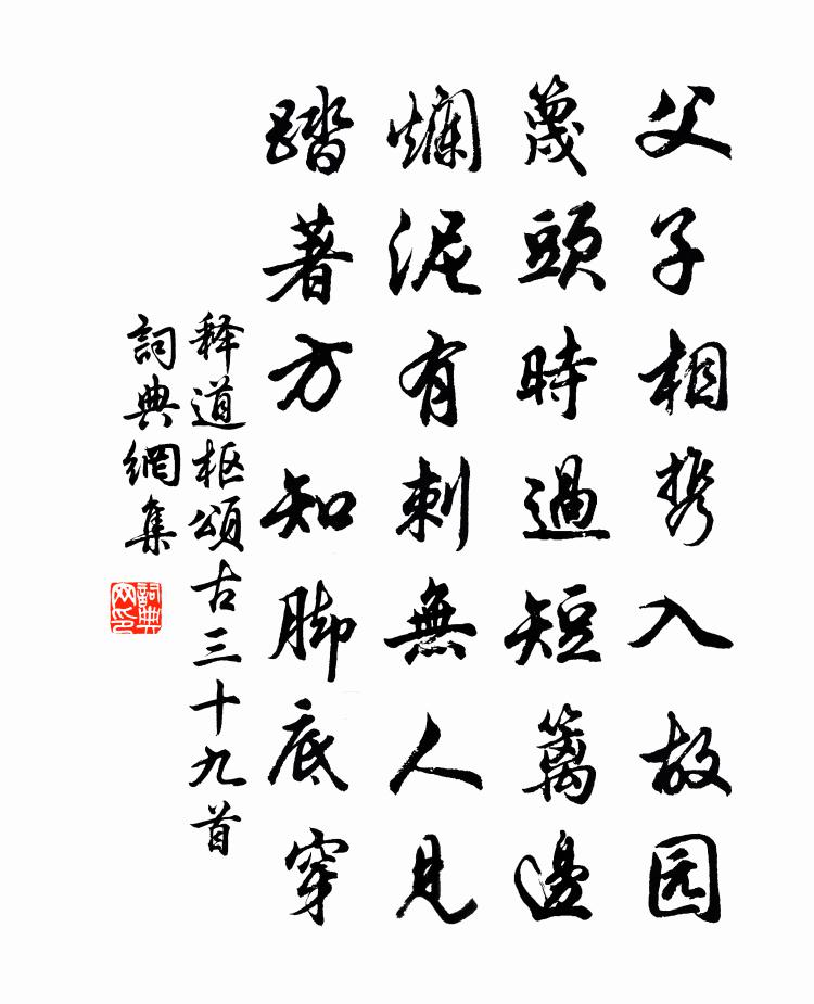 詩詞名句歷史字典書法欣賞書法字典國語詞典說文解字康熙字典古漢語字典標 題 作 者 詩 句 頌古三十九首作者:釋道樞 朝代:宋代頌古三十九首原文父子相攜入故園,篾頭時過短籬邊。爛泥有刺無人見,踏著方知腳底穿。詩詞問答問:頌古三十九首的作者是誰?答:釋道樞問:頌古三十九首寫於哪個朝代?答:宋代釋道樞頌古三十九首書法欣賞頌古三十九首書法作品詩詞推薦晚晴宋祁〔宋代〕積晦澄天宇,浮涼湛物華。遠雷猶送電,殘照即成霞。賀燕翻空迥,傾梧疊影斜。披襟無內熱,寧憶鄭生瓜。【雙調】慶東原_春日鶯啼晝張可久〔元代〕春日鶯啼晝,人倚樓,酒痕淹透香羅袖。薔薇水蘸手,荔枝漿爽口,瓊花露扶頭。有意送春歸,無奈傷春瘦。和許總卿王之望〔宋代〕我登峨嵋山,偉觀天下少,觀公驚俗句,更覺眉山小。短章鋒斬絕,大篇氣深杳。紙敝墨色渝,讀誦不能了。戲題承天寺法堂前柏黃庭堅〔宋代〕樹底 * 禪老家,高僧倚坐日西斜。有人試問西來事,無處安排玉如意。方者風旛動不同,不道風幡境亦空。開口席上賦得榛司馬光〔宋代〕微物生山澤,蕭條荊棘鄰。何人掇秋實,此日待嘉賓。雖無木桃贈,投此寄情親。句王松〔宋代〕舊菊籬邊又開了,故人天際未歸來。合江亭周燾〔宋代〕共思赤腳踏層冰,聊適江皋興自清。昨夜雨雲驅濁暑,曉來煙水快新晴。山疑九疊張雲勢,灘激千岩落布聲。巾履淒涼犯(北游道中寄懷)張炎〔宋代〕蕭疏野柳嘶寒馬,蘆花深、還見遊獵。山勢北來,甚時曾到,醉魂飛越。酸風自咽。擁吟鼻、征衣暗裂。正淒迷,武陵春吳潛〔宋代〕慘慘淒淒秋漸緊,風雨更瀟瀟。強把爐薰寄寂寥。無語立亭皋。客路十年成底事,水國更停橈。蒼鳥橫飛過野橋。次韻舍弟游本覺寺李彌遜〔宋代〕招提俯秋水,畫手借王維。霜磬遞風韻,曉林翻露姿。茶煙邀客竚,帆影喚舟移。它日成歸夢,來興楚子悲。淳化中朝會二十三首佚名〔宋代〕大君隆至化,興運契千齡。觀禮俄班瑞,夷寅盡實庭。成文調露樂,奉聖拱辰星。舞佾方更進,朝陽上楚萍。又贈劉正將項安世〔宋代〕義山仙去飛卿死,今代劉郎以字行。吟到江都燕台曲,一生深處許誰明。大自在庵郭印〔宋代〕茫茫三界中,何處不自在。情存想未除,轉側成拘礙。長林偶坐舒岳祥〔宋代〕喬木超然兀老花,一坡盤礴轉崇岡。山翁偶坐談何事,應賞江風一味涼。船子贊釋可湘〔宋代〕藥山之子石頭孫,飢過心荒浪里奔。得個錦鱗如許大,看來當與道吾分。紅窗迥王哲〔元代〕七十三,三十七。恁時節思量,王吉王吉。崖畔險也兀底,卻堤防腳失。奉勸回頭休要執。戴包巾、只在來年元日惜分飛(吳氏館寄內童氏)陳著〔宋代〕築壘愁城書一紙。雁雁兒將不起。好去西風裡。到家分付眉顰底。落日闌乾羞獨倚。十里江山萬里。容易成憔悴。上清宮范成大〔宋代〕歷井捫參興未闌,丹梯通處更躋攀。冥濛蜀道一雲氣,破碎岷山千髻鬟。但覺星辰垂地上,不知風雨滿人間。蝸牛和慎思秋日同文館詩蔡肇〔宋代〕秸卵因時化,如何赴越雞。逸群來冀北,屏氣入淮西。盛事兼三物,浮辭斥百題。慎須精藻鑒,寵辱異雲泥。范村雪後范成大〔宋代〕習氣猶餘燼,鍾情未濕灰。忍寒貪看雪,諱老強尋梅。熨貼愁眉展,勾般笑口開。直疑身健在,時有句飛來。名句推薦誰念文園病客?夜色沉沉,獨抱一天岑寂。張埜《奪錦標·七夕》 鳥無聲兮山寂寂,夜正長兮風淅淅。李華《弔古戰場文》 岸邊兩兩三三,浣沙游女。柳永《夜半樂·凍雲黯淡天氣》 漠漠帆來重,冥冥鳥去遲。韋應物《賦得暮雨送李胄 / 賦得暮雨送李曹》 江水浸雲影,鴻雁欲南飛。朱熹《水調歌頭·隱括杜牧之齊山詩》 金剛則折,革剛則裂。劉向《說苑·敬慎》 絕頂茅庵里,老衲正孤吟。納蘭性德《水調歌頭·題西山秋爽圖》 良辰當五日,偕老祝千年。權德輿《端午日禮部宿齋有衣服彩結之貺以詩還答》 有理言自壯,負屈聲必高。馮夢龍《警世通言·卷十五》 壽酒還嘗藥,晨餐不薦魚。錢起《送外甥懷素上人歸鄉侍奉》