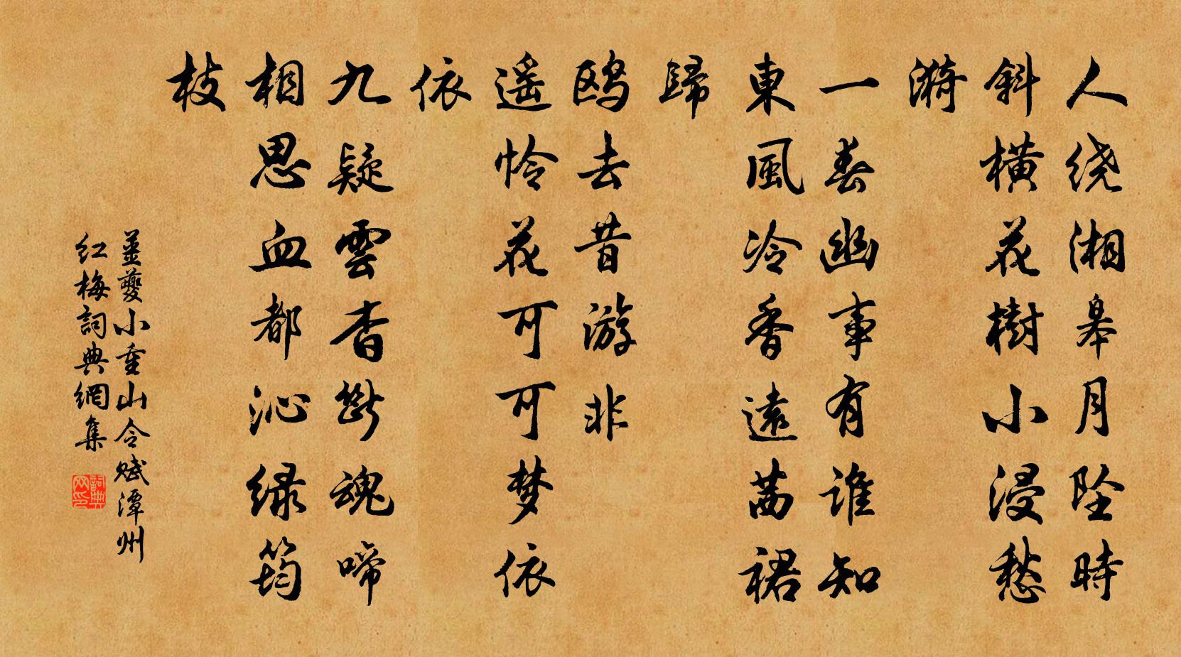 起句“人繞湘皋月墜時”,點明人物 、地點、時間。湘皋,湘江岸邊。屈原《離騷》:“步余馬於蘭皋兮 。”註:“澤曲曰皋。”水濱江岸往往是情人幽會的理想場所,加之紅梅掩映,更富詩情畫意的美感。然而此刻詞人寫的不是相聚時的歡樂,而是寫離別後的哀愁。一個“繞”字,寫出百般無奈,萬種離愁。繞者,徘徊也。“月墜”二字說明其“人”(抒情詩中的主人翁常常是作者自己)已在此徘徊良久。月墜湘皋,環境淒清,以此烘托心境,其愁苦悲涼可以想見。第二、三兩句由人及梅,正麵點題。林逋《梅花》詩云:“疏影橫斜水清淺,暗香浮動月黃昏 。”然詞人不是寫梅影映照於水面 ,而是寫梅影浸透在水中 ,著一“浸”字 ,感情已很強烈,再以“愁”字形容漣漪,將漣漪擬人化了。王國維說 :“以我觀物,故物皆著我之色彩 。”(《人間詞話》)。愁人觀物,觸目皆是愁色,這在美學和修辭上叫做移情。詩人寫梅多寫其橫,寫其斜。如蘇東坡《和秦太虛憶建溪梅花》詩云:“江頭千樹春欲暗,竹外一枝斜更好 。”詞人這裡不僅寫其疏影橫斜,而且突出一個“小”字。“花樹小”,一作“花自小”。小字有嬌小纖弱意 。唯其嬌弱,更顯得楚楚可憐,讓人頓起愛心。以上三句用寫意的筆法,描繪出潭州紅梅獨特的品格風貌,奠定了全篇離別相思的基調。