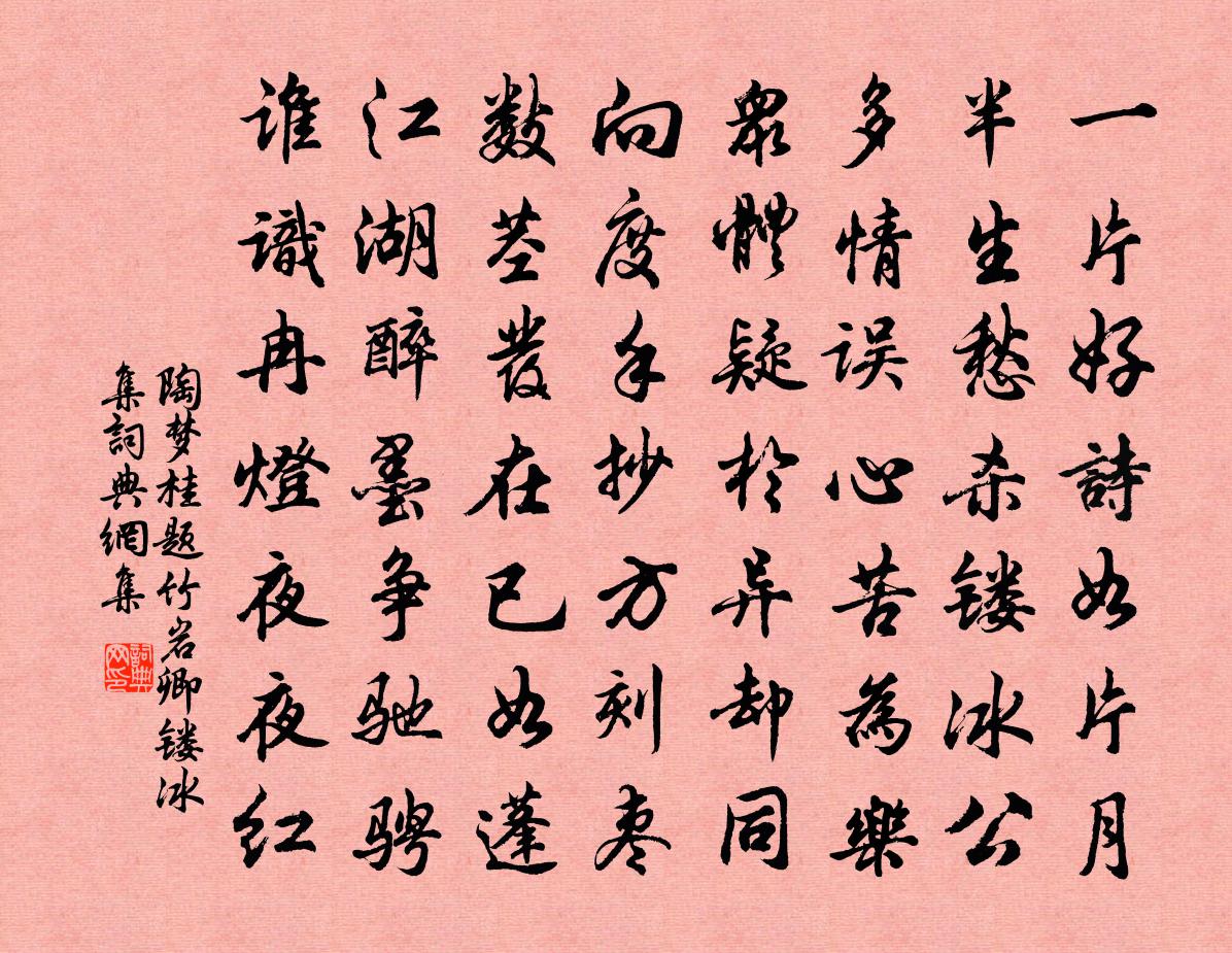 詩詞名句歷史字典書法欣賞書法字典國語詞典說文解字康熙字典古漢語字典標 題 作 者 詩 句 題竹岩卿鏤冰集作者:陶夢桂 朝代:宋代題竹岩卿鏤冰集原文一片好詩如片月,半生愁殺鏤冰公。多情誤心苦為樂,眾體疑於異卻同。向度手抄方刻棗,數莖發在已如蓬。江湖醉墨爭馳騁,誰識冉燈夜夜紅。詩詞問答問:題竹岩卿鏤冰集的作者是誰?答:陶夢桂問:題竹岩卿鏤冰集寫於哪個朝代?答:宋代陶夢桂題竹岩卿鏤冰集書法欣賞題竹岩卿鏤冰集書法作品詩詞推薦清風十韻楊億〔宋代〕素魄離箕舌,鳴鳶載錦綢。微涼生玉宇,餘韻泛蘭臯。竿轉相烏數,廚搖萐莆勞。渚苹偏靃靡,苑樹更蕭騷。五斗賈天錫惠寶薰乞詩多以兵衛森畫戟燕寢凝清香黃庭堅〔宋代〕衣篝麗紈綺,有待乃芬芳。當念真富貴,自薰知見香。題雜書卷六言三首劉克莊〔宋代〕論篤惟昌黎伯,史法止太史公。誰雲孔墨道二,但見聃非傳同。大醉梅花下走筆賦此陸游〔宋代〕閉門坐嘆息,不飲輒千日。忽然酒興生,一醉須一石。檐頭花易老,旗亭酒常窄。出郊索一笑,放浪謝形役。把酒九日懷封元寂王勃〔唐代〕九日郊原望,平野遍霜威。蘭氣添新酌,花香染別衣。九秋良會少,千里故人稀。今日龍山外,當憶雁書歸。漁父趙蕃〔宋代〕自得江湖樂,信無朝市求。扁舟載妻子,沒齒是春秋。見客如成愕,問魚多掉頭。嚴陵疑可亞,范蠡豈其流。頌古二十九首釋師體〔宋代〕若瓠連根苦,同坑無異土。二千年已前,一火破落戶。歲旦立春張鎡〔宋代〕結宇城隅野老同,只將歌詠 * 功。枯荄亦喜春回早,為在條風振拂中。歲晚陸游〔宋代〕雲暗郊原雪意稠,天公似欲富來麰。布衾歲久真如鐵,詎取私懷一己憂。于飛樂(代人作別後曲)毛滂〔宋代〕記瞢騰,濃睡里,一片行雲。未多時、夢破雲驚。聽轆轤,聲斷也,井底銀瓶。不知羅帶,等閒便、結得同心。系雪中見梅花二首李覯〔宋代〕數枝斜出短牆陰,密雪無端苦見侵。天意似憐群木妒,盡教枯朽作瑤林。何滿子孫光憲〔唐代〕冠劍不隨君去,江河還共恩深。歌袖半遮眉黛慘,淚珠旋滴衣襟。惆悵雲愁雨怨,斷魂何處相尋。賞花趙葵〔宋代〕昨日新園去看花,路邊郎女阿誰家。看車寶馬相追逐,笑語歸來日未斜。浣溪沙蔡伸〔宋代〕且斗尊前見在身。昔游如夢可銷魂。玉容依約舊精神。千里重來人事改,一杯相屬意還新。韶華不減洞中春。春晚書村落閒事陸游〔宋代〕千古會稽城,閭閻樂太平。豐年觀米價,霽色聽禽聲。俗儉憎浮侈,民淳力釣耕。豳詩有七月,字字要躬行。花心動·柳吳文英〔宋代〕十里東風,裊垂楊、長似舞時腰瘦。翠館朱樓,紫陌青門,處處燕鶯晴晝。乍看搖曳金絲細,春淺映、鵝黃如酒。白蓮楊萬里〔宋代〕井花新抻白芙蕖,坐看紛紛脫雪膚。自拾落英浮水面,玉舟撩亂滿江湖。偈二十二首釋洵〔宋代〕若欲正提綱,直教大地荒。擬來沖雪刃,不免露鋒鋩。齋中傅夢得〔宋代〕惟有閒中日最長,薰風拂拂透修廊。半窗槐影侵書葉,一曲蟬聲送夕陽。強把茶甌醒困眼,久無詩債拌枯腸。何妨雜劇·醉思鄉王粲登樓鄭光祖〔元代〕楔子(老旦扮卜兒上,詩云)急急光明似水流,等閒白了少年頭。月過十五光明少,人到中年萬事休。老身姓李,名句推薦試問閒愁都幾許?賀鑄《青玉案·凌波不過橫塘路》 君子,不可以不修身。思修身,不可以不事親。思事親,不可以不知人。思知人,不可以不知天。子思《中庸·第二十章》 馬蕭蕭,人去去,隴雲愁。孫光憲《酒泉子·空磧無邊》 馬蹄濃露,雞聲淡月,寂歷荒村路。張榘《青玉案·被檄出郊題陳氏山居》 中山人予之貓,貓善捕鼠及雞。劉基《乞貓》 暗柳啼鴉,單衣佇立,小簾朱戶。周邦彥《瑣窗寒·寒食》 不是暗塵明月,那時元夜。蔣捷《女冠子·元夕》 想當年,金戈鐵馬,氣吞萬里如虎。辛棄疾《永遇樂·京口北固亭懷古》 相思記取,愁絕西窗夜雨。韓元吉《薄倖·送安伯弟》 寧做太平犬,莫做離亂人!佚名《增廣賢文·下集》
