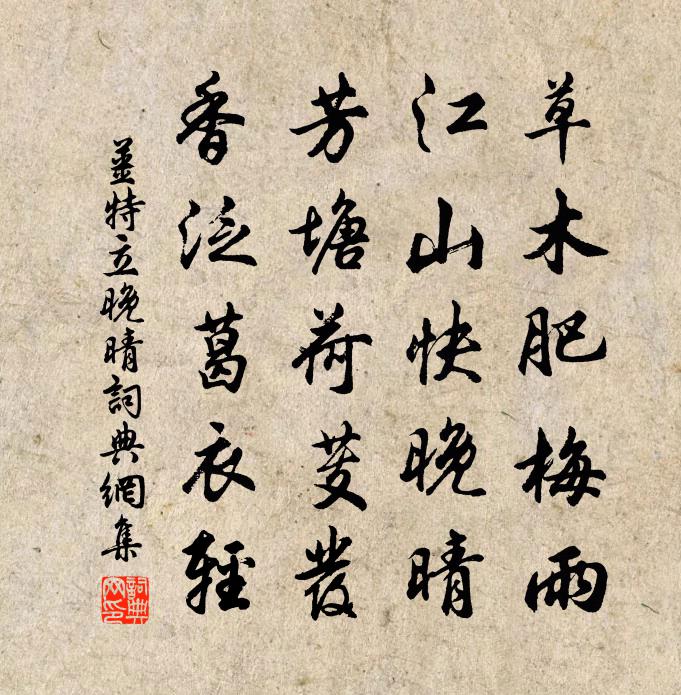 詩詞名句歷史字典書法欣賞書法字典國語詞典說文解字康熙字典古漢語字典標 題 作 者 詩 句 晚晴作者:姜特立 朝代:宋代晚晴原文草木肥梅雨,江山快晚晴。芳塘荷芰發,香泛葛衣輕。詩詞問答問:晚晴的作者是誰?答:姜特立問:晚晴寫於哪個朝代?答:宋代姜特立晚晴書法欣賞晚晴書法作品詩詞推薦兵部宋尚書輓詞二首周必大〔宋代〕識面嗟雖晚,論心樂未央。經帷叨並席,官舍許連牆。俶訝親針石,俄驚授印章。梅花佳句在,無復鐵心腸。西明落照釋文珦〔宋代〕幽居面西嶺,窗幾有真趣。睡覺無人聲,殘陽在高樹。春宵劉兼〔唐代〕春雲春日共朦朧,滿院梨花半夜風。宿酒未醒珠箔卷,艷歌初闋玉樓空。五湖范蠡才堪重,六印蘇秦道不同。再取挽林致賢提舉陳傅良〔宋代〕一經韋氏學,五桂竇儀家。每恥鄉評過,深懲履道華。人方貴全璧,事已墮空花。褒袞來黃閣,千年置齒牙。青玉案向滈〔宋代〕多情賦得相思分。便攬斷、愁和悶。萬種千般說不盡。吃他圈櫃,被他拖逗,便佛也、須教恨。傳消寄息無憑信。鄂州節推陳榮緒惠示沿檄崇陽道中六詩老懶不黃庭堅〔宋代〕鹹寧走蘆子,終日喬木陰。太丘心灑落,古松韻清深。聊持不俗耳,靜聽無弦琴。非今胡部律,而獨可人心。和王鞏見寄三首蘇轍〔宋代〕南遷春及秋,江湖未雲半。逮此歸路長,始悟行日遠。幽憂脫沉痼,清夢驚婉娩。行行逢故人,笑語雜悲泫。江秋畫緋桃題詩賈蓬萊〔宋代〕硃砂顏色瓣重台,曾是劉郎舊看來。只好天台雲里種,莫教移近俗人栽。夜雨思栝蒼游陸游〔宋代〕道心退惰如風鷁,世念堅疆似火牛。安得短篷湖海去,夜深聽雨琵琶洲。訴衷情曾覿〔宋代〕晚妝初試蕊珠宮。隨步異香濃。檀槽緩垂鸞帶,纖指拈春蔥。鶯語巧,上林中。正嬌慵。暫教花下,簾影微開,多題張十八所居韓愈〔唐代〕君居泥溝上,溝濁萍青青。蛙歡橋未掃,蟬嘒門長扃。名秩後千品,詩文齊六經。端來問奇字,為我講聲形。贈隱者歐陽修〔宋代〕五嶽嵩當天地中,聞伊仍在最高峰。山藏六月陰崖雪,潭養千年蛻骨龍。物外自應多至樂,人間何事忽相逢。飲罷發孔鎮晨炊漆橋道中紀行十首楊萬里〔宋代〕斫地燒畲旋旋開,豆花麻莢更菘栽。荒山半寸無遺土,田父何曾一飽來。聞北虜入靈州二首李頻〔唐代〕河冰一夜合,虜騎入靈州。歲歲徵兵去,難防塞草秋。見說靈州戰,沙中血未乾。將軍日告急,走馬向長安。得伯逢書宋祁〔宋代〕書來何所道,報我二毛生。種種因年化,星星著領明。別離才幾日,感慨若為情。且莫悲遲暮,須容四海兄。慈恩寺石磬歌盧綸〔唐代〕靈山石磬生海西,海濤平處與山齊。長眉老僧同佛力,咒使鮫人往求得。珠穴沈成綠浪痕,天衣拂盡蒼苔色。星漢陳老畫牛趙汝績〔宋代〕老融棄發逃於禪,胸藏丘壑身林泉。時拈寸草幻墨汁,慘澹咫尺生風煙。尤工畫牛古絕比,不特形似真神全。平生遠懷二首蘇泂〔宋代〕去國三千里,書來一再行。過從應夙數,契闊更殊鄉。沙草留徐步,溪鷗傍晚涼。人間無限事,獨自有難忘。念奴嬌趙鼎臣〔宋代〕舊遊何處,記金湯形勝,蓬瀛佳麗。淥水芙蓉,元帥與賓僚,風流濟濟。萬柳庭邊,雅歌堂上,醉倒春風裡。十年金燈花薛濤〔唐代〕闌邊不見蘘蘘葉,砌下惟翻艷艷叢。細視欲將何物比,曉霞初疊赤城宮。名句推薦賢者以其昭昭,使人昭昭;今以其昏昏,使人昭昭。孟子《孟子·盡心章句下·第二十節》 成事莫說,覆水難收。佚名《增廣賢文·上集》 寢興目存形,遺音猶在耳。潘安《悼亡詩三首》 雲拼欲下星斗動,天樂一聲肌骨寒。劉禹錫《八月十五夜桃源玩月》 相逢意氣為君飲,系馬高樓垂柳邊。王維《少年行四首》 迸籜分苦節,輕筠抱虛心。柳宗元《巽公院五詠·苦竹橋》 君子以見善則遷,有過則改。佚名《易傳·象傳下·益》 縱明月相思千里隔。夢咫尺。勤書尺。賀鑄《琴調相思引·送范殿監赴黃崗》 曲終漏盡嚴具陳,月沒星稀天下旦。佚名《雞鳴歌》 狗吠深巷中,雞鳴桑樹顛。陶淵明《歸園田居·其一》