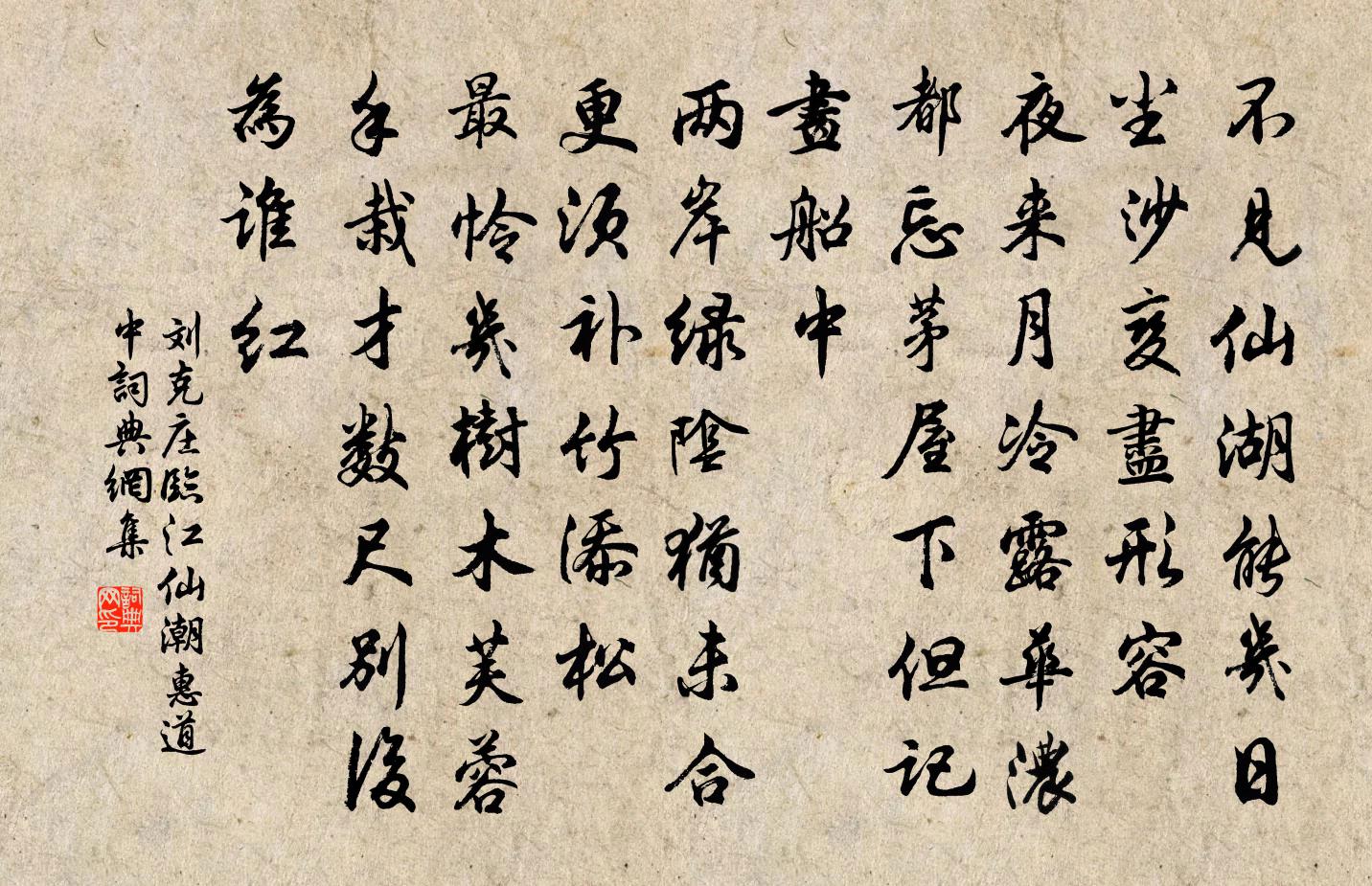 詩詞名句歷史字典書法欣賞書法字典國語詞典說文解字康熙字典古漢語字典標 題 作 者 詩 句 臨江仙(潮惠道中)作者:劉克莊 朝代:宋代臨江仙(潮惠道中)原文不見仙湖能幾日,塵沙變盡形容。夜來月冷露華濃。都忘茅屋下,但記畫船中。兩岸綠陰猶未合,更須補竹添松。最憐幾樹木芙蓉。手栽才數尺,別後為誰紅。詩詞問答問:臨江仙(潮惠道中)的作者是誰?答:劉克莊問:臨江仙(潮惠道中)寫於哪個朝代?答:宋代問:臨江仙(潮惠道中)是什麼體裁?答:詞問:劉克莊的名句有哪些?答:劉克莊名句大全劉克莊臨江仙(潮惠道中)書法欣賞臨江仙(潮惠道中)書法作品詩詞推薦讀方元善落花詩有感舒岳祥〔宋代〕次第花開次第飛,總堪飲酒與吟詩。絕憐新綠光如沃,何必繁英儘在枝。眉州燕遊雜詠十首碧瀾堂晁公溯〔宋代〕清瀾深幾許,夏潦冬即空。定非蛟龍宅,徒為螺蚌宮。題仙居偉羌山六絕陳襄〔宋代〕天鞠精靈久貯儲,中間豪傑出無虛。鄉民世世家於此,爭使兒孫不讀書。送杜景齊歸平陽二首方回〔宋代〕每憶東甌郡,柑花入夢香。市人無索服,田婦亦紅妝。鱟蟹豐漁戶,犀珠聚{左糹右集}商。年登猶足樂,何必殢山堂偶書文同〔宋代〕幾日無公事,山堂興頗清。和詩防積壓,丸藥趁清明。斸石新棱出,澆蔬晚甲生。此皆忙外得,低首笑塵纓。寄元九白居易〔唐代〕身為近密拘,心為名檢縛。月夜與花時,少逢杯酒樂。唯有元夫子,閒來同一酌。把手或酣歌,展眉時笑謔。今春躬耕籍田詩夏竦〔宋代〕廣阼承嚴享,東廛錯上儀。纁裳拂黛耜,彩繅映紅縻。內宰登嘉種,餘夫列縹陂,游場玉趾遠,盡隴紺轅遲。藨蔉酹江月/念奴嬌方岳〔宋代〕楚天秋早,過中元拈指,蓂飛四莢。怪得千門佳氣滿,恰值生申時節。蓬矢當年,椒盤今夕,瑞木金爐藝。主人情惠山煎茶釋智朋〔宋代〕瓦瓶破曉汲清泠,石鼎移來壞砌烹。萬壑松風供一啜,自籠雙袖水邊行。偈頌七十六首釋子益〔宋代〕我此一門,初無關鍵。半合半開,東扇西扇。千聞不如一見。郊廟朝會歌辭建隆乾德朝會樂章二十八首佚名〔宋代〕螭階聊載筆,紀瑞軼唐虞。丹鳳血金奏,黃龍負寶圖。群付薪棫樸,仁政煦蒲虜。蕩蕩巍巍德,豚魚信自孚。曉登迎春閣劉象〔唐代〕未櫛憑欄眺錦城,煙籠萬井二江明。香風滿閣花盈戶,樹樹樹梢啼曉鶯。南堂五首蘇軾〔宋代〕暮年眼力嗟猶在,多病顛毛卻未華。故作明窗書小字,更開幽室養丹砂。減字木蘭花佚名〔宋代〕香肌清瘦。淚濕輕紅疏雨後。笑靨微開。宿雨微醺越女腮。多情無奈。玉管休吹簾影外。薄晚池台。惆悵繁華夢裡滿江紅彭元遜〔宋代〕翠袖餘寒,早添得、銖衣幾重。何須怪、妍華都謝,更為誰容。銜盡吳花成鹿苑,人間不恨雨和風。便一枝、流落浣溪沙(李參政壁領客訪環湖瑞蓮席間索賦)魏了翁〔宋代〕曉鏡搖空髻聳丫。夜盤承露掌分叉。翠芳綽約總無華。欲往從之空悵望,潛雖伏矣莫藏遮。淤泥深處瑞蓮花。送李儋韋應物〔唐代〕別離何從生,乃在親愛中。反念行路子,拂衣自西東。日昃不留宴,嚴車出崇墉。行游非所樂,端憂道未通。春野上巳楊凝〔唐代〕帝京元巳足繁華,細管清弦七貴家。此日風光誰不共,紛紛皆是掖垣花。東峰亭各賦一物得棲煙鳥李岑〔唐代〕從來養毛羽,昔日曾飛遷。變轉對朝陽,差池棲夕煙。遇此枝葉覆,夙舉冀沖天。吳公惠酒因謝文同〔宋代〕山城物色正嚴冬,梅放長梢露小紅。破萼未深聊敵雪,收香不密任隨風。盡教插滿金釵上,休管吹殘玉笛中。須至名句推薦五更疏欲斷,一樹碧無情。李商隱《蟬》 不是暗塵明月,那時元夜。蔣捷《女冠子·元夕》 飛鳥沒何處,青山空向人。劉長卿《餞別王十一南遊》 人逢喜事精神爽,月到中秋分外明。馮夢龍《醒世恆言·卷十八》 日月之行,若出其中。曹操《觀滄海 / 碣石篇》 長風幾萬里,吹度玉門關。李白《關山月》 疏籬曲徑田家小。雲樹開清曉。周邦彥《虞美人·疏籬曲徑田家小》 井蛙不可以語于海者,拘於虛也;夏蟲不可以語於冰者,篤於時也莊子《莊子·外篇·秋水》 雪裡溫柔,水邊明秀,不借春工力。辛棄疾《念奴嬌·梅》 而今才道當時錯,心緒淒迷。納蘭性德《採桑子·當時錯》
