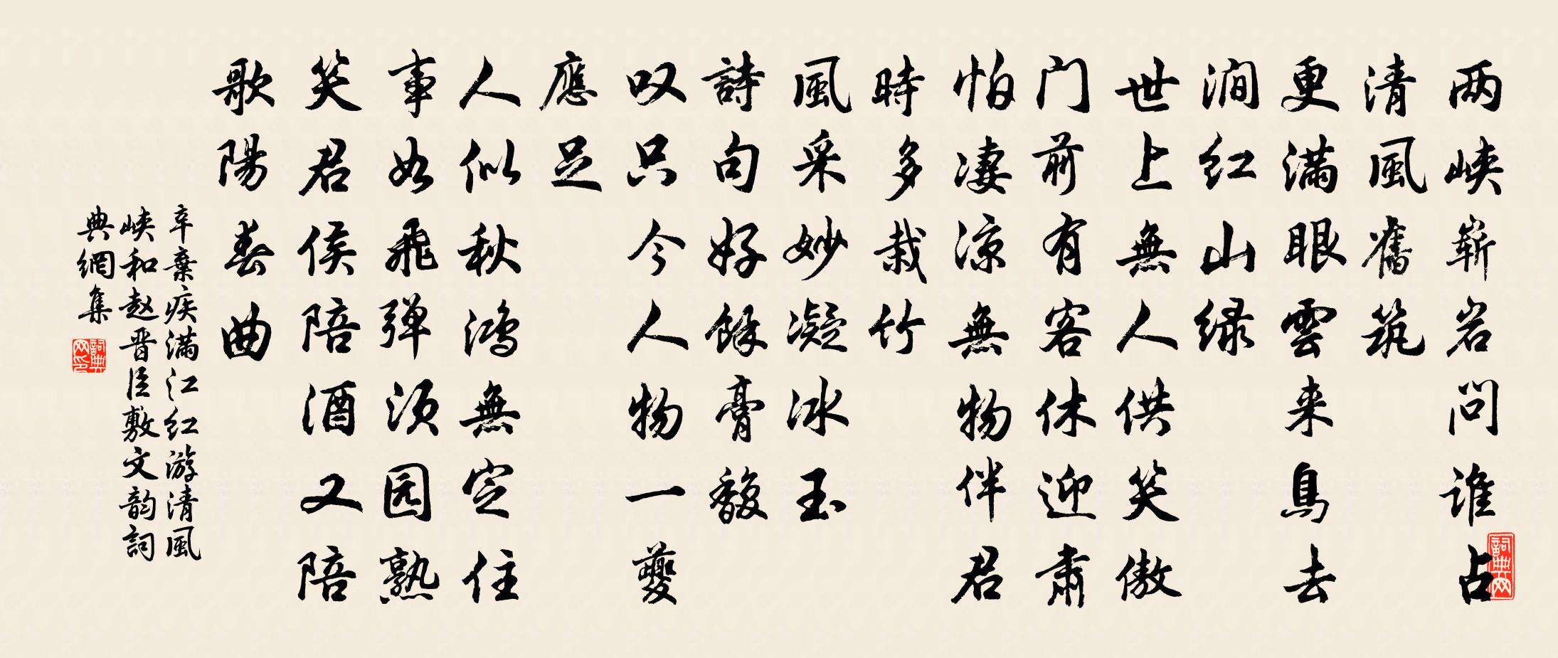 兩峽嶄岩,問誰占、清風舊築。更滿眼、雲來鳥去,澗紅山綠。