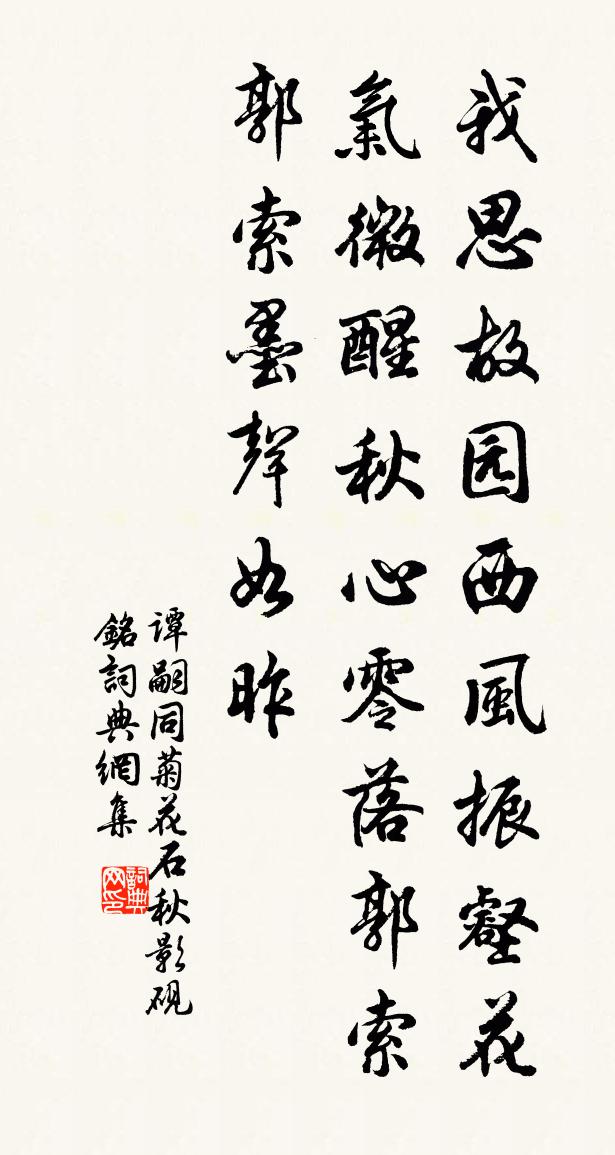 詩詞名句歷史字典書法欣賞書法字典國語詞典說文解字康熙字典古漢語字典標 題 作 者 詩 句 菊花石秋影硯銘作者:譚嗣同 朝代:清代菊花石秋影硯銘原文我思故園,西風振壑。花氣微醒,秋心零落。郭索郭索,墨聲如昨。詩詞問答問:菊花石秋影硯銘的作者是誰?答:譚嗣同問:菊花石秋影硯銘寫於哪個朝代?答:清代譚嗣同菊花石秋影硯銘書法欣賞菊花石秋影硯銘書法作品詩詞推薦自桃川至辰州絕句四十有二趙蕃〔宋代〕試手灘頭水亂流,鐵槍崖下晚維舟。兩階舞羽方閒暇,何事茲名有佩牛。聞喜宴李教君瑞不赴小詩讚美劉克莊〔宋代〕膾人肝與采山薇,舉世營營為飽飢。始信洋洋而逝矣,已烹鶂鶂復哇之。伏雌雉亦防身害,疇昔羊能兆禍基。獨有暘谷偶成裘萬頃〔宋代〕愛日祛愁霧,微和散積陰。一窗塵外趣,萬竹歲寒心。士要崇清節,吾將老故林。抱琴聊一醉,何用覓知音。和李似矩馬圖歌次韻王之道〔宋代〕畫工妙處稱毛羽,我欲論功第先兔。不知心手會天機,象管紛紛誰比數。寥寥千載一曹霸,墨妙於今傳二怪。龔生石亭野老家戴復古〔宋代〕野老將余到石亭,先呼小豹出相迎。依憑林谷住家穩,奔走兒童見客驚。牛豕與人爭徑路,桑麻繞屋蔽柴荊。溪邊漢江岸二首陳造〔宋代〕一自陽侯戰雨師,棗畦桑隴但空陂。此君屹立如尊勇,依舊青青似昔時。金陵雜興二百首蘇泂〔宋代〕睍睆飛來載好音,分明殘夏勝春深。小窗誰作幽人伴,惟是爐香共綠陰。讀書四首曾幾〔宋代〕朝游夕詠一窗書,只要今吾勝昔吾。未識此間真氣味,直緣聖處少工夫。昭君出塞圖艾性夫〔宋代〕長門寫遍泥金貼,春風暗老如花靨。臂紗尚護紅守宮,妾命君恩盡如葉。一朝結束嫁荒陲,一馬前導五馬隨。老奚送趙德莊右司赴江東漕八首曾協〔宋代〕鄉來遠門牆,引睇想光輝。宦遊偶相值,間關得因依。都門送星軺,依然寸心違。勿為賈胡留,速書李子歸。次韻王信州游棲雲鄧肅〔宋代〕勝游出林杪,參天僅一分。從君如附驥,顧我願為雲。野色連空碧,幽香襲露薰。耦耕當卜此,橫笛夜相聞。秋窗雜興高吉〔宋代〕月郎眾星稀,天高萬籟息。草露濕秋蟲,悲悽聲唧唧。隔窗聽鳴機,寒光曙猶織。微物固催人,尤為貧女惜。過喜祥山館王建〔唐代〕夜過深山算驛程,三回黑地聽泉聲。自離軍馬身輕健,得向溪邊盡足行。黃梅劉宰〔宋代〕林梢脆實薦辛酸,尚記兒時刮目看。老去齒牙無復昔,曉枝猶喜墮金丸。劉益之判院挽章姜特立〔宋代〕傾蓋如今五十春,中間還得綴華姻。單于萬里同哀使,馬援一鄉稱善人。告老已能官及子,頒恩更喜爵榮親。佳城諸君用東坡玉堂觀郭熙畫詩韻題江山王君平遠陳文蔚〔宋代〕有客有客心地閒,樓外青林林外山。風煙出沒美無度,依約圖畫有無間。眼隨白鳥去邊遠,一聲漁唱江村晚。此時予以四韻記陸大夫三高圖自謂能省句矣後作絕晁說之〔宋代〕馬解馱經度碧空,便令王許伴支公。山童野仆立如石,忘卻儂曾在會中。謫官南康軍徐誼〔宋代〕花飛片片上衣襟,拾得飛花寘柳陰。莫遣便隨流水去,東君應有惜花心。筆興吟邵雍〔宋代〕窗晴氣和暖,酒美手柔軟。興逸情撩亂,筆落春花爛。代趙丞相作尚書輓詩三首項安世〔宋代〕劍閣重來日,瀛洲僅閱旬。一從充保傅,五見易冬春。作聖工夫久,膺圖歲月新。九重深悼處,早晚付經綸。名句推薦昔時賢文,誨汝諄諄。佚名《增廣賢文·上集》 憑觴靜憶去年秋,桐落故溪頭。晏幾道《訴衷情·憑觴靜憶去年秋》 不言之教,無為之益,天下希及之。老子《老子·德經·第四十三章》 明妃留在兩眉愁,萬古春山顰不盡元好問《玉樓春·驚沙獵獵風成陣》 風雨端陽生晦冥,汨羅無處吊英靈。貝瓊《已酉端午》 一寸相思千萬緒。人間沒個安排處。李冠《蝶戀花·春暮》 寺憶曾游處,橋憐再渡時。杜甫《後游》 法尚應舍。何況非法。鳩摩羅什譯《金剛經·正信希有》 柔條紛冉冉,葉落何翩翩。曹植《美女篇》 寸寸微雲,絲絲殘照,有無明滅難消。賀雙卿《鳳凰台上憶 * ·寸寸微雲》