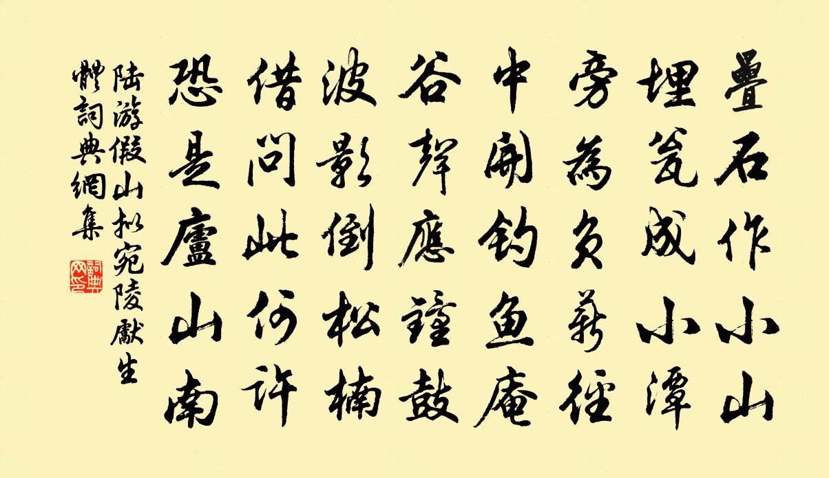 疊石作小山,埋瓮成小潭,旁為負薪徑,中開釣魚庵。谷聲應鐘鼓,波影倒松楠。