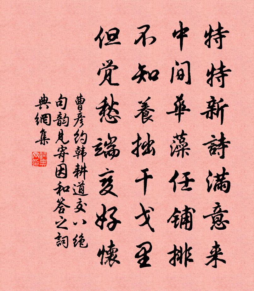 詩詞名句歷史字典書法欣賞書法字典國語詞典說文解字康熙字典古漢語字典標 題 作 者 詩 句 韓耕道交八絕句韻見寄因和答之作者:曹彥約 朝代:宋代原文特特新詩滿意來,中間華藻任鋪排。不知養拙干戈里,但覺愁端變好懷。詩詞問答問:《韓耕道交八絕句韻見寄因和答之》的作者是誰?答:曹彥約問:該詩寫於哪個朝代?答:宋代書法欣賞韓耕道交八絕句韻見寄因和答之書法作品詩詞推薦送孫公素機宜書記赴太原劉龍圖之辟強至〔宋代〕夕樓清嘯卻妖氛,越石并州晉史雲。威望裔孫行破敵,美名才子去從軍。關榆礙馬陰初合,塞草迎人綠自薰。幕下上丹霄 本名上平西 用張子云韻王丹桂〔元代〕得真閒,投真趣,傲萍蓬。任運命、否塞亨通。生涯寂淡,二十年罷倒金鐘。頭頭返照,破昏蒙、靈鑒非銅。或游春寒梅堯臣〔宋代〕春晝自陰陰,雲容薄更深。蝶寒方斂翅,花冷不開心。亞樹青簾動,依山片雨臨。未嘗辜景物,多病不能尋。倒垂柳楊無咎〔宋代〕南州初會遇。記惺惺、說底語。而今精神□,傾下越風措。雍門人獨夜,客舍停杯處。餘香應未泯,憑君重唱金縷百日假滿少傅官停自喜言懷白居易〔唐代〕長告今朝滿十旬,從茲蕭灑便終身。老嫌手重拋牙笏,病喜頭輕換角巾。疏傅不朝懸組綬,尚平無累畢婚姻。人言落花黎廷瑞〔宋代〕紅雪霏霏入燕泥,朝來猶是可憐枝。春風葵麥玄都觀,可是劉郎見事遲。春雪宋祁〔宋代〕銀礫欺春亂眼來,重陰萬里壓平台。光沈後牖將飛瓦,艷補南枝已落梅。池曲平翻冰共泮,山腰未積玉爭頹。長安送馬明府赴江陵錢起〔唐代〕陶令南行心自永,江天極目澄秋景。萬室遙方犬不鳴,雙鳧下處人皆靜。清風高興得湖山,門柳蕭條雙翟閒。黃花和石通判酌白鶴泉張栻〔宋代〕談天終日口瀾翻,來乞清甘醒舌根。滿座松聲聞金石,微瀾鶴影漾瑤琨。淡中知味誰三咽,妙處相期豈一樽。有本樂歲歌趙蕃〔宋代〕早禾登場無餘粒,晚禾結穟俱全實。如聞自入夏秋來,十日一雨晴五日。去年夏旱秋與同,早禾半獲晚禾空。未雲漢銅弩機歌呂祖謙〔宋代〕甘泉宮中烽火催,武庫掣鏁殷春雷。山西都尉部千弩,意氣欲壓天山摧。朔風慘慘隨旗尾,角聲滿天日色死。眼吞除夜書情周弘亮〔唐代〕何處風塵歲,雲陽古驛前。三冬不再稔,曉日又明年。春入江南柳,寒歸塞北天。還傷知候客,花景對韋編。送柳道時余北還(一作送觀察李判官巡郴州)戴叔倫〔唐代〕征役各異路,煙波同旅愁。輕橈上桂水,大艑下揚州。何處成後會,今朝分舊遊。離心比楊柳,蕭颯不勝秋。晴詩(一作塞路初晴)雍陶〔唐代〕晚虹斜日塞天昏,一半山川帶雨痕。新水亂侵青草路,殘煙猶傍綠楊村。胡人羊馬休南牧,漢將旌旗在北門。行子清平樂·春花秋草晏殊〔宋代〕春花秋草,只是催人老。總把千山眉黛掃。未抵別愁多少。勸君綠酒金杯,莫嫌絲管聲催。兔走烏飛不住,人生幾過臨江第八十三文天祥〔宋代〕獨帆如飛鴻,清江轉山急。回首白雲多,山寒夜中泣。橫吹曲辭。出塞竇威〔唐代〕匈奴屢不平,漢將欲縱橫。看雲方結陣,卻月始連營。潛軍渡馬邑,揚旆掩龍城。會勒燕然石,方傳車騎名。重陽日陪元魯山德秀登北城,矚對新霽,因以贈別蕭穎士〔唐代〕山縣繞古堞,悠悠快登望。雨餘秋天高,目盡無隱狀。綿連滍川回,杳渺鴉路深。彭澤興不淺,臨風動歸心。賴茲游郭希呂石洞二十詠小爛柯劉過〔宋代〕遊戲一彈棋,歲月駒隙過。不如兩忘機,石上跏趺坐。貴妃夜遊方岳〔宋代〕鳳鞾又上玉花驄,恩在君王一笑中。三十六宮瑤草碧,不知多少恨春風。名句推薦大漠風塵日色昏,紅旗半卷出轅門。王昌齡《從軍行七首》 春至花如錦,夏近葉成帷。李爽《芳樹》 世事漫隨流水,算來一夢浮生。李煜《烏夜啼·昨夜風兼雨》 物格而後知至,知至而後意誠,意誠而後心正,心正而後身修,身修而後家齊,家齊而後國治,國治而後天下平。曾子《禮記·大學》 今天下之士君子,將猶多皆疑惑厚葬久喪之為中是非利害也。墨子《墨子·22章 節用(下)》 悲吟雨雪動林木,放書輟劍思高堂。李白《留別於十一兄逖裴十三游塞垣》 長風蕭蕭渡水來,歸雁連連映天沒。盧思道《從軍行》 十二樓中盡曉妝,望仙樓上望君王。薛逢《宮詞》 雁柱十三弦,一一春鶯語。歐陽修《生查子·含羞整翠鬟》 湘西一杯酒,渺渺紅葉換。趙蕃《次韻酬吳德夫去秋送行之作》