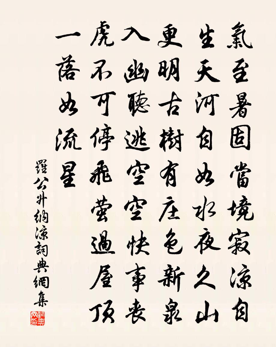 詩詞名句歷史字典書法欣賞書法字典國語詞典說文解字康熙字典古漢語字典標 題 作 者 詩 句 納涼作者:羅公升 朝代:宋代納涼原文氣至暑固當,境寂涼自生。天河自如水,夜久山更明。古樹有莊色,新泉入幽聽。逃空空快事,喪虎不可停。飛螢過屋頂,一落如流星。詩詞問答問:納涼的作者是誰?答:羅公升問:納涼寫於哪個朝代?答:宋代羅公升納涼書法欣賞納涼書法作品詩詞推薦種橘王之道〔宋代〕或言千樹橘,貴可比封君。先生種橘意,此計何足雲。珍絕色香味,解酲有餘勛。今日良宴會佚名〔兩漢〕今日良宴會,歡樂難具陳。彈箏奮逸響,新聲妙入神。令德唱高言,識曲聽其真。齊心同所願,含意俱未申。人生次韻程兄投贈方岳〔宋代〕北里南鄰盡往還,那知有客住雲間。相過肯作鄉人觀,問訊春溪兩岸山。入唐溪嚴維〔唐代〕嘯終萬籟起,吹去當溪雲。環嶼或明昧,遠峰尚氛氳。雨新翠葉發,夜早玄象分。金澗流不盡,入山深更聞。菩薩蠻·為春憔悴留春住納蘭性德〔清代〕為春憔悴留春住,那禁半霎催歸雨。深巷賣櫻桃,雨余紅更嬌。黃昏清淚閣,忍便花飄泊。消得一聲鶯,東風三月素梅 四四王冕〔元代〕雲間古寺陸機宅,草木蕭森鶴不來。惟有溪頭老梅樹,霜花猶是舊時開。端約遺墨梅以詩謝之蔡戡〔宋代〕清香素質惱詩情,更倩揮毫為寫真。共挽東風拼一醉,不須摹仿費精神。春日閒居即事杜荀鶴〔唐代〕未得青雲志,春同秋日情。花開如葉落,鶯語似蟬鳴。道合和貧守,詩堪與命爭。饑寒是吾事,斷定不歸耕。書所見聞示諸友魏了翁〔宋代〕一從輕棄五邊州,所恃藩籬僅武休。又謂武休無足恃,並捐洋漢守金牛。鹿鳴小集奉餞赴省諸公曹彥約〔宋代〕便從場屋了經綸,看取朝家詔選掄。天賦忠良須努力,人生溫飽豈榮身。鼎來時事方憂國,到底儒冠不誤人。青紫初至毗陵簡巽老時有所懷也李處權〔宋代〕從來語默有千鈞,亂後相逢氣益振。好鳥開窗如應客,清風挽竹故留人。更貧豈顧墦間祭,已老猶堪席上珍。說到滿庭芳佚名〔宋代〕獸爐煙斷,殘燭照庭幃。皇太子誕慶宋祁〔宋代〕軒袥深叢佑,文支此挺生。重輪當月滿,一索應乾成。瑞瓞昌綿緒,天弧仗左檠。海雖分幼潤,星已慶前名。緩帶送峽州陳廉秘丞三首司馬光〔宋代〕宜都賢太守,治跡古人齊。虎負眾子去,鳳環群鳥棲。行增潁川秩,別絳武都泥。正恐還朝速,春林未子規。新昌新居書事四十韻因寄元郎中張博士白居易〔唐代〕冒寵已三遷,歸朝始二年。囊中貯余俸,園外買閒田。狐兔同三徑,蒿萊共一壥。新園聊鏟穢,舊屋且扶顛。檐漏喜李侍御拜郎官入省錢起〔唐代〕粉署花驄入,丹霄紫誥垂。直廬驚漏近,賜被覺霜移。漢主前瑤席,穰侯許鳳池。應憐後行雁,空羨上林枝。寧宗朝享三十五首真宗〔宋代〕在宋四世,天子聖神。用賢致治,約已裕民。海內富庶,裔夷肅實。四十二年,堯舜之仁。炬長老請贊釋法薰〔宋代〕刀不自截,水不自洗。我真我贊,成何道理。請之既堅,卻之不已。有一句子,玄沙道底。斛石山曉望寄呂侍御薛濤〔唐代〕曦輪初轉照仙扃,旋擘煙嵐上窅冥。不得玄暉同指點,天涯蒼翠漫青青。北窗梧葉坐間落四五有感陸游〔宋代〕高梧一葉脫,便覺秋不遠。晨起發滿梳,梧衰孰雲晚。古來追電足,歷塊或小踠。金鼓譟陣間,此任豈駑蹇。女子名句推薦零淚向誰道,雞鳴徒嘆息。沈約《夜夜曲》 綠蟻新醅酒,紅泥小火爐。白居易《問劉十九》 何事吟余忽惆悵,村橋原樹似吾鄉。王禹偁《村行·馬穿山徑菊初黃》 自誠明,謂之性;自明誠,謂之教。子思《中庸·第二十一章》 油壁香車不再逢,峽雲無跡任西東。晏殊《無題·油壁香車不再逢》 雖至親亦忍絕,縱為惡亦不讓。來俊臣《羅織經·事上卷第二》 淡淡橫朝煙,脈脈深秋思。劉道著《湘江秋曉》 蜀天常夜雨,江檻已朝晴。杜甫《水檻遣心二首》 燈半昏時,月半明時。徐再思《折桂令·春情》 雪後燕瑤池,人間第一枝。趙令畤《菩薩蠻·春風試手先梅蕊》