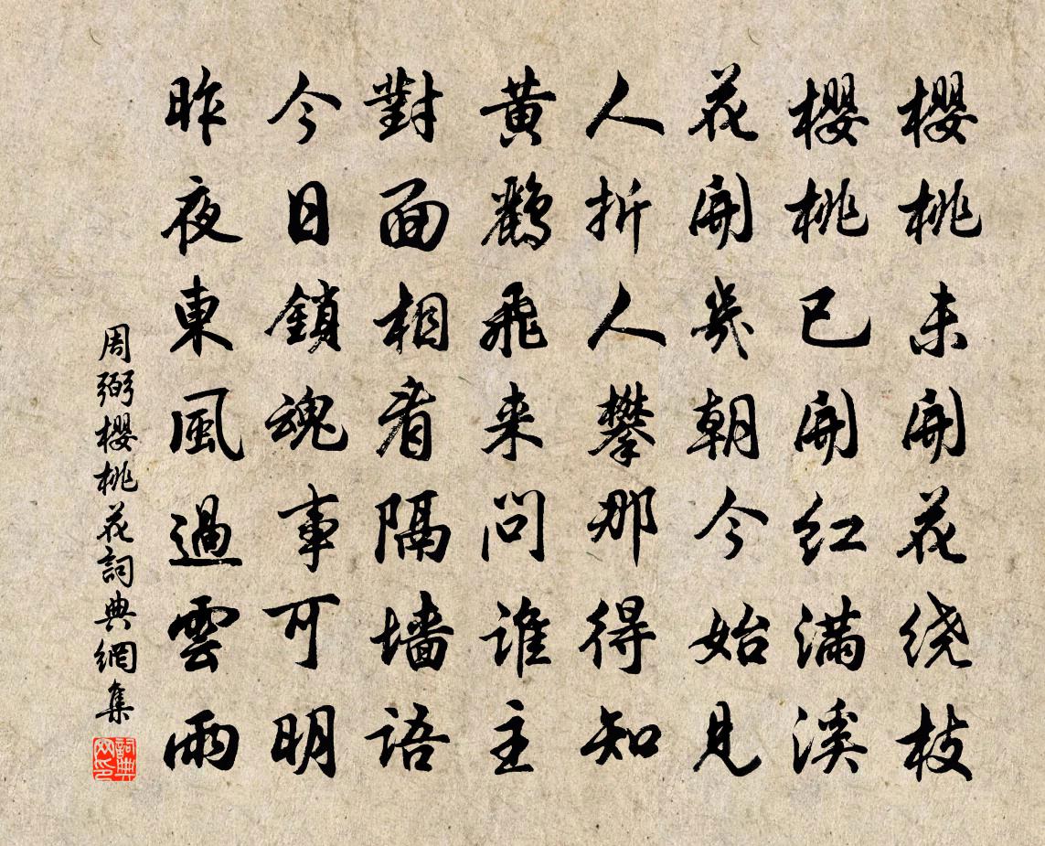 詩詞名句歷史字典書法欣賞書法字典國語詞典說文解字康熙字典古漢語字典標 題 作 者 詩 句 櫻桃花作者:周弼 朝代:宋代櫻桃花原文櫻桃未開花繞枝,櫻桃已開紅滿溪。花開幾朝今始見,人折人攀那得知。黃鸝飛來問誰主,對面相看隔牆語。今日鎖魂事可明,昨夜東風過雲雨。詩詞問答問:櫻桃花的作者是誰?答:周弼問:櫻桃花寫於哪個朝代?答:宋代周弼櫻桃花書法欣賞櫻桃花書法作品詩詞推薦和柴大監留郎中游郁孤及喜雨之什陳元晉〔宋代〕冰壺壺清對玉衡秋,台府同時盡勝流。南國恩波如海闊,西江和氣接天浮。山川真借兩賢重,翰墨仍為八境留。是句張耒〔宋代〕飛蚊繞枕細而輕贈隱僧釋文珦〔宋代〕高僧謝人世,誅茅亂峰曲。三衣不著蠶,一飯長分鹿。露滴秋逕松,煙蒙曉窗竹。真隱澹無營,怡然心自足。湖舡分得行字韻潘璵〔宋代〕三月鶯花爛熳春,尋芳誰不趁清明。要為終日看山計,只買扁舟載酒行。老柳半枯存古意,浮雲多變類人情。何時冬夜獨坐羅公升〔宋代〕庭幽蟄談口,燭盡輟書卷。牆外醉客喧,堪憎更堪羨。訪戴鍊師不值胡仲弓〔宋代〕數間茅屋柳成陰,中有幽人抱一琴。欲訪桃豀無覓處,桃豀更在白雲深。余得英州石山副之五絕句送曾鼎臣曾豐〔宋代〕湖上飛來小祝融,群青在側一居中。何當容眾常相下,不必稱孤觸自雄。錢殿撰輓詞樓鑰〔宋代〕雋譽蜚庠校,孤忠動冕旒。捄荒心欲折,憂國鬢先秋。惠滿長江水,風清八詠樓。禁途交一臂,人物等閒休。同安劉克莊〔宋代〕城不能高甫及肩,臨風搔首一懷賢。當時矮屋今存否,曾著文公住四年。奉和幸禮部尚書竇希玠宅應制(一作陪幸五王宅)劉憲〔唐代〕北斗樞機任,西京肺腑親。疇昔王門下,今茲御幸辰。恩光山水被,聖作管弦新。繞坐熏紅藥,當軒暗綠筠。摘荷瀑布泉冷朝陽〔唐代〕潺湲半空里,霖落石房邊。風激珠光碎,山欹練影偏。急流難起浪,迸沫只如煙。自古惟今日,淒涼一片泉。浣溪紗辛棄疾〔宋代〕父老爭言雨水勻,眉頭不似去年顰。殷勤謝卻甑中塵。啼鳥有時能勸客,小桃無賴已撩人。梨花也作白頭新。偈頌一百五十首釋心月〔宋代〕簇簇上來,卻之不回。簇簇下去,留之不住。於斯立片時,瞬目不揚眉。花下舒岳祥〔宋代〕掃石坐花陰,花陰復滿襟。此時真晝錦,富貴亦何心。昭潭十愛梅摯〔宋代〕我愛昭州路,優遊不險崎。九疑通舜野,八桂繞秦祠。亭堠相望處,漁樵有讓時。政無牙虎鬥,莫信義山詩。送李漕用之二首劉克莊〔宋代〕漢廷鹽鐵議交攻,有詔姑惟舊法從。聞道嶺南歌聖主,一如河北感仁宗。向舒自是堪王佐,桑孔安知富大農。它日玉樓春秦觀〔宋代〕參差簾影晨光動。露桃雨柳矜新寵。閒愁多仗酒驅除,春思不禁花從臾。倚樓聽徹單于弄。卻憶舊歡空有夢。當時蕭宅二三子贈答詩二十首蛺蝶請客盧仝〔唐代〕粉末為四體,春風為生涯。願得紛飛去,與君為眼花。和富公權宗丞十站王之道〔宋代〕惡客未嘗知酒聖,高人何止擅文豪。三司自揣非吾事,敢覬徐州解佩刀。宿簡寂觀白居易〔唐代〕岩白雲尚屯,林紅葉初隕。秋光引閒步,不知身遠近。夕投靈洞宿,臥覺塵機泯。名利心既忘,市朝夢亦盡。暫來名句推薦君者,舟也;庶人者,水也。水則載舟,水則覆舟。荀子《荀子·哀公》 城裡夕陽城外雪,相將十里異陰晴。王守仁《次韻陸僉憲元日春晴》 半盞屠蘇猶未舉,燈前小草寫桃符。陸游《除夜雪》 野竹分青靄,飛泉掛碧峰。李白《訪戴天山道士不遇》 長安陌上無窮樹,唯有垂楊綰別離。劉禹錫《楊柳枝詞九首》 吳台直下,緗梅無限,未放野橋香度。吳文英《永遇樂·探梅次時齋韻》 淒涼寶劍篇,羈泊欲窮年。李商隱《風雨》 天明登前途,獨與老翁別。杜甫《石壕吏》 金剛則折,革剛則裂。劉向《說苑·敬慎》 悵望千秋一灑淚,蕭條異代不同時。杜甫《詠懷古蹟五首·其二》