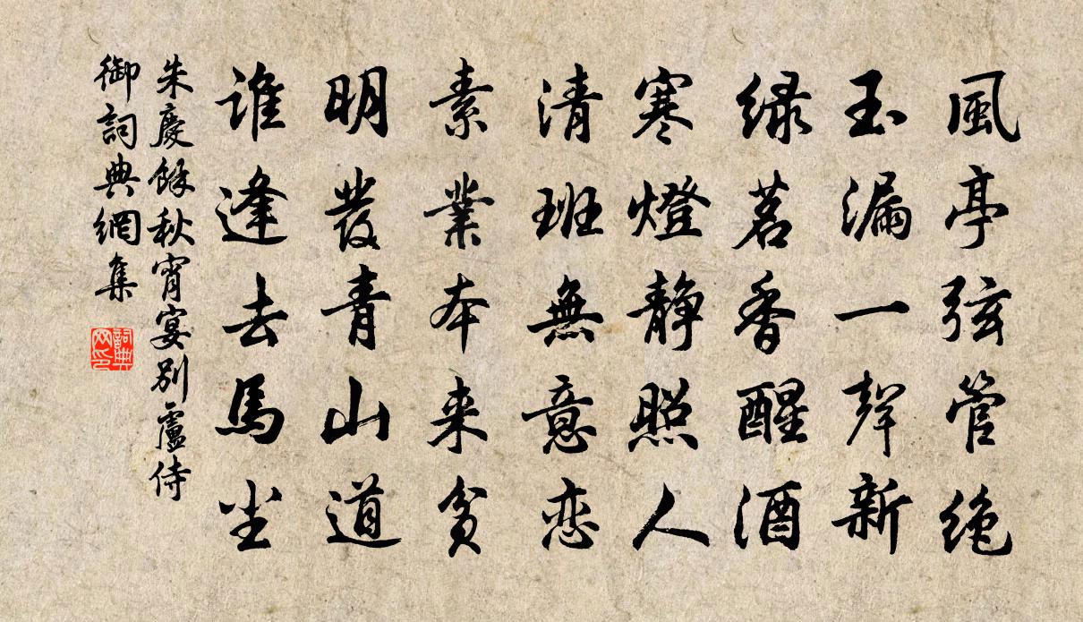 詩詞名句歷史字典書法欣賞書法字典國語詞典說文解字康熙字典古漢語字典標 題 作 者 詩 句 秋宵宴別盧侍御作者:朱慶餘 朝代:唐代秋宵宴別盧侍御原文風亭弦管絕,玉漏一聲新。綠茗香醒酒,寒燈靜照人。清班無意戀,素業本來貧。明發青山道,誰逢去馬塵。詩詞問答問:秋宵宴別盧侍御的作者是誰?答:朱慶餘問:秋宵宴別盧侍御寫於哪個朝代?答:唐代朱慶餘秋宵宴別盧侍御書法欣賞秋宵宴別盧侍御書法作品注釋全唐詩:卷515-9詩詞推薦贊佛眼和尚釋道行〔宋代〕因我得禮你,玄沙出窠臼,龍門與薦燈後。咄!人日出遊湖上十首楊萬里〔宋代〕上竺雪來時,四山都作凍。團團玉屏風,圍繞渾無縫。靈山聽猿齋祖首座號無傳釋智愚〔宋代〕龍猛因緣會北齋,轟轟南嶽到荊溪。宏綱若謂無人舉,誰聽孤猿月下啼。詠史詩故宜城胡曾〔唐代〕武安南伐勒秦兵,疏鑿功將夏禹並。誰謂長渠千載後,水流猶入故宜城。綠淨亭晚興陸游〔宋代〕綠淨亭邊物色奇,放翁睡起曳筇枝。新涼已似雁來後,微風卻如梅熟時。綠竹成陰藏細棧,朱闌倒影入清池。登臨月夜納涼於石〔宋代〕天地空無半點塵,翛然池館浸虛明。幾更今古月常在,一片襟懷水共清。風定波搖晴樹影,魚翻露瀉翠荷聲。炎涼寄友陳深〔宋代〕海內皆兄弟,情深莫若君。那知經亂後,翻作久離群。皎皎雲中月,悠悠岩上雲。相思不可見,清夢繞江濆。燕居十六首彭龜年〔宋代〕我身何自有,毫髮自親來。身且非吾物,何論身外財。愁晁說之〔宋代〕雲暗花寒春在否,煙波漠漠不禁愁。此愁肯逐楊花散,常與幽人種白頭。送項倅周南〔宋代〕昨者搜賢詔下來,旌蒲紛遝起蒿萊。誰人肯厭承明直,我輩休汙世俗埃。天近須回宣室召,時難倍愴渭城杯。殷勤臨川王服竟還田裡詩鮑照〔南北朝〕送舊禮有終。事君慚懦薄。稅駕罷朝衣。歸志願巢壑。尋思邈無報。退命愧天爵。舍耨將十齡。還得守場藿。道經次申屠子迪韻 其四王冕〔元代〕白髮干戈際,青山黯靄中。沙蟲聯五馬,跖卯襲三公。東海波濤黑,中原草樹紅。蕭條岩谷底,誰信有春風?公宴詩阮瑀〔魏晉〕陽春和氣動。賢主以崇仁。布惠綏人物。降愛常所親。上堂相娛樂。中外奉時珍。五味風雨集。杯酌若浮雲。 書興四首汪炎昶〔宋代〕山如斲新稜,泉如注新碧。醉臥便妥帖,似換松根石。混俗悼昔遺,嗜靜竦今護。吸鯨條煩想,飫奇甦舊力。追往湖山小隱林逋〔宋代〕園井夾蕭森,紅芳墮翠陰。晝岩松鼠靜,春塹竹雞深。歲課非無秫,家 * 有琴。顏原遺事在,千古壯閒心。偈頌一百二十三首釋祖欽〔宋代〕澄潭月影,靜夜鐘聲。不留而照,不待而鳴。而亦離聞絕見,非色非聲。不寐四首楊萬里〔宋代〕非關枕上愛喔詩,聊復銷愁片子時。老眼強眠終不夢,空腸暗響訴長肌。翻來覆去體都痛,乍暗忽明燈為誰。只道西湖別舍弟潤之劉過〔宋代〕幾度歸程入夢間,秋鴻社燕兩為難。西湖半夜風雨急,交泗一床心膽寒。落第我為中酒味,圜橋子亟洗儒酸。臂弓次劉學錄梅韻陳宓〔宋代〕春風來信已分明,不待騷人玉笛橫。莫道未開難等候,開時卻恐轉關情。盛山十二詩竹岩韋處厚〔唐代〕不資冬日秀,為作暑天寒。先植誠非鳳,來翔定是鸞。名句推薦縱明月相思千里隔。夢咫尺。勤書尺。賀鑄《琴調相思引·送范殿監赴黃崗》 寧可濕衣,不可亂步李汝珍《鏡花緣·第二十回》 柳下桃蹊,亂分春色到人家。秦觀《望海潮·洛陽懷古》 林深藏卻雲門寺,回首若耶溪。張可久《人月圓·會稽懷古》 繁華事散逐香塵,流水無情草自春。杜牧《金谷園》 青青子衿,悠悠我心。佚名《子衿》 克城以武,戡亂以仁。張廷玉《明史·本紀·卷一》 戀樹濕花飛不起,愁無比,和春付與東流水。朱服《漁家傲·小雨纖纖風細細》 江上雪,獨立釣漁翁。李綱《望江南·江上雪》 萬里辭家事鼓鼙,金陵驛路楚雲西。劉長卿《送李判官之潤州行營》