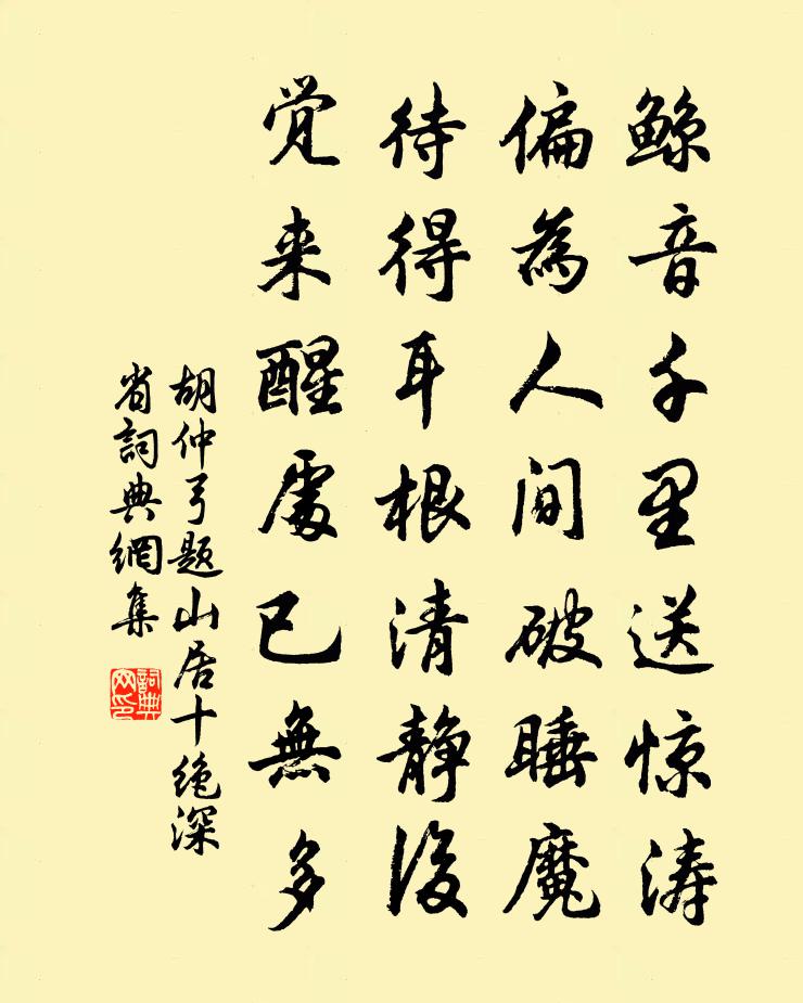 詩詞名句歷史字典書法欣賞書法字典國語詞典說文解字康熙字典古漢語字典標 題 作 者 詩 句 題山居十絕深省作者:胡仲弓 朝代:宋代題山居十絕深省原文鯨音千里送驚濤,偏為人間破睡魔。待得耳根清靜後,覺來醒處已無多。詩詞問答問:題山居十絕深省的作者是誰?答:胡仲弓問:題山居十絕深省寫於哪個朝代?答:宋代胡仲弓題山居十絕深省書法欣賞題山居十絕深省書法作品詩詞推薦江夏八詠之二右靈竹寺賀鑄〔宋代〕高岸已為谷,斯人如蛻蟬。固應留寶刻,信示當家仙。留贈上官常用孔武仲〔宋代〕河梁欲上手重攜,冷語南湖百尺堤。看發了青雲開羽翼,莫羞黃綬走塵泥。文章炳蔚元摛鳳,鋩刃縱橫暫割雞毛。和主司王起(一作和主司酬周侍郎)李潛〔唐代〕文學宗師心秤平,無私三用佐貞明。恩波舊是仙舟客,德宇新添月桂名。蘭署崇資金色重,蓮峰高唱玉音清。羽毛洞仙歌佚名〔宋代〕窗外蛩吟雨聲細。陪王漕右司游東園章甫〔宋代〕籍甚皇華使,詩清思不群。建台多暇日,領客總能文。花好杯重勸,茶香手自分。禮寬情爛熳,小雨夜深聞。答卜元嗣詩蔡邕〔兩漢〕斌斌碩人。貽我以文。辱此休辭。非余所希。敢不酬答。賦誦以歸。宿石聞牧馬者歌司馬光〔宋代〕大河之曲多寬間,牧田枕倚長隄灣。烏棲鵲散隄樹寂,柝木聲稀宵欲闌。牧兒跨馬乘涼月,歷歷繞群高唱發。幽情長相思(五之三)陸游〔宋代〕面蒼然。鬢皤然。滿腹詩書不直錢。官閒常晝眠。畫凌煙。上甘泉。自古功名屬少年。知心惟杜鵑。宋中道都官輓辭二首蘇頌〔宋代〕文章微婉氣清遒,議論精通學贍優。方見璠璵為國器,忽經蘭菊隕霜秋。夢中應講陰堂奧,天上須刊白玉樓。聞道臨江仙·倦客如今老矣史達祖〔宋代〕倦客如今老矣,舊時不奈春何。幾曾湖上不經過。看花南陌醉,駐馬翠樓歌。遠眼愁隨芳草,湘裙憶著春羅。枉教安樂窩前蒲柳吟邵雍〔宋代〕安樂窩前小曲江,新蒲細柳年年綠。眼前隨分好光陰,誰道人生多不足。子貢王安石〔宋代〕一來齊境助奸臣,去誤驕王亦苦辛。魯國存亡宜有命,區區翻覆亦何人。題霍山岩藍喬〔宋代〕人間富貴塵如海,虛度春三二月花。八表煙霞總一家,藍喬到此作生涯。庚辰四十五歲文天祥〔宋代〕東風昨夜忽相過,天地無情柰老何。千載方來那有盡,百年未半已為多。君傳南海長生藥,我愛西山餓死歌。泡影南鄉子歐陽炯〔唐代〕嫩草如煙,石榴花發海南天。日暮江亭春影淥,鴛鴦浴,水遠山長看不足。畫舸停橈,槿花籬外竹橫橋。水上游上雜劇·玉簫女兩世姻緣喬吉〔元代〕第一折(老旦扮卜兒上,詩云)少年歌舞老年身,喜笑常生滿面春。胭粉豈為無價寶,郎君自是有情人。老身許氏梅花引王哲〔元代〕少無福。早孤獨。憔翟一身無告囑。日常思。日常思。此事分明,皇天便得知。見遠促。見遠促。侍來偏親增汝祿春遊曲劉復〔唐代〕春風戲狹斜,相見莫愁家。細酌蒲桃酒,嬌歌玉樹花。裁衫催白紵,迎客走朱車。不覺重城暮,爭棲柳上鴉。臘茶並三詩送李元誠陳造〔宋代〕北風吹霜戰林樾,菊花雕零梅未發。留君無物供吟筆,一炷沉煙伴清絕。騷人悲悽為搖落,舟挽不回仍此別。還家東亭茶宴鮑君徽〔唐代〕閒朝向曉出簾櫳,茗宴東亭四望通。遠眺城池山色里,俯聆弦管水聲中。幽篁引沼新抽翠,芳槿低檐欲吐紅。坐久名句推薦天地不仁,以萬物為芻狗;聖人不仁,以百姓為芻狗。老子《老子·道經·第五章》 正是浴蘭時節動。菖蒲酒美清尊共。歐陽修《漁家傲·五月榴花妖艷烘》 可憐閨里月,長在漢家營。沈佺期《雜詩三首·其三》 佳節久從愁里過,壯心偶傍醉中來。蘇洵《九日和韓魏公》 言不中法者,不聽也;行不中法者,不高也;事不中法者,不為也。商鞅《商君書·君臣》 政之所興,在順民心。管仲《管子·牧民》 令公桃李滿天下,何用堂前更種花。白居易《奉和令公綠野堂種花》 雁過也,正傷心,卻是舊時相識。李清照《聲聲慢·尋尋覓覓》 二十四橋仍在,波心蕩、冷月無聲。姜夔《揚州慢·淮左名都》 蘭陵美酒鬱金香,玉碗盛來琥珀光。李白《客中行 / 客中作》
