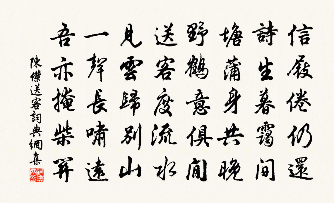 詩詞名句歷史字典書法欣賞書法字典國語詞典說文解字康熙字典古漢語字典標 題 作 者 詩 句 送客作者:陳杰 朝代:宋代送客原文信屐倦仍還,詩生暮靄間。塘蒲身共晚,野鶴意俱閒。送客度流水,見雲歸別山。一聲長嘯遠,吾亦掩柴關。詩詞問答問:送客的作者是誰?答:陳杰問:送客寫於哪個朝代?答:宋代陳杰送客書法欣賞送客書法作品詩詞推薦題夾漈草堂鄭樵〔宋代〕堂後青松百尺長,堂前流水日湯湯。西窗儘是農桑域,北牖無非花葛鄉。罷去精神渾冉冉,看來几案尚穰穰。不知贈空禪師喻鳧〔唐代〕虎見修行久,松知夏臘高。寒堂坐風雨,瞑目尚波濤。春詠葉茵〔宋代〕舍瑟聲不傳,詠歸聲在道。風乎野水濱,夕陽轉芳草。諸人頗有和余百梅詩者各賦一首劉克莊〔宋代〕百首初成六十餘,朝塗暮改費居諸。誰將彩筆傳於子,人怪青春小似余。一笑拈花差易耳,三年刻楮欲何如。梅兄普熏院李淛〔宋代〕征鞍曉踏山頭月,客袂晝披松下風。況有禪堂供偃息,陶然一枕夢槐宮。浯溪莊崇節〔宋代〕元翁作頌魯公書,峭壁雲煙萬古垂。三絕堂前月浸碧,兩峰亭下草生悲。英風義概有存者,流水高山誰會之。便使祝英台近吳潛〔宋代〕旋安排,新捻合,鶯谷共煙浦。好處偏慳,一向風和雨。今朝捱得晴明,拖條藜杖,一齊把、春光黏住。且閒覷。歌元豐五首王安石〔宋代〕豚柵雞塒晻靄間,暮林搖落獻南山。豐年處處人家好,隨意飄然得往還。臘雪五首蘇轍〔宋代〕憂愁不可緩,風雪故相撩。試問五斗米,能勝一束樵。耕耘終亦飽,哺啜定誰邀。寒暑不須避,傾危且自遙。麗水甄殿丞移疾請告楊億〔宋代〕數日不逢黃叔度,胸中鄙吝一時生。如何民瘼偏能療,卻是詩魔未得平。夏景清和妨命駕,玄臺寂寞阻飛觥。欲親泛太湖書事寄微之白居易〔唐代〕煙渚雲帆處處通,飄然舟似入虛空。玉杯淺酌巡初匝,金管徐吹曲未終。黃夾纈林寒有葉,碧琉璃水淨無風。避旗宴春台(初夏宴芙蓉堂)黃裳〔宋代〕夏景舒長,麥天清潤,高低萬木成陰。曉意寒輕,一聲未放蟬吟。但聞鶯友同音。宴華堂、綠水中心。芙蓉都沒,竹所睡起偶成書呈謝守之錢時〔宋代〕萬竹中通兩牖虛,紅塵炎暑不關渠。幽人日用底難辦,一榻午風清有餘。予前後守、倅餘杭,凡五年。夏秋之間,蒸熱蘇軾〔宋代〕忠孝王家千柱宮,東坡作吏五年中。中和堂上東南頰,獨有人間萬里風。【雙調】新水令_攪閒風吹散關漢卿〔元代〕攪閒風吹散楚台天,天對付滿懷愁悶。您那裡歡娛嫌夜短,俺寂寞恨長更。恰似線斷風箏,絕魚雁杳音信。【駐馬門下大資顏公輓詩三首李彌遜〔宋代〕洙泗流風遠,儀形世有人。人經窺聖域,三返得賢臣。勳業艱難際,聲名寂寞濱。赤松歸有伴,此道獨知津。次韻張子開喜雨陳著〔宋代〕甘澤連朝拍稻疇,老天著意做今秋。軟炊已報生塵甑,艱食俄忘淅米矛。甽口漲新浮白膩,禾頭濯秀濕青油。疲農明發新淦晴快風順約泊樟鎮楊萬里〔宋代〕雨到中宵歇,心知逗曉晴。排雲數峰出,漏日半江明。風借輕帆便,天催嬾客行。不應樟鎮酒,無意待人傾。失調名佚名〔宋代〕無情卻被多情惱。壽安西渡奉別鄭相公孟郊〔唐代〕洛河向西道,石波橫磷磷。清風送君子,車遠無還塵。春別亦蕭索,況茲冰霜晨。零落景易入,鬱抑抱難申。百宵名句推薦嗚呼! 何時眼前突兀見此屋杜甫《茅屋為秋風所破歌》 榮所眾羨,亦引眾怨。來俊臣《羅織經·固榮卷第六》 漠漠秋雲起,稍稍夜寒生。白居易《微雨夜行》 奸眾而忠寡,世之實也;言忠而惡奸,世之表也。來俊臣《羅織經·察奸卷第八》 差之毫厘,失之千里。佚名《增廣賢文·上集》 望闕雲遮眼,思鄉雨滴心。白居易《陰雨》 君子之交淡若水,小人之交甘若醴。莊子《莊子·外篇·山木》 夸而有節,飾而不誣劉勰《文心雕龍·誇飾》 疏條交映,有時見日。吳均《與朱元思書》 圖未就之功,不如保已成之業洪應明《菜根譚·概論》