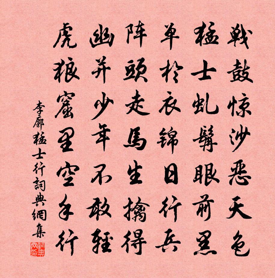 詩詞名句歷史字典書法欣賞書法字典國語詞典說文解字康熙字典古漢語字典標 題 作 者 詩 句 猛士行作者:李廓 朝代:唐代猛士行原文戰鼓驚沙惡天色,猛士虬髯眼前黑。單于衣錦日行兵,陣頭走馬生擒得。幽并少年不敢輕,虎狼窟里空手行。詩詞問答問:猛士行的作者是誰?答:李廓問:猛士行寫於哪個朝代?答:唐代問:猛士行是什麼體裁?答:樂府李廓猛士行書法欣賞猛士行書法作品注釋全唐詩:卷479-47詩詞推薦建炎丁未自中夏徂秋不雨七夕日戲成一詩簡牛鄭剛中〔宋代〕今夕知何夕,織女逢牽牛。雲軿擁高漢,仙事傳風流。人間適焦窘,龜兆生田疇。當時大軍後,皆抱糠籺憂。我勸詠史下曹操七首陳普〔宋代〕英姿蕭颯發硎刀,除卻無君事事高。孟德文王能幾許,只爭謙退與矜豪。清晨坐堂上晁公溯〔宋代〕清晨坐堂上,文書常滿前。皆自公府來,徵發何紛然。不聞問養民,但聞橫索錢。按籍為之課,獨求最多年。孰知吏隱宜春郡詩十首祖無擇〔宋代〕吏隱宜春郡,素飱誠有餘。政聲慙遂霸,文藻謝嚴徐。使節分銅虎,仙廬秘石渠。君恩殊未報,不敢賦歸歟。送雨浙轉連道卿學士二首宋庠〔宋代〕新歲郵中問,殘冬湖外書。歡同烹鯉日,情是斷金餘。澤節行台峻,天垣右席虛。不應周吏課,朝紱企歸歟。送古之奇赴安西幕李端〔唐代〕疇昔十年兄,相逢五校營。今宵舉杯酒,隴月見軍城。堠火經陰絕,邊人接曉行。殷勤送書記,強虜幾時平。句晏殊〔宋代〕潤毫均厚薄。竹溪直院盛稱起予草堂詩之善暇日覽之多有可劉克莊〔宋代〕種蠡功名士,吾評蠡最優。五湖足春水,一葉寄扁舟。變姓乘單舸,翻身退急流。千金徒鑄象,萬里孰馴鷗。震澤順宗至德大聖大安孝皇帝輓歌詞三首呂溫〔唐代〕遐視輕神寶,傳歸屬聖猷。堯功終有待,文德本無憂。坐受朝汾水,行看告岱丘。那知鼎成後,龍馭弗淹留。監撫西齋不寐三首方回〔宋代〕午醉稍就寢,甜夢何翩翩。晚醒漱茗飲,終夕斯無眠。初數一二鼓,乃至三四遷。草根沸蟋蟀,鴟鴞號樹顛。眾靜和李民載梅花二首吳芾〔宋代〕褐衣懷玉未全貧,況有梅花作好春。麗句與花相映發,總輸天上謫仙人。再用韻和陳伯比二首一晁補之〔宋代〕田裡馮生寧屑去,湖海陳卿時肯來。詩書好在家四壁,蒲柳蓊然城一隈。騎上下山益疏矣,鯈從容出何樂哉。市橋南歌子(是日微雨,過午而霽,晚遂月出,次劉無言韻)葉夢得〔宋代〕雨惜山容斂,雲矜棹影開。忽看霽色射林隈。為問湖亭清影、為誰來。盡洗歸時路,重傾醉後杯。未應霜雪遽相催思邊(一作春怨)李白〔唐代〕去年何時君別妾,南園綠草飛蝴蝶。今歲何時妾憶君,西山白雪暗晴雲。玉關去此三千里,欲寄音書那可聞。謝劉致中瓜二首劉子翬〔宋代〕病翁痴絕端可笑,文墨骫骳誰得稱。故人分甘聊爾耳,更向詩流說我能。八年正月天慶節上清宮行香錫慶院御筵日揚輝夏竦〔宋代〕實籙標嘉節,需雲錫惠筵。烈暉騰愛景,瑞彩擬非煙。焜燿璇霄外,輪囷絳闕前。居歆方屢告,偉兆溢祥編。論油丹色賈似道〔宋代〕黑頭青項翅油丹,腿腳牙長似雪霜。相貌這般無覓處,鬭時絕勝豈尋常。向伯忝旁午帖贊岳珂〔宋代〕塗水漣漪未改,薌林風月如新。一紙重觀遺蹟,百年無復斯人。滕王閣三首吳芾〔宋代〕昔日驕王鎮此州,特營高閣瞰清流。一時傑出稱雄觀,千古爭傳作勝游。遍覽遺蹤容可想,回思往事卻堪羞。時人題酒家韋莊〔唐代〕酒綠花紅客愛詩,落花春岸酒家旗。尋思避世為逋客,不醉長醒也是痴。名句推薦愁看飛雪聞雞唱,獨向長空背雁行。羅鄴《早發》 主道明則下安,主道幽則下危。故下安則貴上,下危則賤上。荀子《荀子·正論》 春風只在園西畔。薺菜花繁胡蝶亂。嚴仁《玉樓春·春思》 木落雁南度,北風江上寒。孟浩然《早寒江上有懷 / 早寒有懷 / 江上思歸》 枉直隨形而不在影,屈申任物而不在我列子及其弟子《列子·說符》 飛蓬各自遠,且盡手中杯。李白《魯郡東石門送杜二甫》 惟賢惟德,可以服人。司馬光《資治通鑑·魏紀·魏紀二》 坐到三更盡,歸仍萬里賒。戎昱《桂州臘夜》 明年豈無年,心事恐蹉跎。蘇軾《守歲》 自笑堂堂漢使,得似洋洋河水,依舊只流東陳亮《水調歌頭·送章德茂大卿使虜》