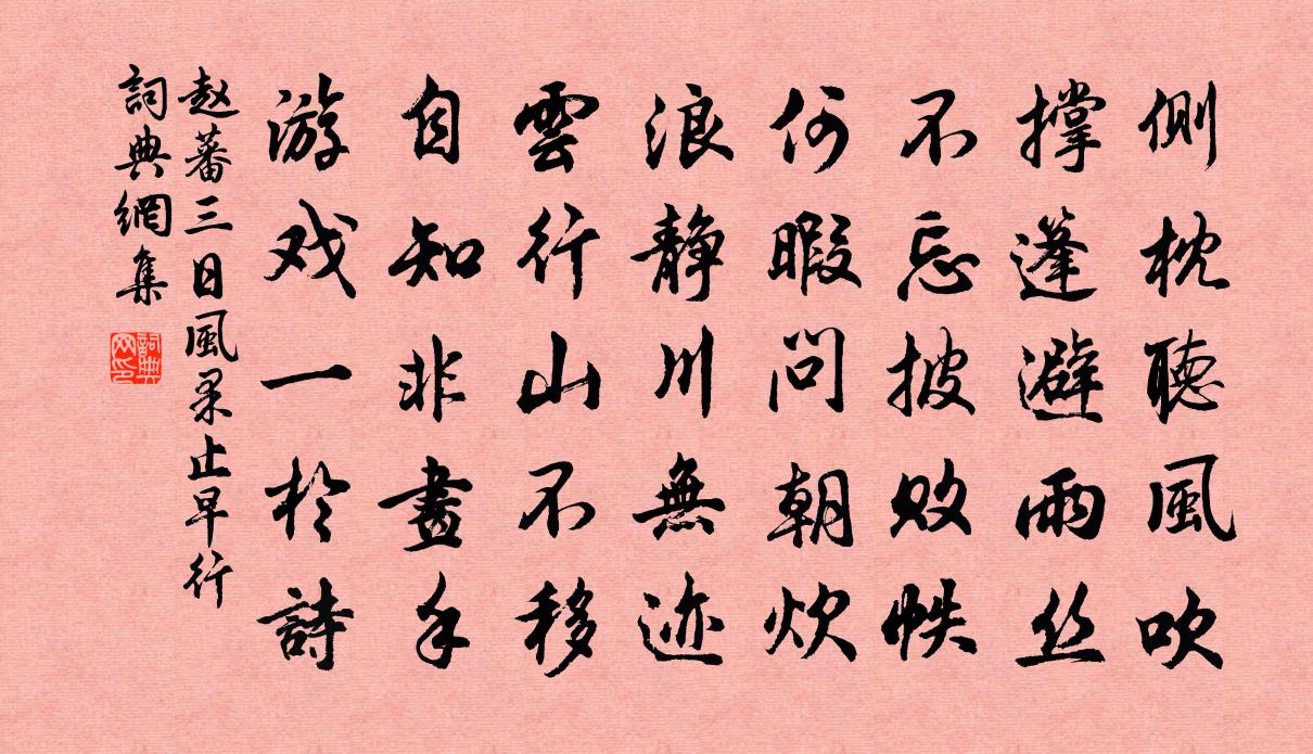 詩詞名句歷史字典書法欣賞書法字典國語詞典說文解字康熙字典古漢語字典標 題 作 者 詩 句 三日風果止早行作者:趙蕃 朝代:宋代三日風果止早行原文側枕聽風吹,撐篷避雨絲。不忘披敗帙,何暇問朝炊。浪靜川無跡,雲行山不移。自知非畫手,遊戲一於詩。詩詞問答問:三日風果止早行的作者是誰?答:趙蕃問:三日風果止早行寫於哪個朝代?答:宋代趙蕃三日風果止早行書法欣賞三日風果止早行書法作品詩詞推薦春日過西湖胡仲弓〔宋代〕百花如錦柳如煙,妝點西湖二月天。便道過從來四聖,扁舟旖旎訪三賢。錢塘門外蘇堤上,豐樂樓前芝寺邊。個裡效杜甫七歌在長洲縣作余懷〔清代〕有客有客字船子,平生赤腳踏海水。身經戰鬥少睡眠,功名富貴徒為爾。自比稷契何其愚,非薄湯武良有以。嗚呼水調歌頭趙善括〔宋代〕雨霽彩虹臥,半夜水明樓。太湖極目,四面水儘是天流。幾點鱸鄉荻浦,萬里鯨波雪浪,掀舞小漁舟。金餅掛蟾魄照上人山房庭樹趙湘〔唐代〕惹雲非手植,自與薜蘿交。雨過苔侵影,秋來月照巢。錫寒枝上掛,偈好葉中抄。誰見僧行繞,煙涼夜磬敲。宿潭石步楊萬里〔宋代〕三更床無月天正床黑,電光床一掣隨霹靂。雨穿天心落蓬脊,急風橫吹斜更直。疏篷穿漏濕床蓆,波聲打床一紙隔讀李敬業傅詹初〔宋代〕閒笑唐明主,深憐李勣忠。如何一諂獻,便使百年恫。武后興唐亂,英公奮義戎。那知成禍者,禍慘亦歸躬。滿庭芳 二舅魏知房戍沂州,見示此詞,因次劉敏中〔元代〕鞍馬雄豪,紳馳驟,幾年都付尋常。邊城歲晚,蓮幕錦生光。得意尊前一笑,遐沖具威凜秋霜。人誰似,胸懷豁落即事王洋〔宋代〕官閒久愧叨祠廩,身幸真堪學種瓜。月給郡倉三斛米,日尋山路一川花。盤空婢去催嬈筍,爐暖妻來趁焙茶。閱盡次韻石秀叔慈雲逃席自解陳著〔宋代〕山林幸自絕塵氛,舊事誰嗟散幅裙。方外老交心似水,坐中高論氣騰雲。杯盤引興真相率,鐘鼓催晨醉不聞。但願晚坐和韻仲並〔宋代〕城東韓李城南趙,欲往從之道阻長。與我詩盟煩借問,角弓永好願無忘。探幽釋文珦〔宋代〕秋色令人愛,青藜助遠探。柿楓丹互映,天水碧相涵。絕景沙鷗占,幽程野老諳。謂予雲外去,更有古龍潭。朝雲詩(並引)蘇軾〔宋代〕世謂樂天有粥駱馬放楊柳枝詞,嘉其主老病不忍去也。然夢得有詩云:春盡絮飛留不得,隨風好去落誰家。樂天亦滿江紅 贈一庵李道純〔元代〕三五真機,套用處、頭頭總是。況日用平常,密巍巍地。向有無中忘二見,便於罔象通三昧。卻如何、成少不成多偈頌六十五首釋普濟〔宋代〕一新一舊,嘉熙淳佑。皇天大曆,歲在辛丑。投宿湘東趙蕃〔宋代〕霧雨雜炊煙,山巔復樹巔。初疑但紛若,有聽勿騷然。立馬看題壁,沖鷗喚渡船。莫嗟飢雁外,且及暮鴉前。八月七日與吳沈二道人同過書塢時山堂初成周南〔宋代〕暋陽收晶熒,清舫度林彙。坡陀認槿籬,屋角初塗墍。入門露蔭竹,走鞭土為沸。橘欒尚涉澀,菊柄已幽毅。少紓又答斌老病癒遣悶二首黃庭堅〔宋代〕百痾從中來,悟罷本誰病。西風將小雨,涼入居士徑。苦竹遶蓮塘,自悅魚鳥性。紅荷倚翠蓋,不點禪心靜。歸至武陽渡作劉克莊〔宋代〕夾岸盲風掃楝花,高城已近被雲遮。遮時留取城西塔,篷底歸人要認家。二月二十一日枕上聞鶯時霖雨之後鄭剛中〔宋代〕山前急雨促春耕,廢我徜徉小圃行。今日定知晴有意,咤然林際一聲鶯。頌古四十八首釋慧開〔宋代〕路逢達道人,不將語默對。攔腮劈面拳,直下會便會。名句推薦一年之計在於春,一日之計在於寅。佚名《增廣賢文·上集》 三軍可奪帥也,匹夫不可奪志也。佚名《論語十二章》 取次花叢懶回顧,半緣修道半緣君。元稹《離思五首·其四》 瘦雪一痕牆角,青子已妝殘萼。王庭筠《謁金門·雙喜鵲》 始知鎖向金籠聽,不及林間自在啼。歐陽修《畫眉鳥》 千門開鎖萬燈明,正月中旬動帝京。張祜《正月十五夜燈》 福善之門莫美於和睦,患咎之首莫大於內離。班固《漢書·傳·宣元六王傳》 颯颯西風滿院栽,蕊寒香冷蝶難來。黃巢《題菊花》 長恨去年今夜雨,灑離亭。晏幾道《愁倚闌令·花陰月》 聲樂之入人也深,其化人也速。荀子《荀子·樂論》