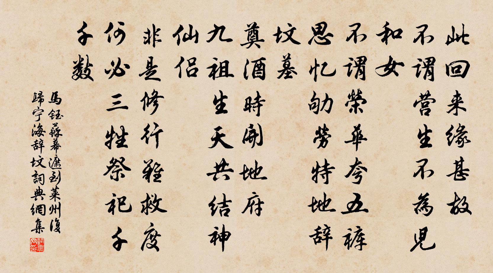 詩詞名句歷史字典書法欣賞書法字典國語詞典說文解字康熙字典古漢語字典標 題 作 者 詩 句 蘇幕遮 到萊州,復歸寧海辭墳作者:馬鈺 朝代:元代原文此回來,緣甚故。不謂營生,不為兒和女。不謂榮華夸五褲。思憶劬勞,特地辭墳墓。奠酒時,開地府。九祖生天,共結神仙侶。非是修行難救度。何必三牲,祭祀千千數。詩詞問答問:《蘇幕遮 到萊州,復歸寧海辭墳》的作者是誰?答:馬鈺問:該詩寫於哪個朝代?答:元代問:該詩是什麼體裁?答:詞書法欣賞蘇幕遮 到萊州,復歸寧海辭墳書法作品詩詞推薦李公擇尚書見示出郊奉雩祀馬上口占七言四韻蘇頌〔宋代〕雩郊幾夕見龍星,盛樂初諧六變聲。薦幣禮同匏爵重,潔牲人比玉壺清。幕中閎辨通宵接,馬上新詩頃刻成。精意挽吳大社王珪〔唐代〕文獻家聲遠,簪纓世德昌。幾篇青玉案,三佩白銀章。北苑新阡好,平原舊業荒。百年喬木在,留得耐風霜。芙蓉五絕呈景仁韓維〔宋代〕堂前堂後盡芙蓉,晴日烘開萬朵紅。不把一樽酬勝賞,忍看憔悴落霜風。苑中詩何遜〔南北朝〕苑門辟千扇。苑戶開萬扉。樓殿聞珠履。竹樹隔羅衣。石帆山下陸游〔宋代〕久矣移家住鹿門,偶然信腳到桃源。尚嫌名掛東林社,那問塵生北海樽。才盡極知詩草草,睡多常覺氣昏昏。舊聞桐花鳥可朋〔唐代〕五色毛衣比鳳雛,深花叢里只如無。美人買得偏憐惜,移向金釵重幾銖。次韻程兄投贈方岳〔宋代〕知無燕頷可封侯,索米長安亦強留。輸與鱸肥菰葉滑,吳中風味老孤舟。除夜自石湖歸苕溪 其五姜夔〔宋代〕三生定自陸天隨,又向順松作客歸。已拚新年舟上過,倩人和雪洗片衣。臨江仙蔡伸〔宋代〕繁杏枝頭蜂蝶亂,香風闔坐微聞。靚妝濃艷任東君。無情風雨,春事已平分。珍重主人留客意,夜闌秉燭開尊。何呈遊子明二首趙蕃〔宋代〕安仁山水縣,令君文章伯。林深蘭自吐,川媚珠所宅。弦歌導斯民,傳舍閱過客。口雖絕雌黃,眼顧分青白。答曾伯玉借長編二首黃榦〔宋代〕白露下百草,迅商薄修林。幽人起長懷,感此節物深。攬衣自徘徊,撫劍還悲吟。丈夫各有志,莫作兒曹心。涉遠石州慢趙文〔宋代〕京浙塵動態,閩嶠風霜,不覺催老。封侯事付兒曹,懶把菱花頻照。明光賦筆,那知白首山中,年年管領閒花草。客懷馬定國〔金代〕結髮游荊楚,勞心惜寸陰。草長春徑窄,花落曉煙深。谷旱惟祈雨,年飢不問金。三齊雖淡薄,留此亦何心。欸乃詞蒲壽宬〔宋代〕白頭翁,白頭翁,江海為田魚作糧。相逢只可喚劉四,不受人呼劉四郎。次韻弟茝懷歸陳著〔宋代〕同聲相應甚塤箎,雨夜聯床只有詩。斷港漫生歸棹興,流年空感浴蘭時。良思難與世情說,衰病聊將僧定移。須信冬日衛樞至林逋〔宋代〕冷話復長吟,俱非俗者心。寧齋留並宿,幾度夢相尋。鳥亂槐枝折,煙微雪氣侵。如何急前去,贏馬萬山深。偈頌九十三首釋梵琮〔宋代〕即心即佛,狗咬枯骨。非心非佛,牛溲馬浡。不是心,不是佛,不是物,伏惟萬福。過垂雲亭李新〔宋代〕西風吹秋落山谷,霜紅換盡煙邊綠。垂雲門冷一事無,只有庭松與籬菊。白日蘭堂一局棋,百年閒事無遊絲。山僧寄題兗州孫大夫絕塵亭二首陳與義〔宋代〕境內納浩蕩,日暮生泬寥。竹聲池邊起,欲斷還蕭蕭。丈人方微吟,萬象各動搖。林間光景異,月出東山椒。門前白雪楊無咎〔宋代〕檐收雨腳,雲乍斂、依然又滿長空。紋蠟焰低,熏爐燼冷,寒衾擁盡重重。隔簾櫳。聽撩亂、撲漉春蟲。曉來見、名句推薦新歡不抵舊愁多,倒添了、新愁歸去范成大《鵲橋仙·七夕》 年年遊子惜余春,春歸不解招遊子。賀鑄《惜余春·急雨收春》 青青河畔草,綿綿思遠道。佚名《飲馬長城窟行》 霓裳片片晚妝新,束素亭亭玉殿春睦石《玉蘭》 江南憶,最憶是杭州。白居易《憶江南詞三首》 登高壯觀天地間,大江茫茫去不還。李白《廬山謠寄盧侍御虛舟》 牧童歸去橫牛背,短笛無腔信口吹。雷震《村晚》 擬借寒潭垂釣,又恐鷗鳥相猜,不肯傍青綸。蘇舜欽《水調歌頭·滄浪亭》 玉梅消瘦,恨東皇命薄。汪元量《傳言玉女·錢塘元夕》 居必擇鄉,游必就士。荀子《荀子·勸學》